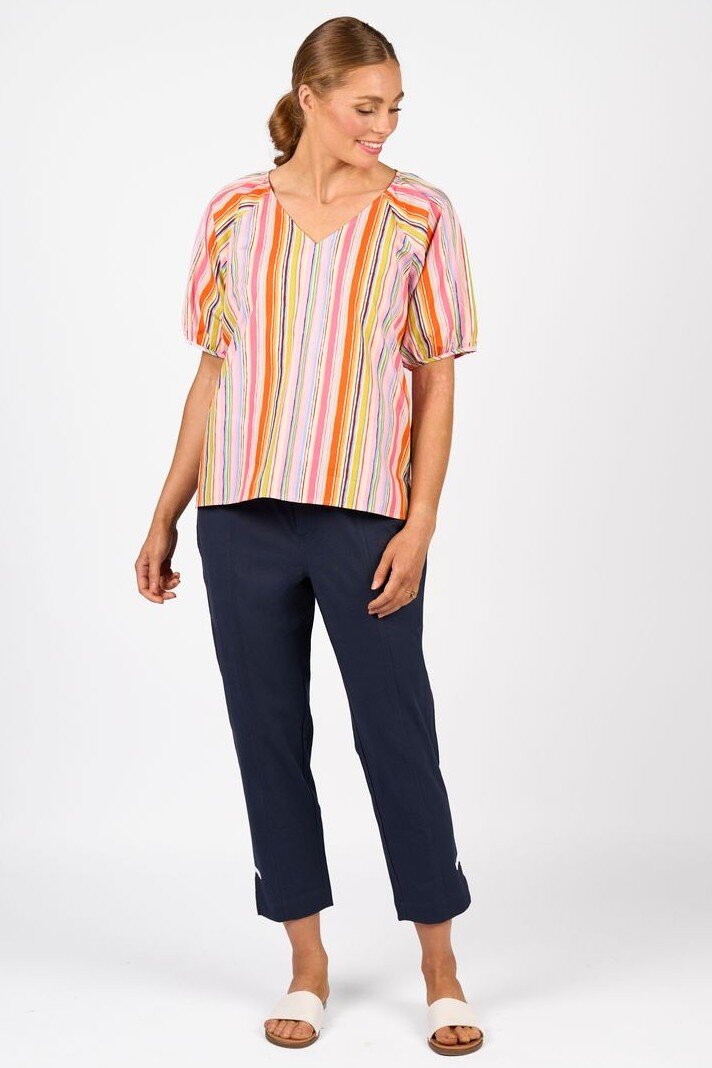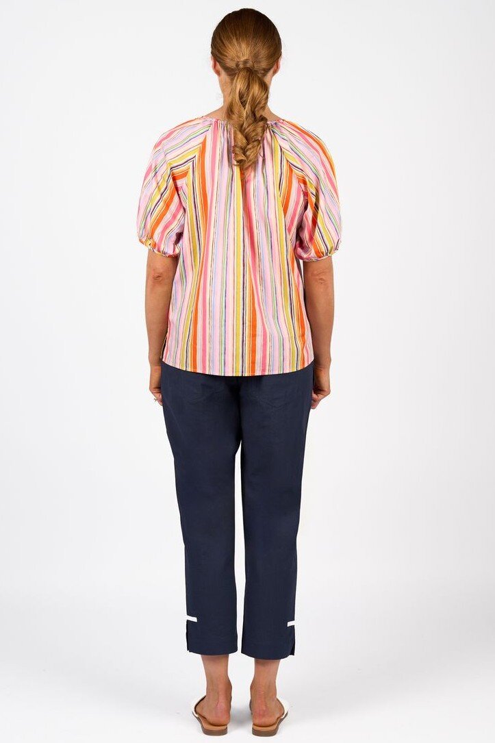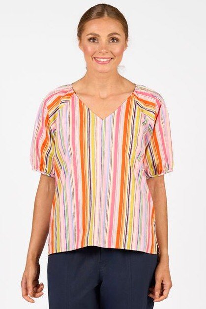 The Focus Top in Bonbon is a breezy summer staple, made from soft 100% cotton in vibrant stripes. With puffed raglan sleeves and a dipped back hem, it brings an easy sense of fun to warm weather dressing.