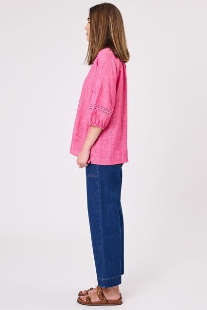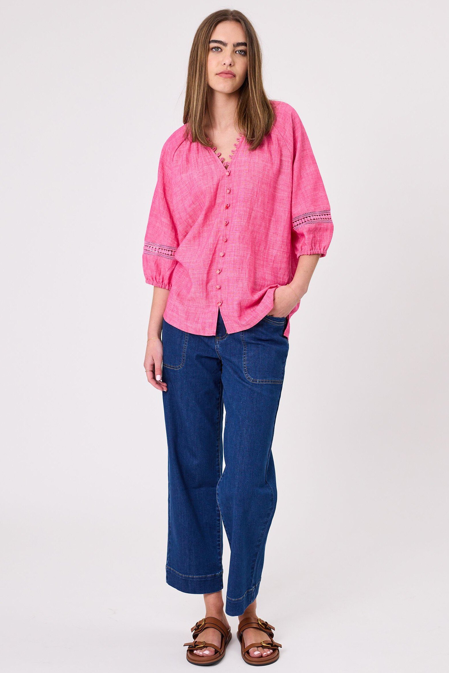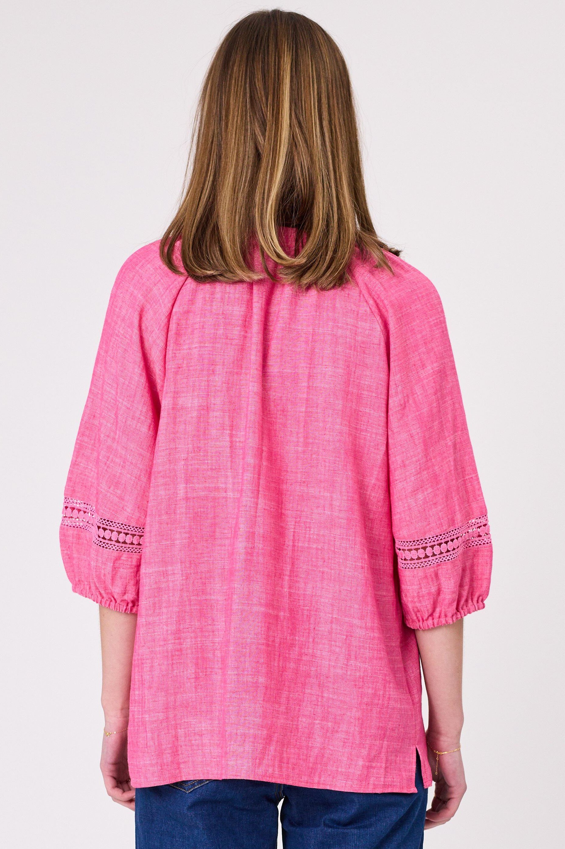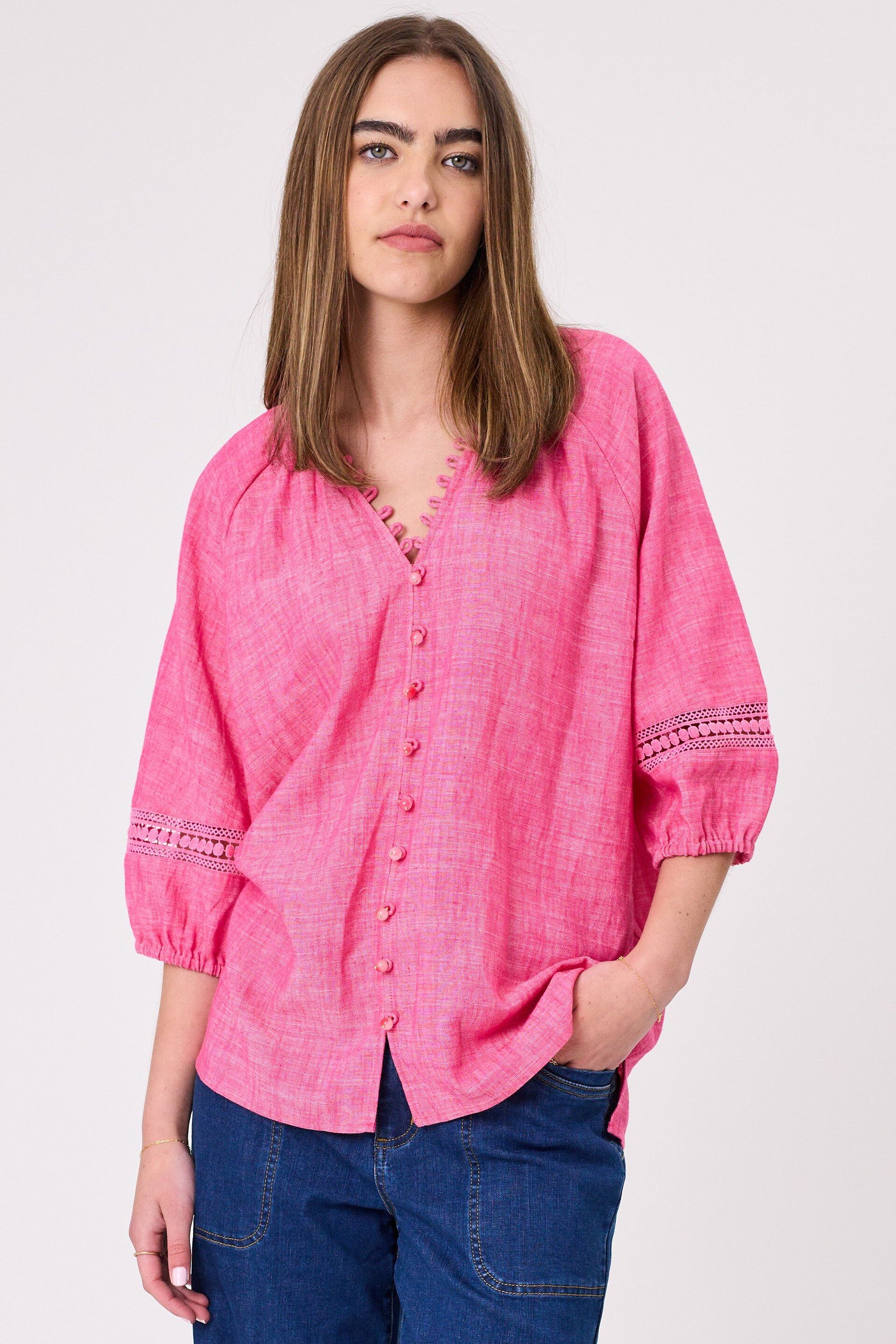 Bright pink linen cotton blend top. Raglan armhole with delicate lace around the sleeves. Full button opening at front placket with button loops detail.