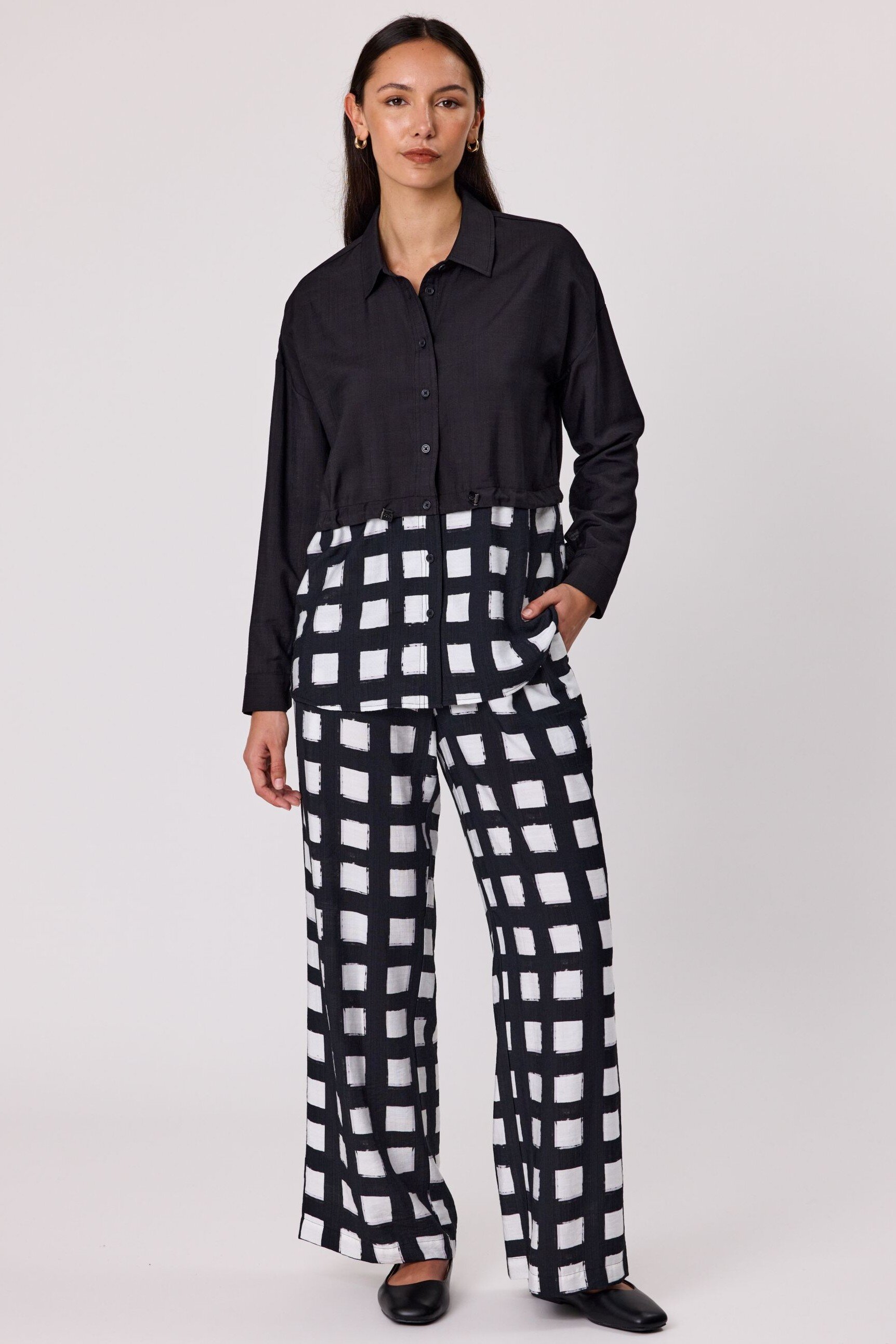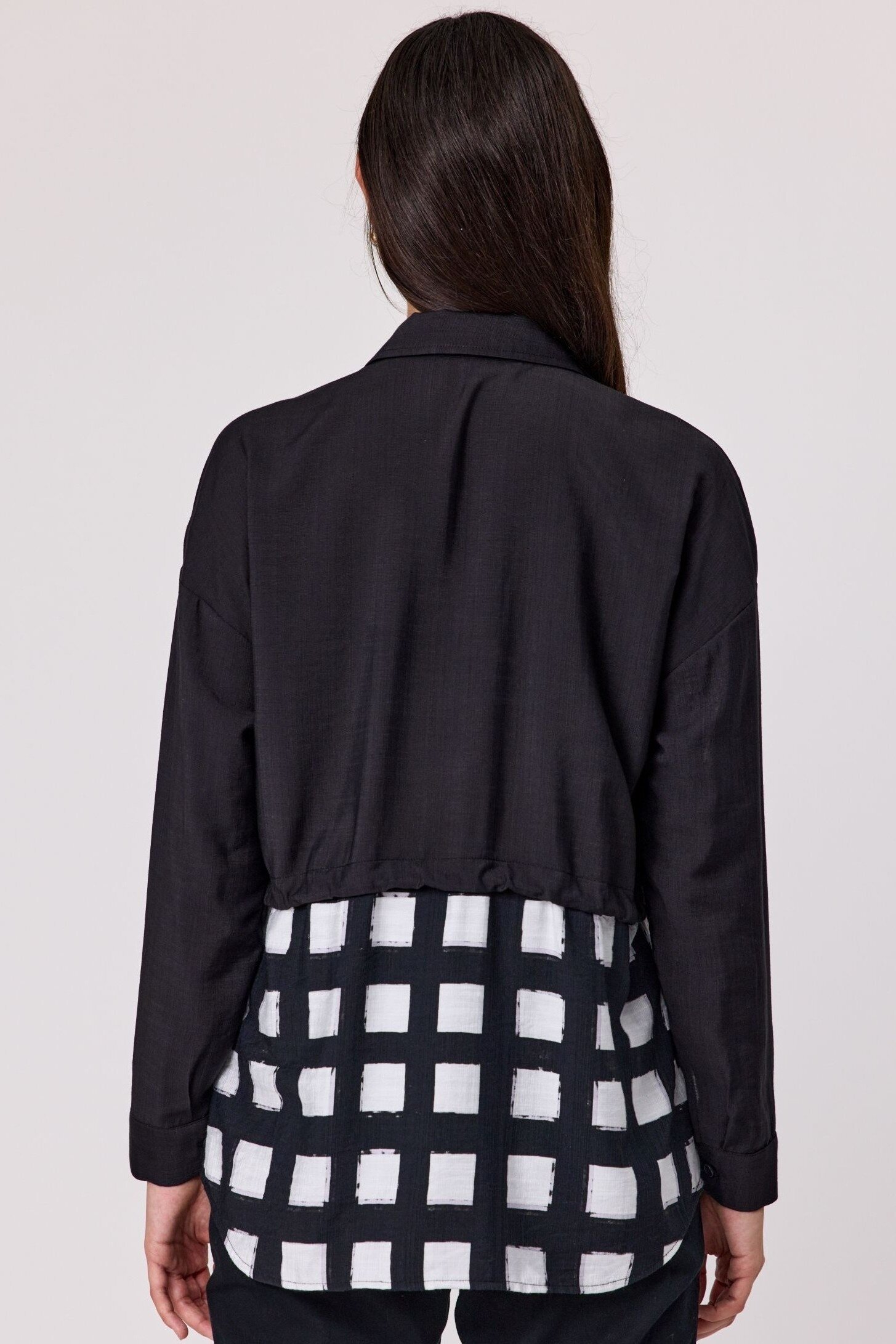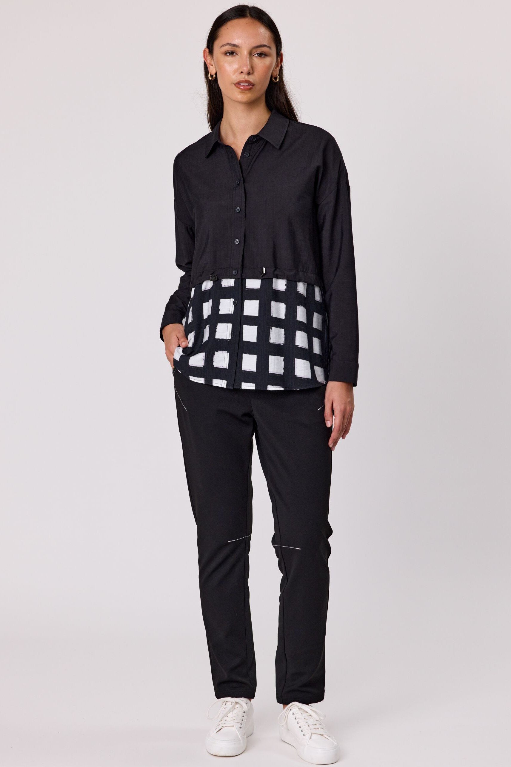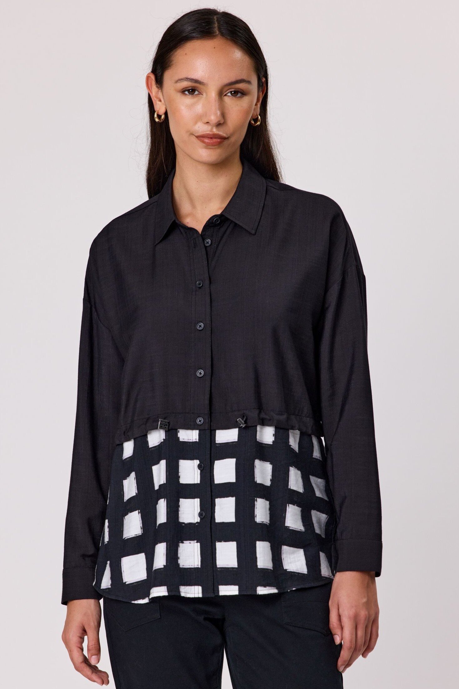Make a statement with this long-sleeved shirt featuring a classic collar, button-up front, and a bold two-tone design-solid black on top and a striking print below.