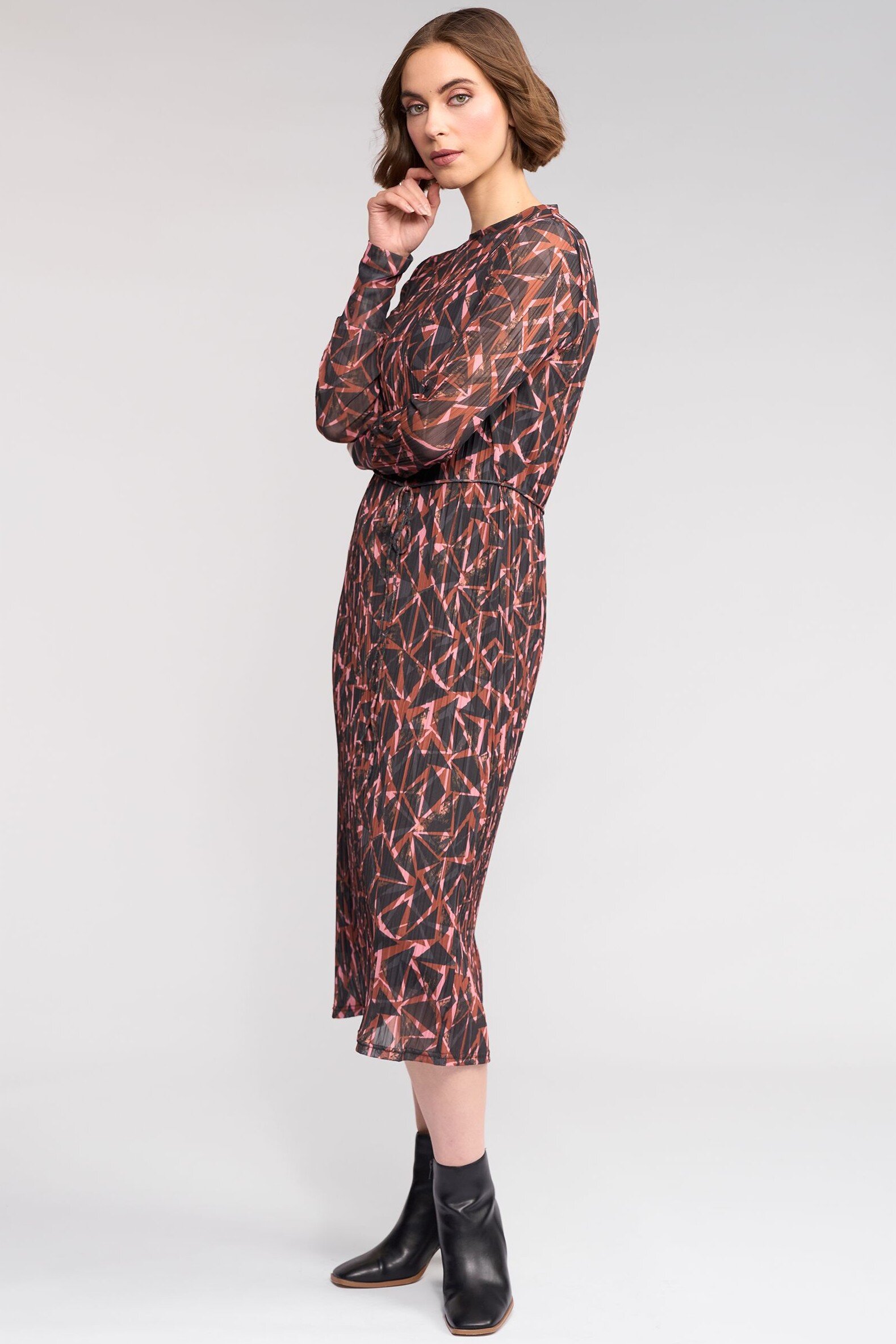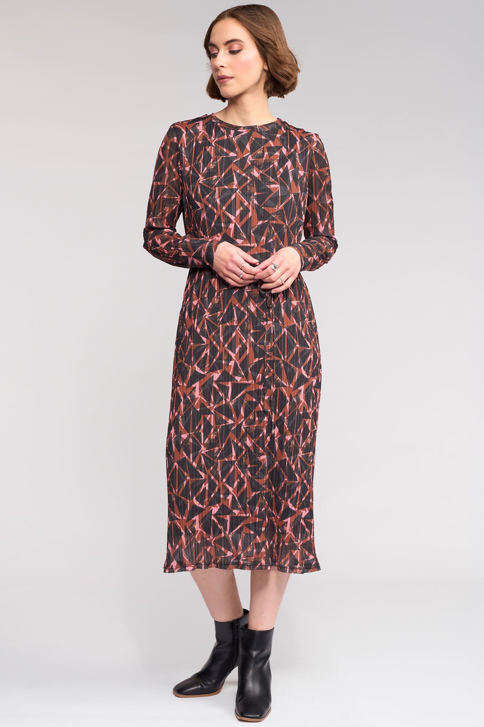 Long sleeve winter dress crafted from a stretchy crinkle mesh in the Dusk print, featuring a bronze base with black and soft pink geometric shapes. Designed with a slim fit silhouette, round neckline and a matching self fabric waist tie to define the waist, this dress offers an elevated yet effortless winter option.