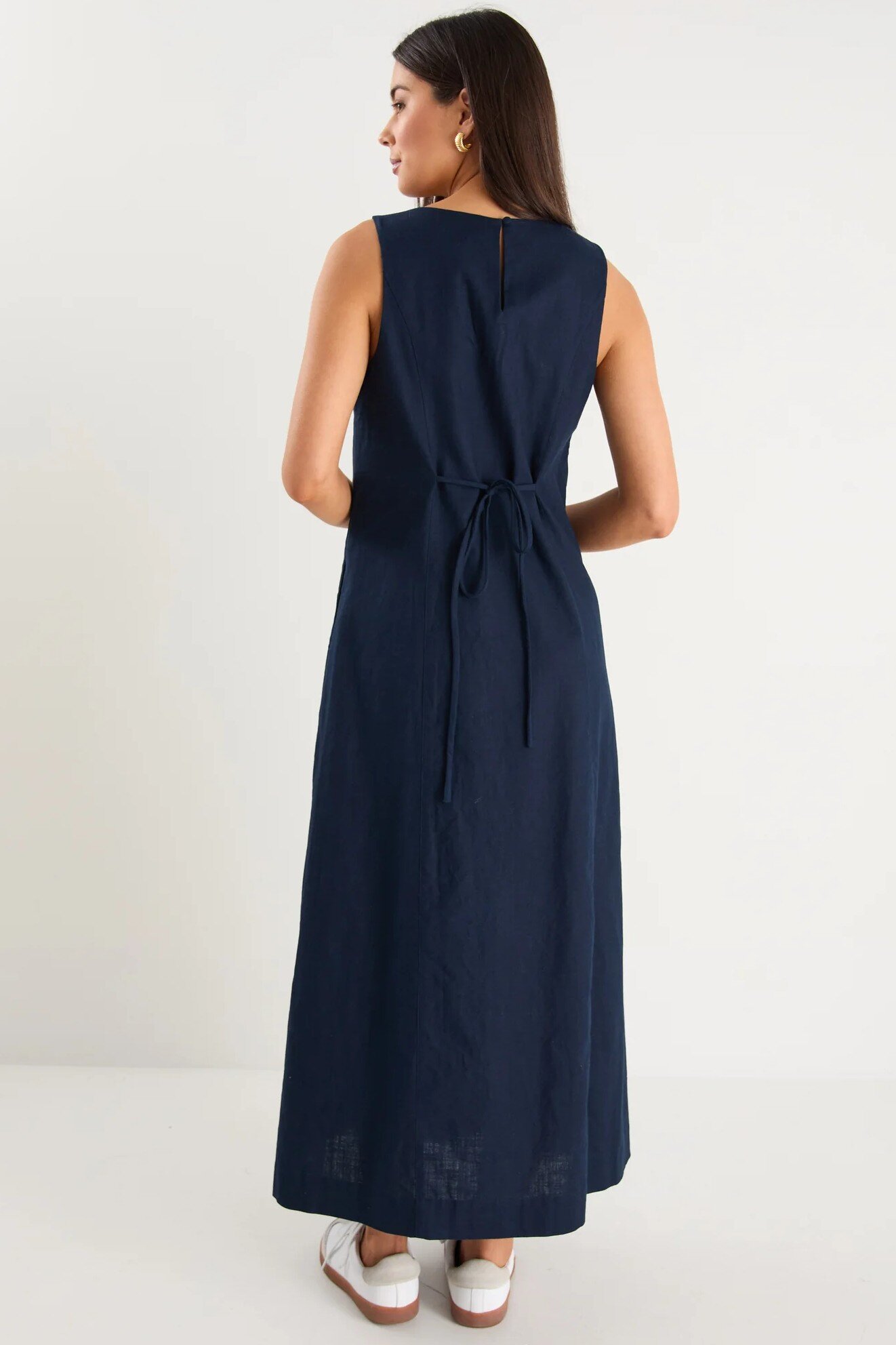 The Future Ink Midi Dress is a striking mix of simplicity and bold design. With its clean crew neckline and sleeveless cut, the silhouette is timeless, while the white side stripe gives it a modern, statement edge. Made from a linen blend, it drapes beautifully and feels light against the skin.