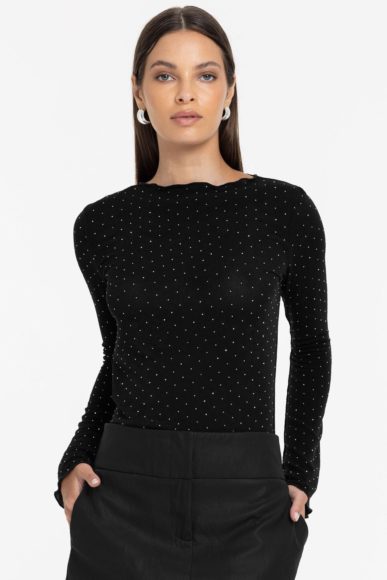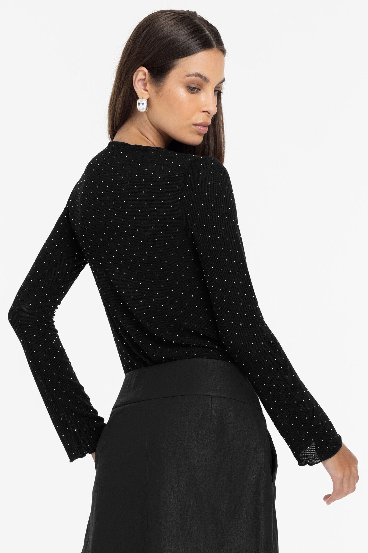 Romantic and effortlessly refined, the Gigi Top in Black with Silver Diamantes plays with transparency and texture. A sheer stretch mesh base is overlaid with soft flocked florals, creating depth and movement while remaining light against the skin. Equal parts delicate and confident, it’s designed to layer, reveal and elevate.