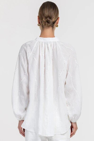 The Greta Blouse features a relaxed silhouette with gentle gathers through the neckline and back, creating a soft drape through the body. The sheer textured fabric is detailed with delicate raised detailing, adding subtle dimension throughout.
