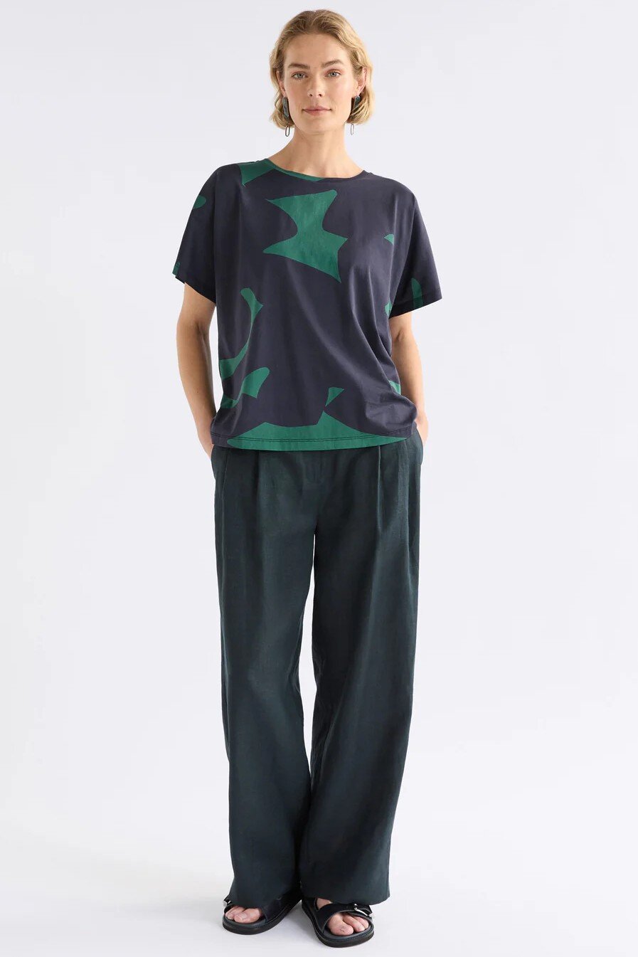 The Haki Short Sleeve Tshirt is a regular fit batwing t-shirt, available in the new seasonal Teal Tera Print. Crafted from buttery 100% soft, organic cotton jersey with some structure. This standard-length tee is perfect for tucking into jeans or tailored pants or wearing loose over shorts. This tee will be your new favourite slip-on-and-go piece. The print is yardage, therefore, print placement on each garment will vary.