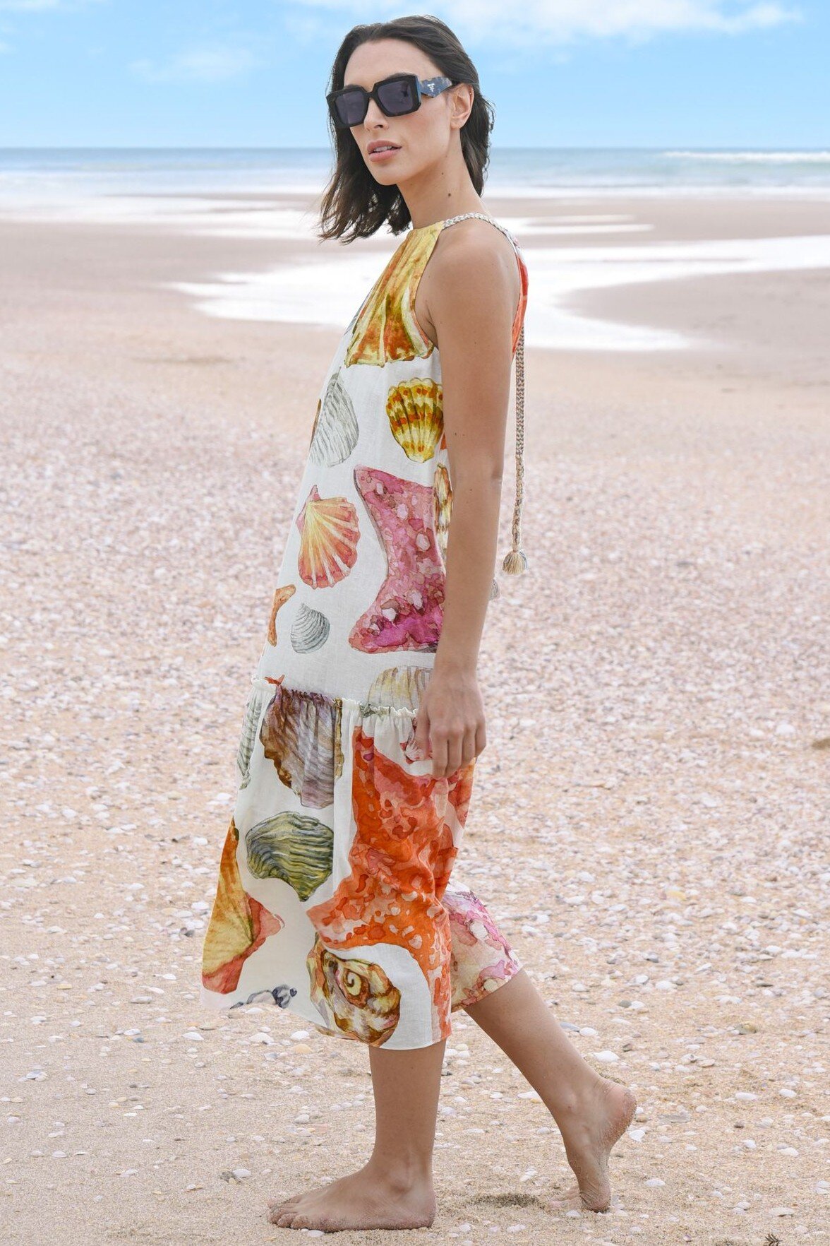 A laid-back piece with just enough edge to stand out, the ‘Happy Days’ dress is artistry and comfort combined with the ‘Shell Will Be Loved’ fabrication. With a fixed gathered neckline, notched back and braided tassel halter tie, it features a gathered hem tier allowing for elegant movement. A contemporary piece for fashion lovers, pair this with sandals or heels for a polished yet easy look.