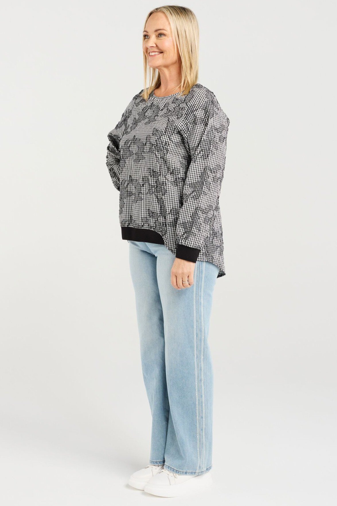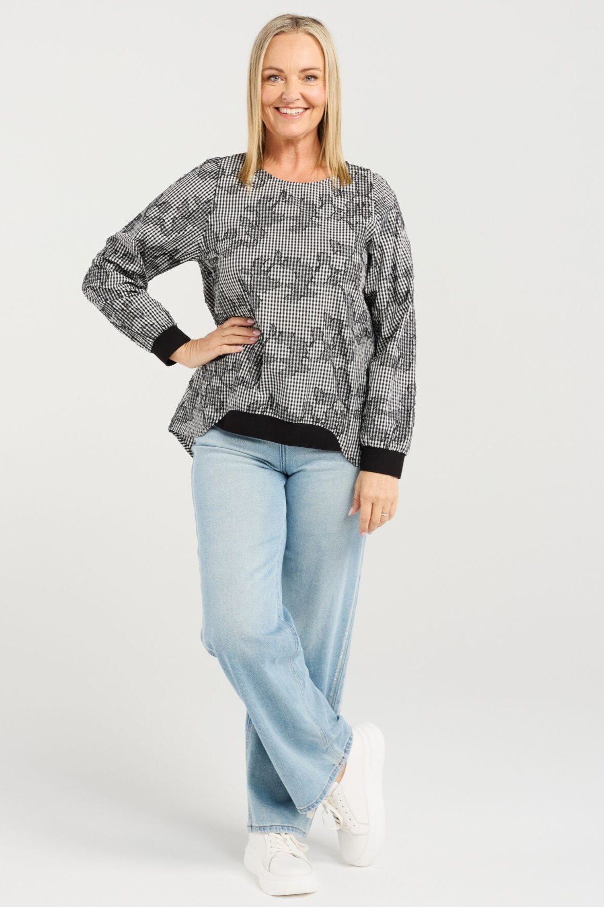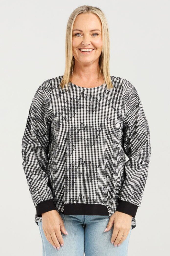 Our signature long sleeve top returns in a modern black and white check. Featuring ribbed, elasticated cuffs and a front hem for comfort and shape, it’s finished with a round neckline for an effortlessly classic look.