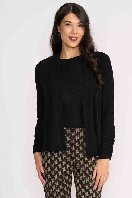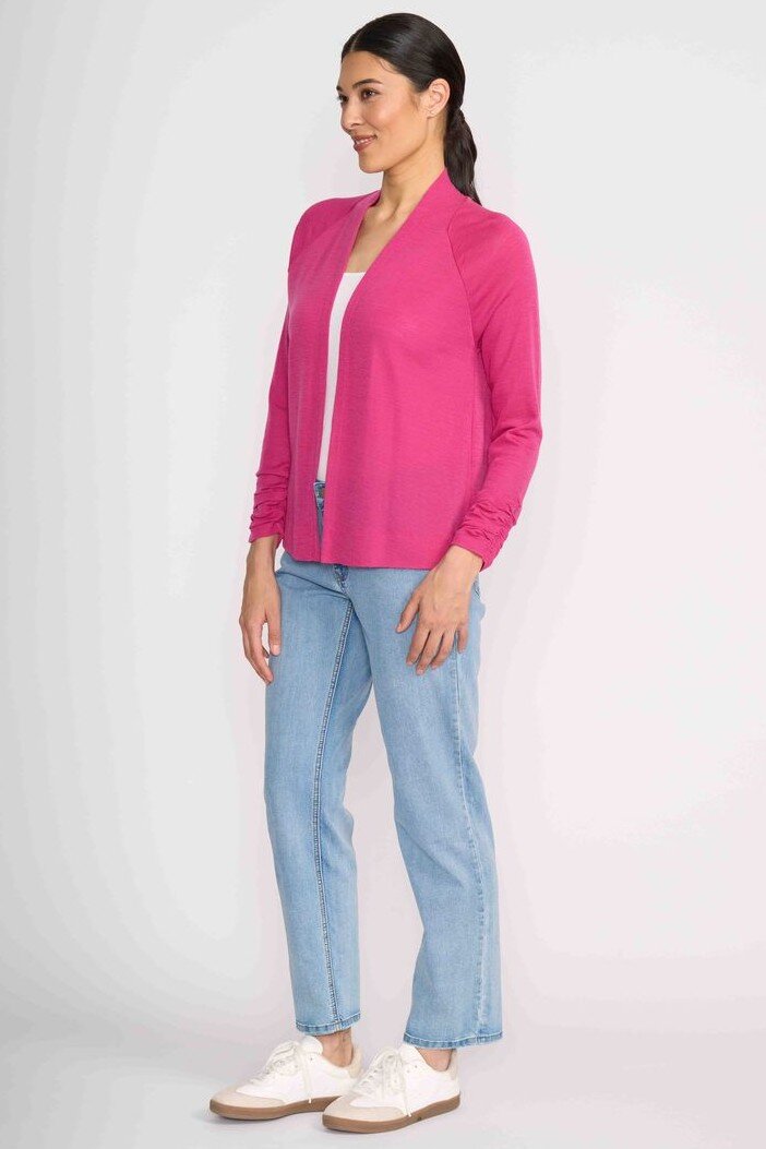 Merino light weight cardigan with Raglan sleeves gathered at the cuff.