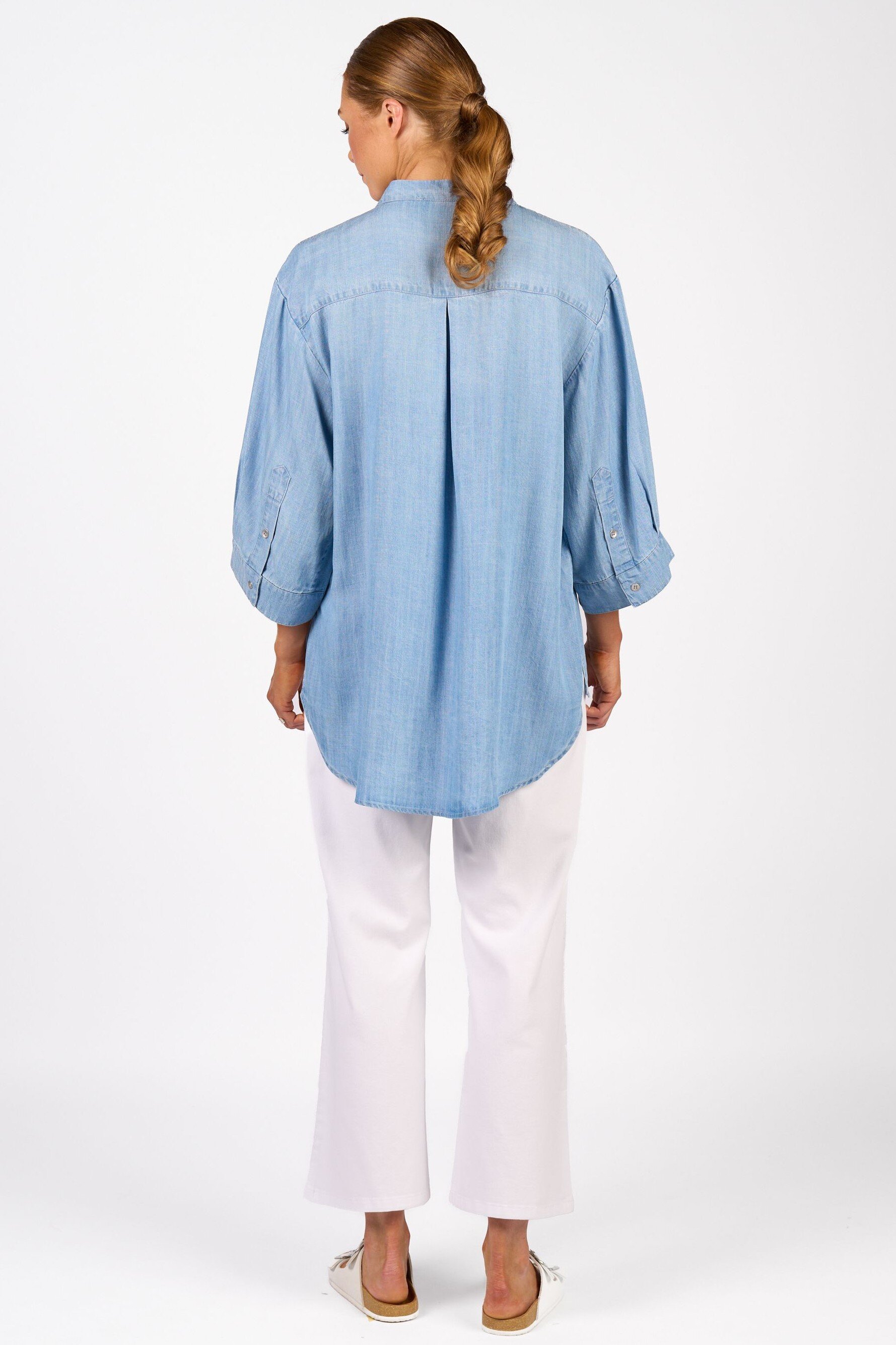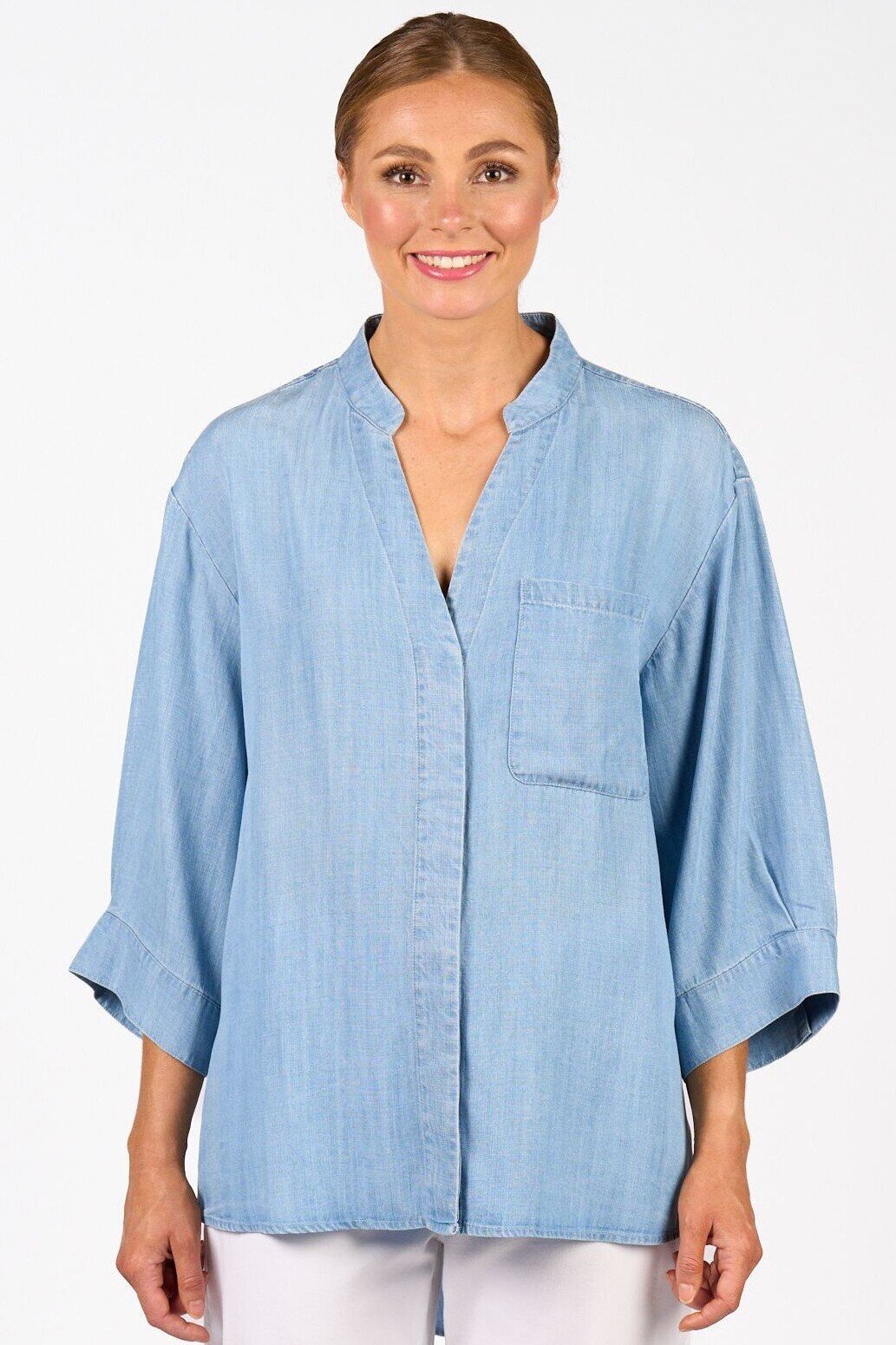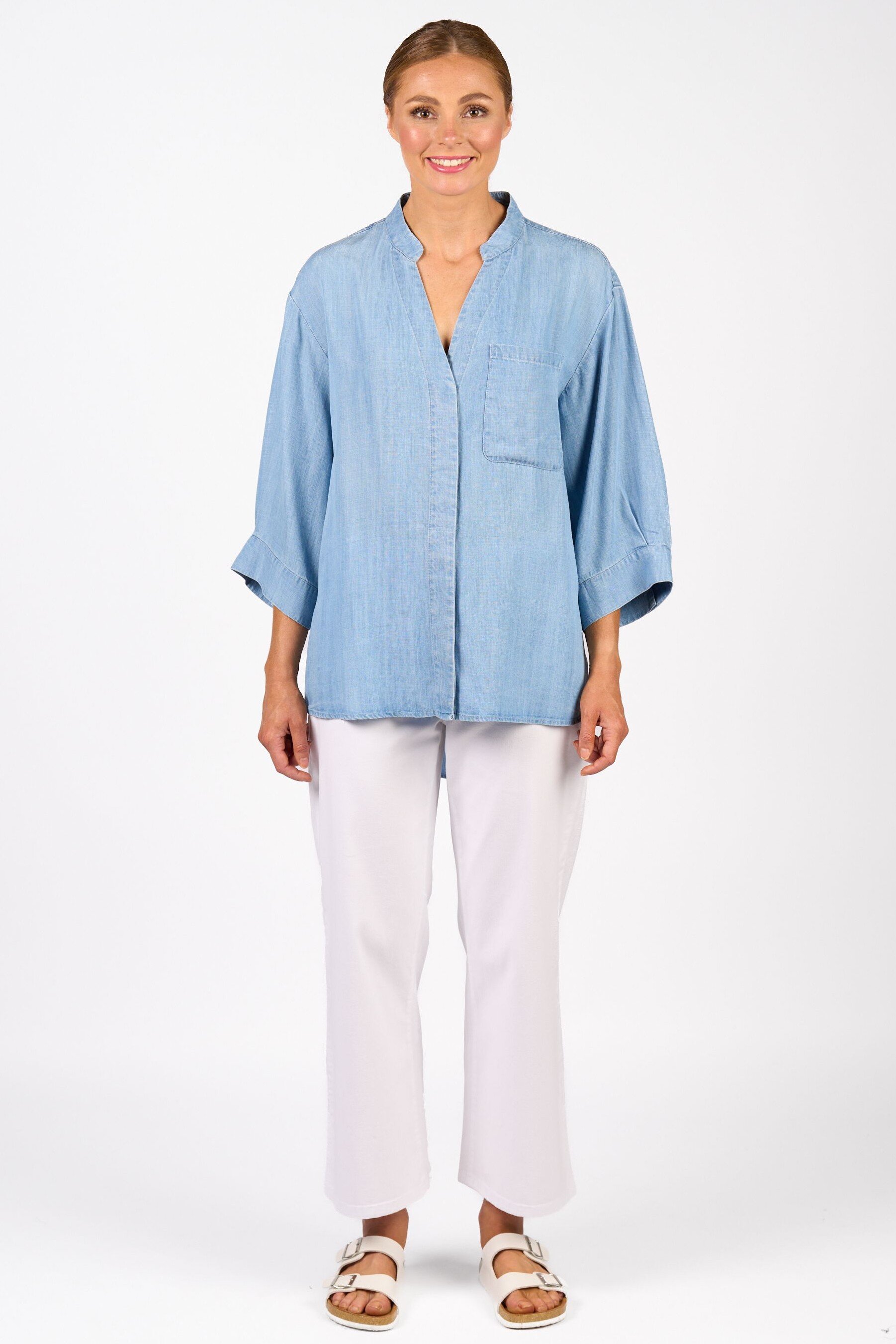 The Holiday Shirt is a loose-fitting summer essential made from lightweight Tencel fabric. It features a relaxed V-neck with a flat mandarin collar and 3/4 length sleeves with button cuffs. Designed for easy layering, its deep curved hem and side splits create effortless movement and breezy comfort.