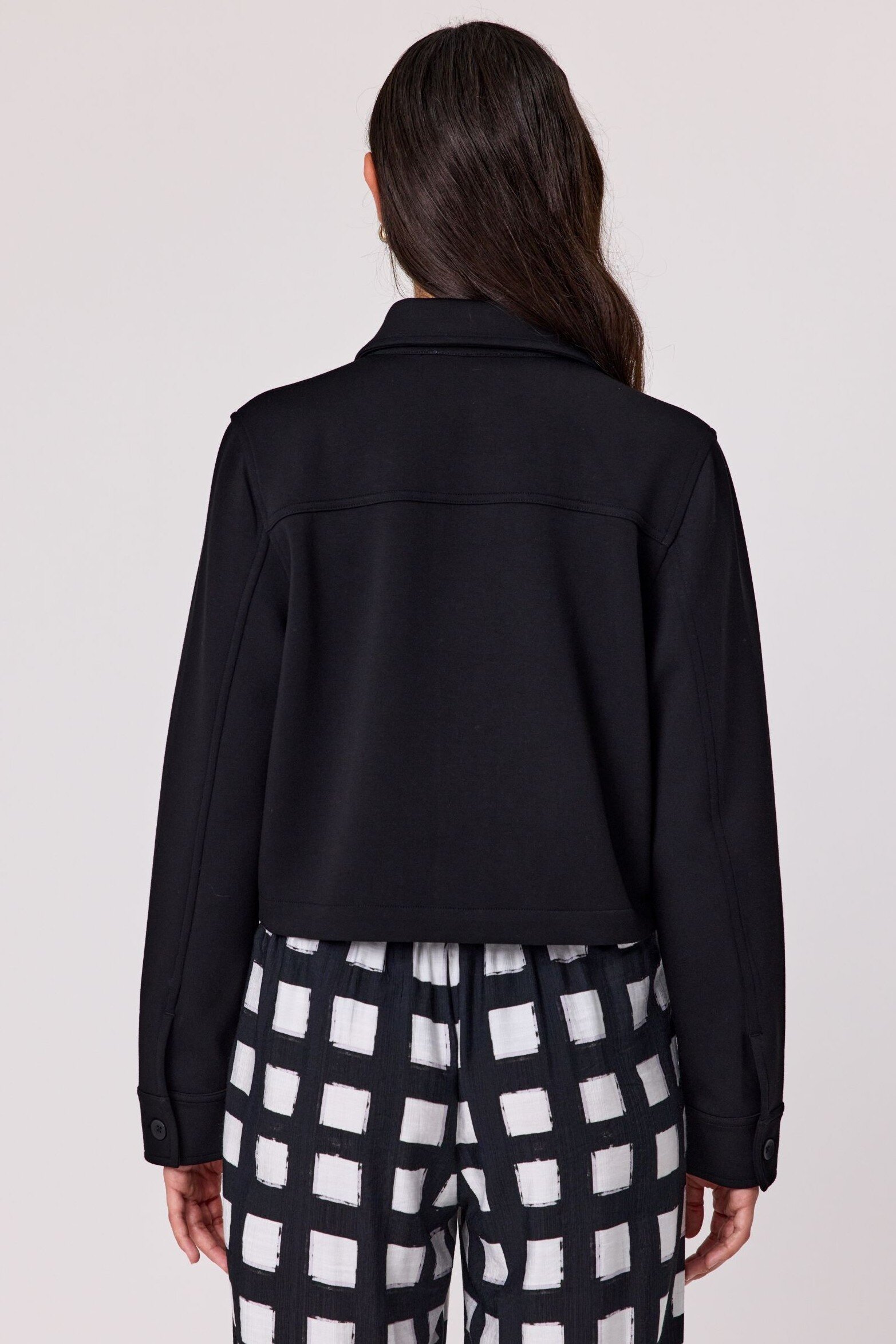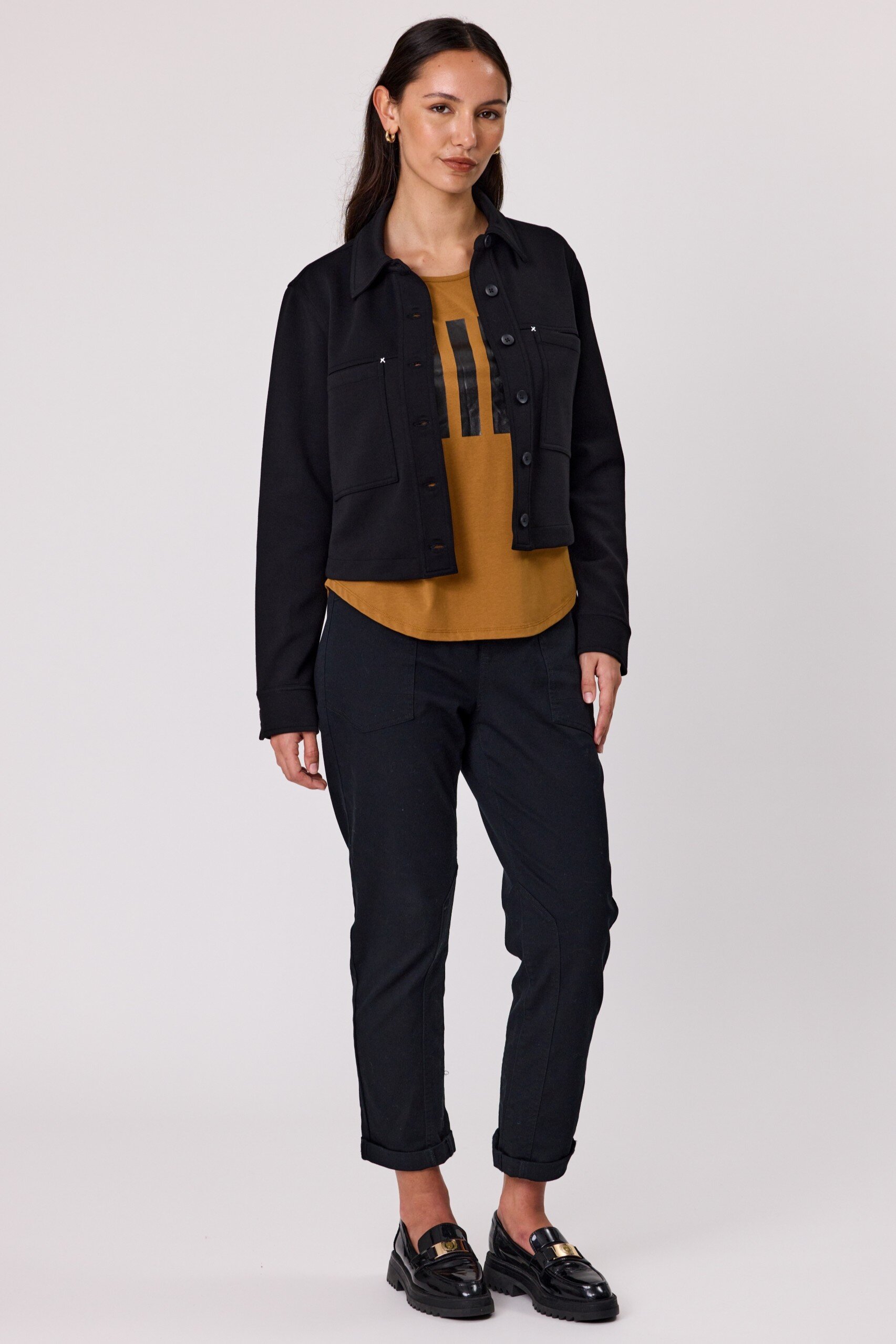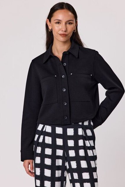 Add a cool edge to your outfit with this black cropped jacket, featuring long sleeves, front button closure, and chest pockets for a utility-inspired vibe.
