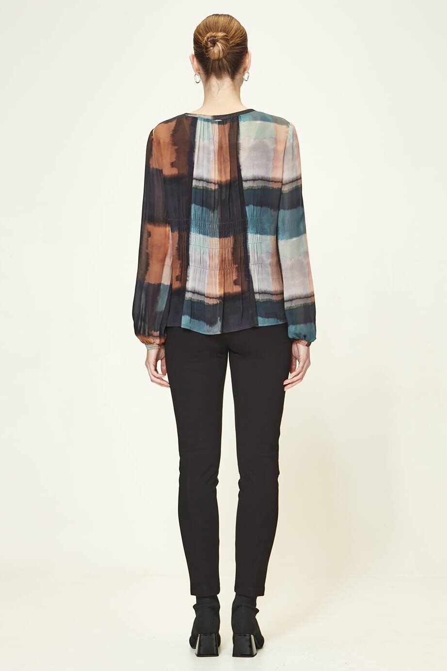 Stunning new Hype print shirt with button through front. Shirt collar. Button through. Back yoke detail. Soft gathered sleeve at shoulder falls to  bracelet length. Full sleeve with deep shirred cuff.  The Hype shirt falls to the top of the thigh.