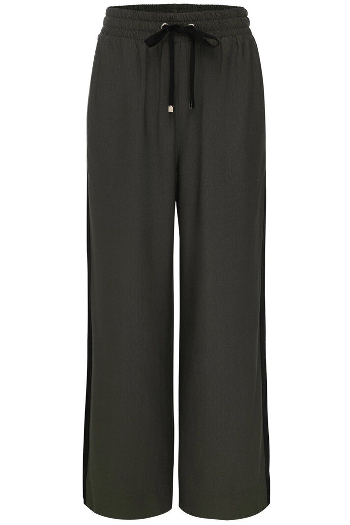 Crafted from a lightweight, breathable viscose-nylon blend, the Indiana Wide-Leg Pants offer a relaxed yet elevated look for any occasion. Designed for versatile wear, they feature sleek black contrast stripes down each leg and side splits at the hem, adding a modern touch to their flowing silhouette.