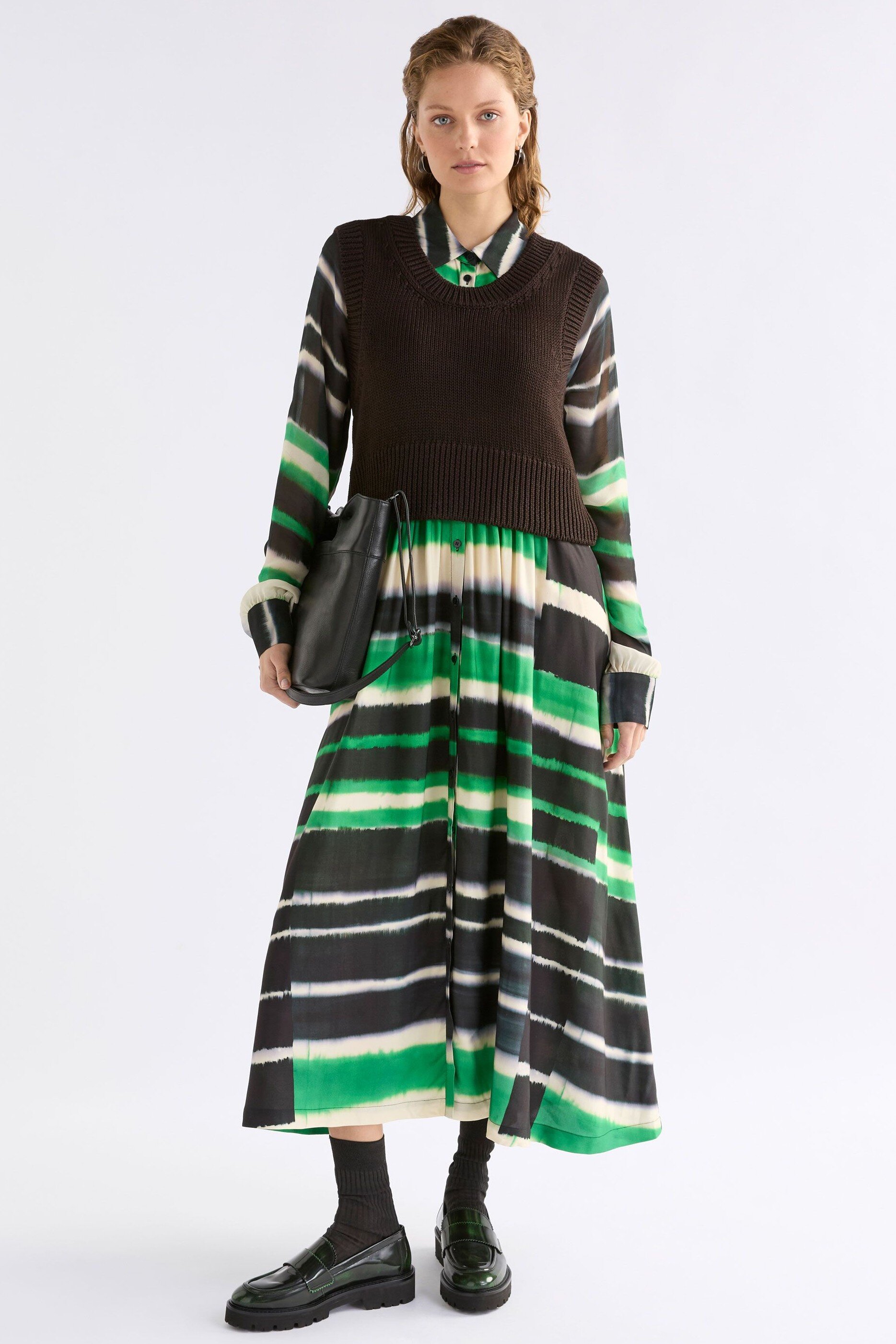 Make a statement in the Ines Dress, this midi-length, long sleeve shirt dress will add a striking pop of colour to your wardrobe with the vibrant and bold, tie-dye-look, Saillte Print of ink and verdant green. This regular fit dress has a classic shirt collar with button-through placket and features an opaque body with sheer long sleeves for a subtle refined contrast. The waist seam with gathers at the front and back creates gentle volume flowing into a full skirt. This playful dress will take you from day events and into the evening with a simple change of accessories. Pair with heeled boots and metallic silver jewellery for day-to-evening looks.