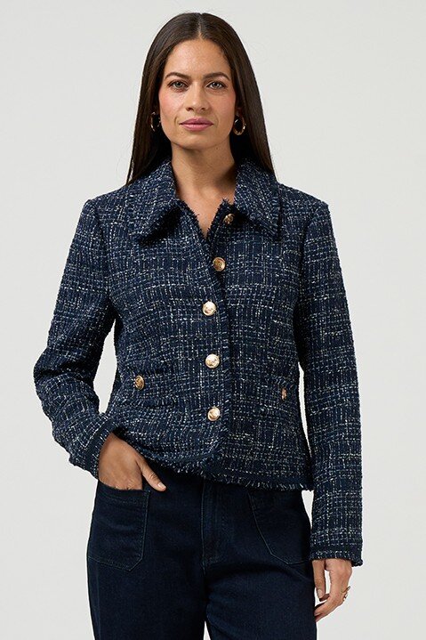 Fitted bouclé short-line jacket with a structured collar, princess panel seams, and patch pockets. Featuring frayed edges, tonal braid trimming, and soft matte gold shank buttons. Fully lined.