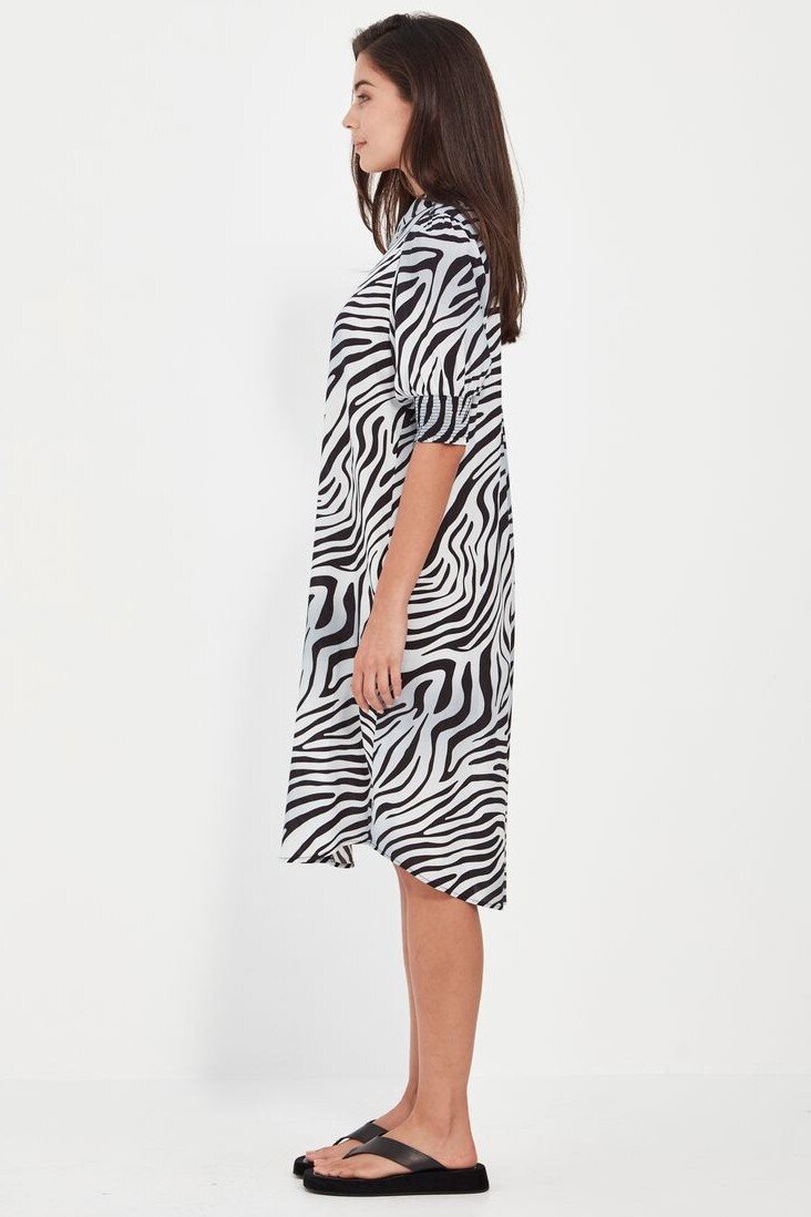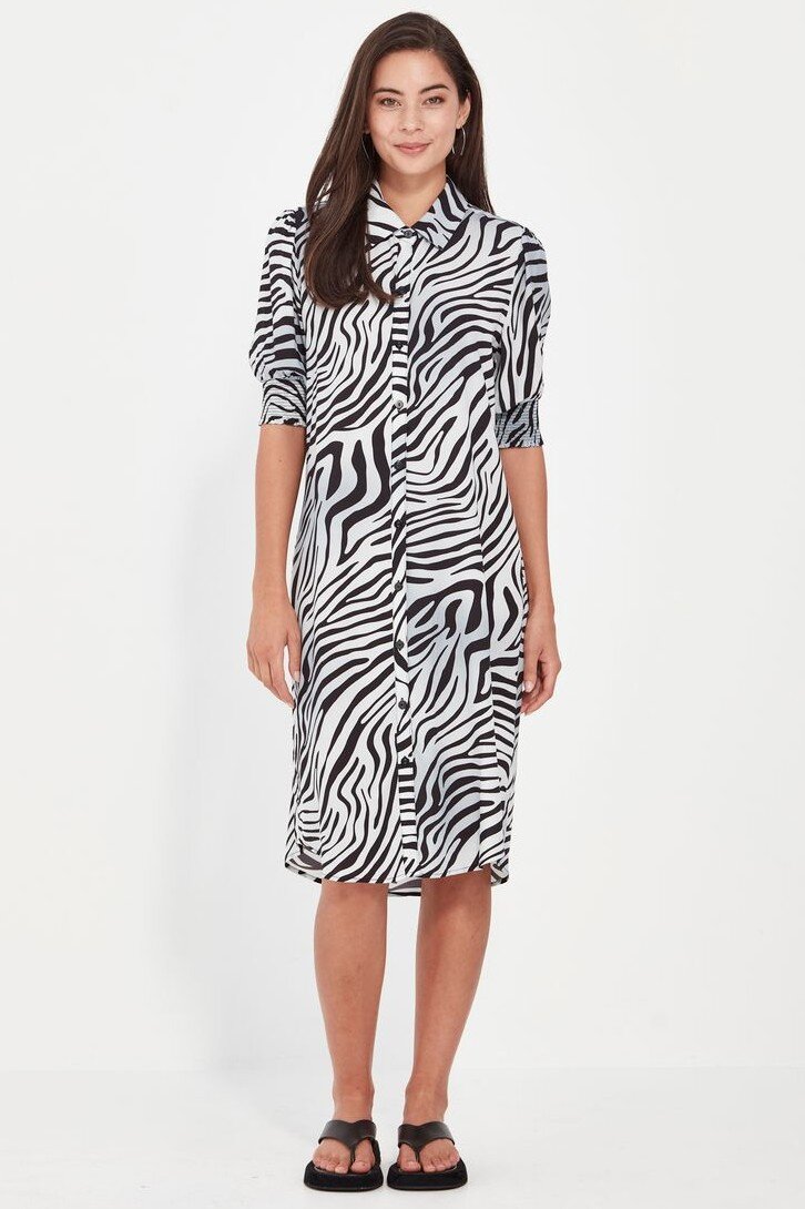 Made from breezy rayon in an exclusive Verge print, the Julia Dress features a straight-cut silhouette that skims the body. A classic shirt collar and button-through front offer everyday ease, while shirred cuffs add soft structure to the elbow-length sleeves. Finished with a curved hem that falls to the knee for a flattering, effortless look.