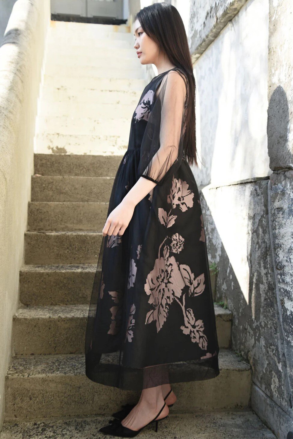 A study in layered beauty, where structure meets softness and elegance unfolds in two chapters. Designed with a dual-structure silhouette, the 'Last Glam Standing' dress pairs an opulent 'Enter the Bloom' yarn-dyed jacquard dress, complete with a fitted bodice and panelled skirt, with a sheer mesh overlay that brings an airy, romantic contrast. The overlay floats with 3/4 sleeves, elasticated cuffs, a gathered waist, and a keyhole back tied with a delicate bow.