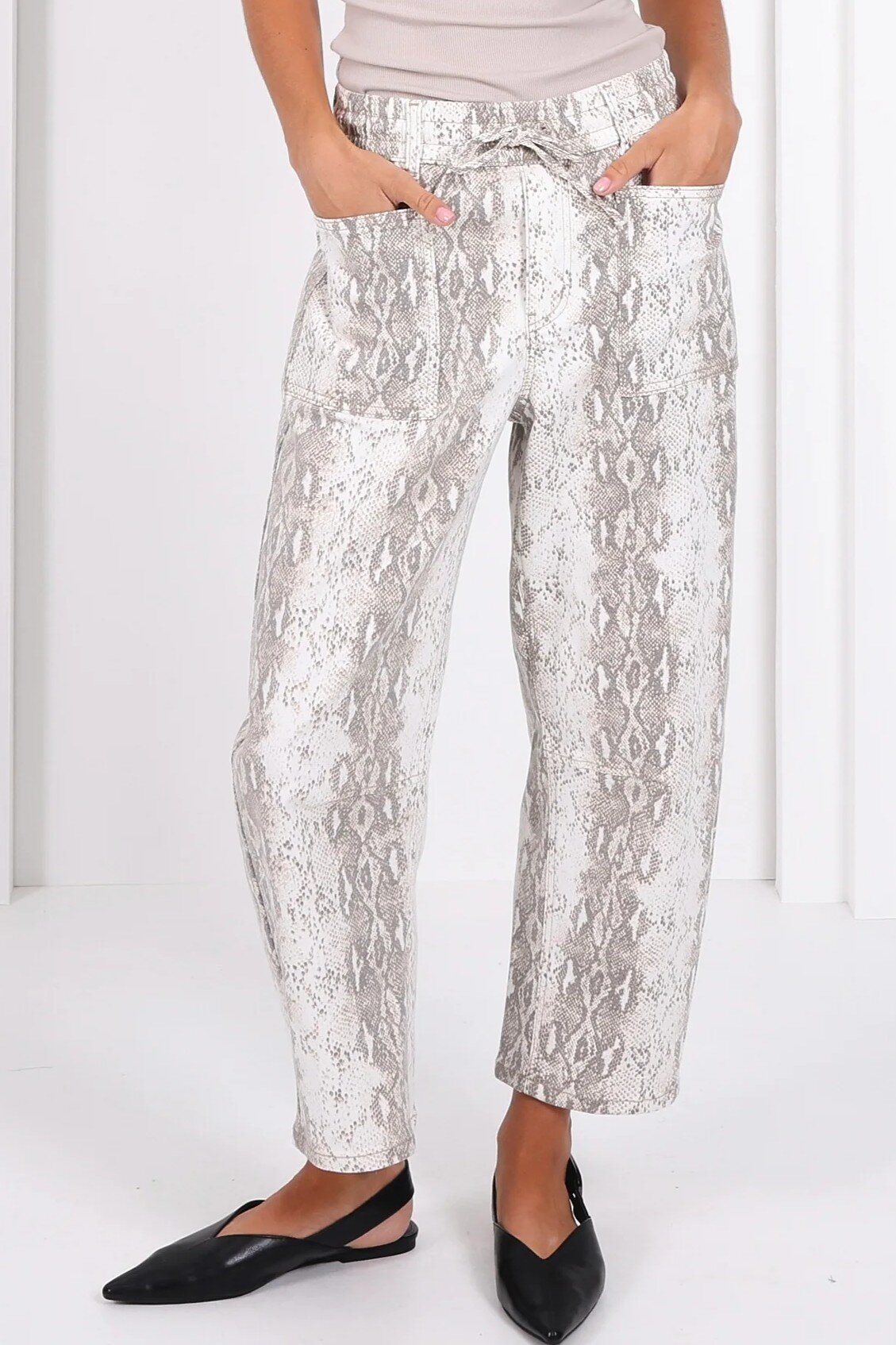 On-trend barrel jeans crafted from beautiful, soft denim fabric with a subtle snakeskin print.