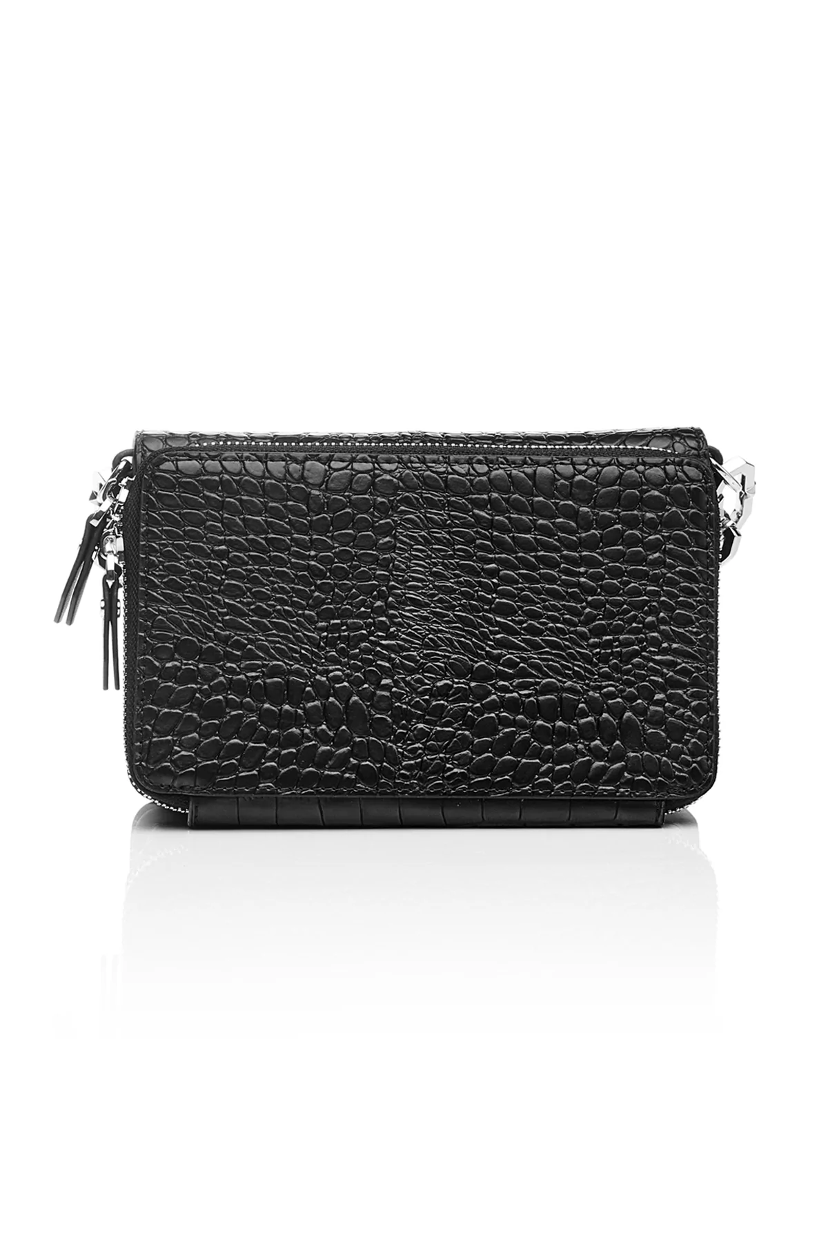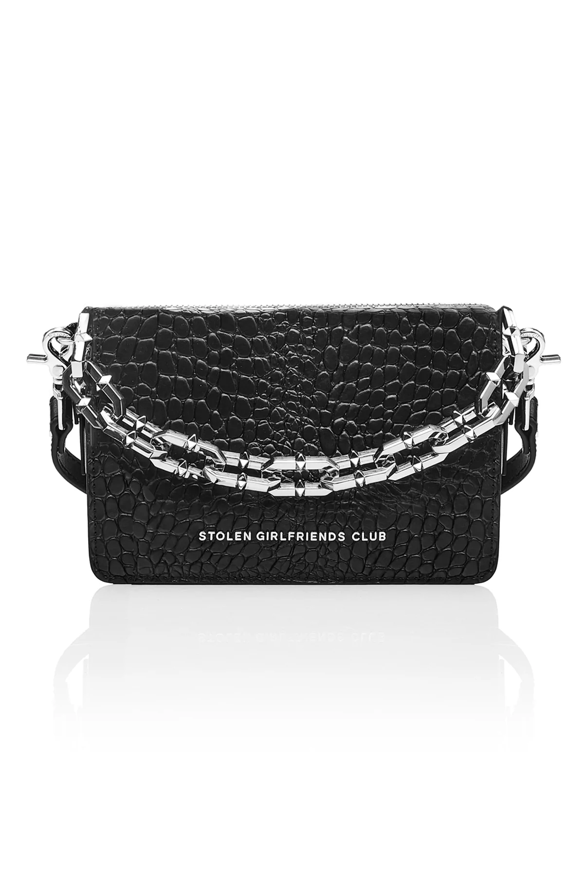 Taken from classic bourgeois silhouettes of the 60’s and given a rock n roll reinvention, Stolen Girlfriends Club introduce the Little Trouble Bag in an updated matte black colourway. Designed with sharp corners, cleaner lines, and angular features, this style has more structure and feels almost architectural. Beautifully crafted in rich crocodile-effect texture, this has modernized matte leather and chunky detailed hardware. Fitted with internal cardholders and two sleek zip closure compartments to keep all your essentials safe.