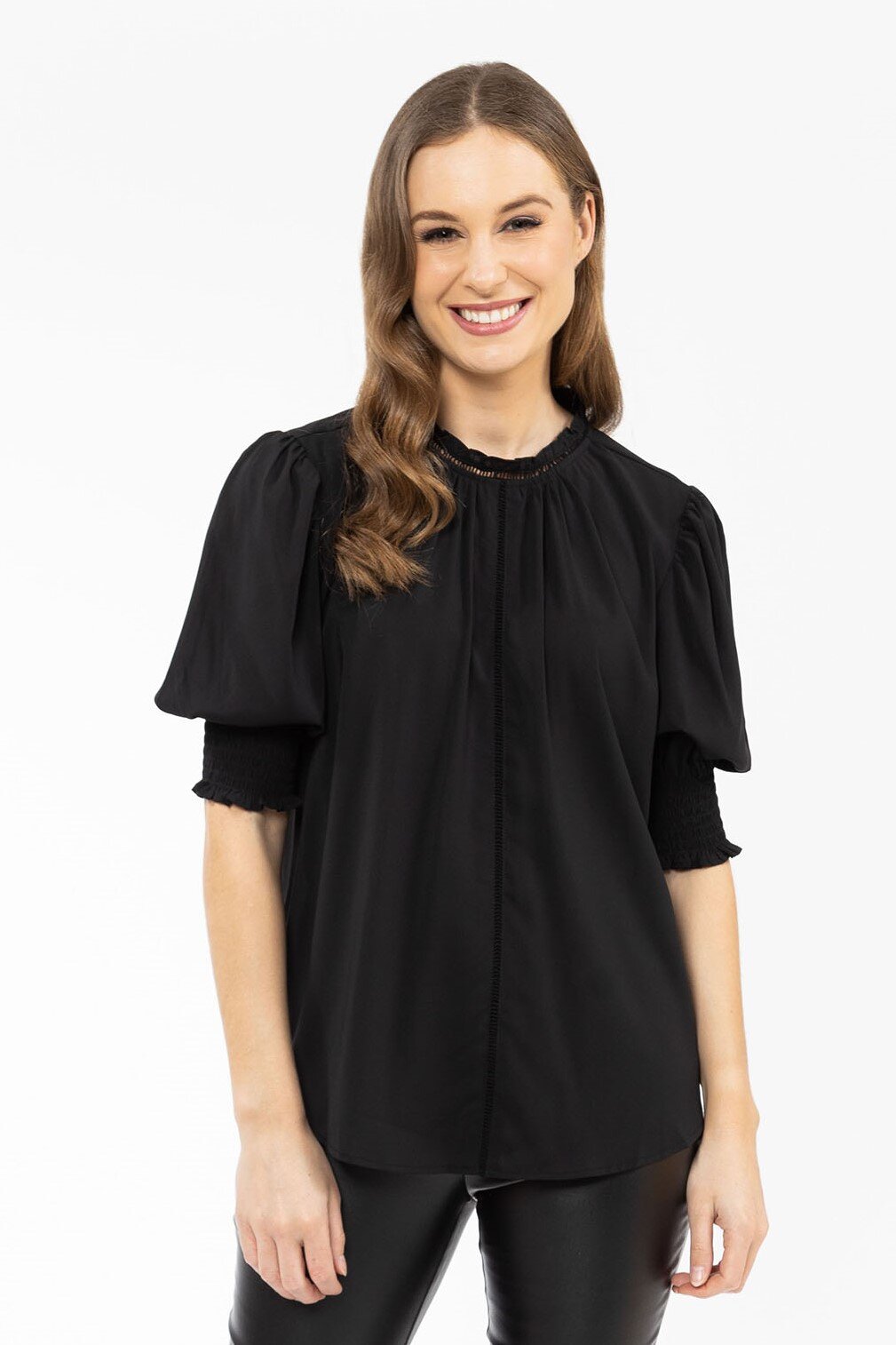 The Love Story top by Seeking Lola can be easily dressed up or down. Featuring a gathered neckline, button fastening at neck, shirred cuffs with a volume sleeve and scoop hemline.