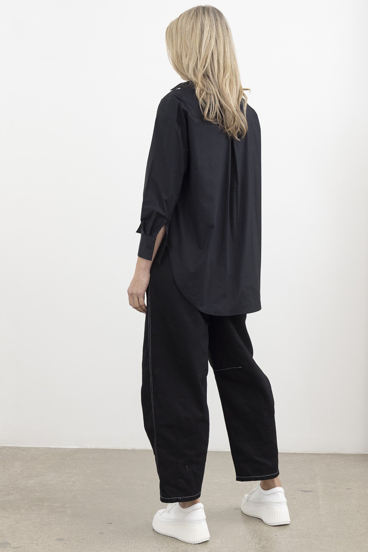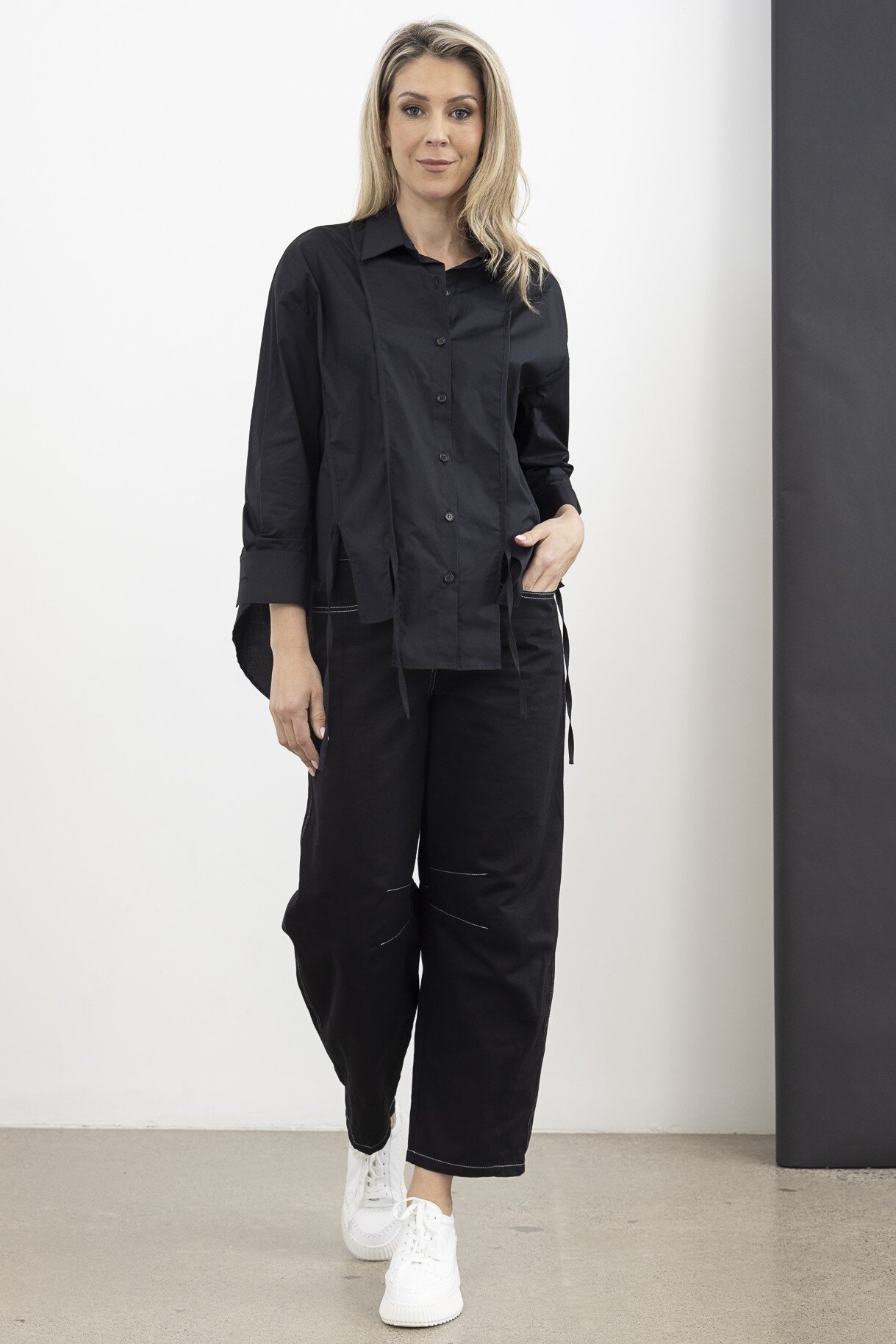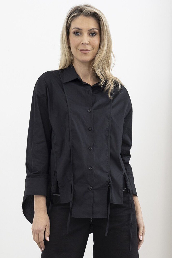The Lucid Layer Shirt is a modern twist on a classic button-up, featuring an oversized fit 3/4 sleeve asymmetric hem, and elongated tie details for added movement. Crisp and contemporary, this statement piece effortlessly balances structure and fluidity.