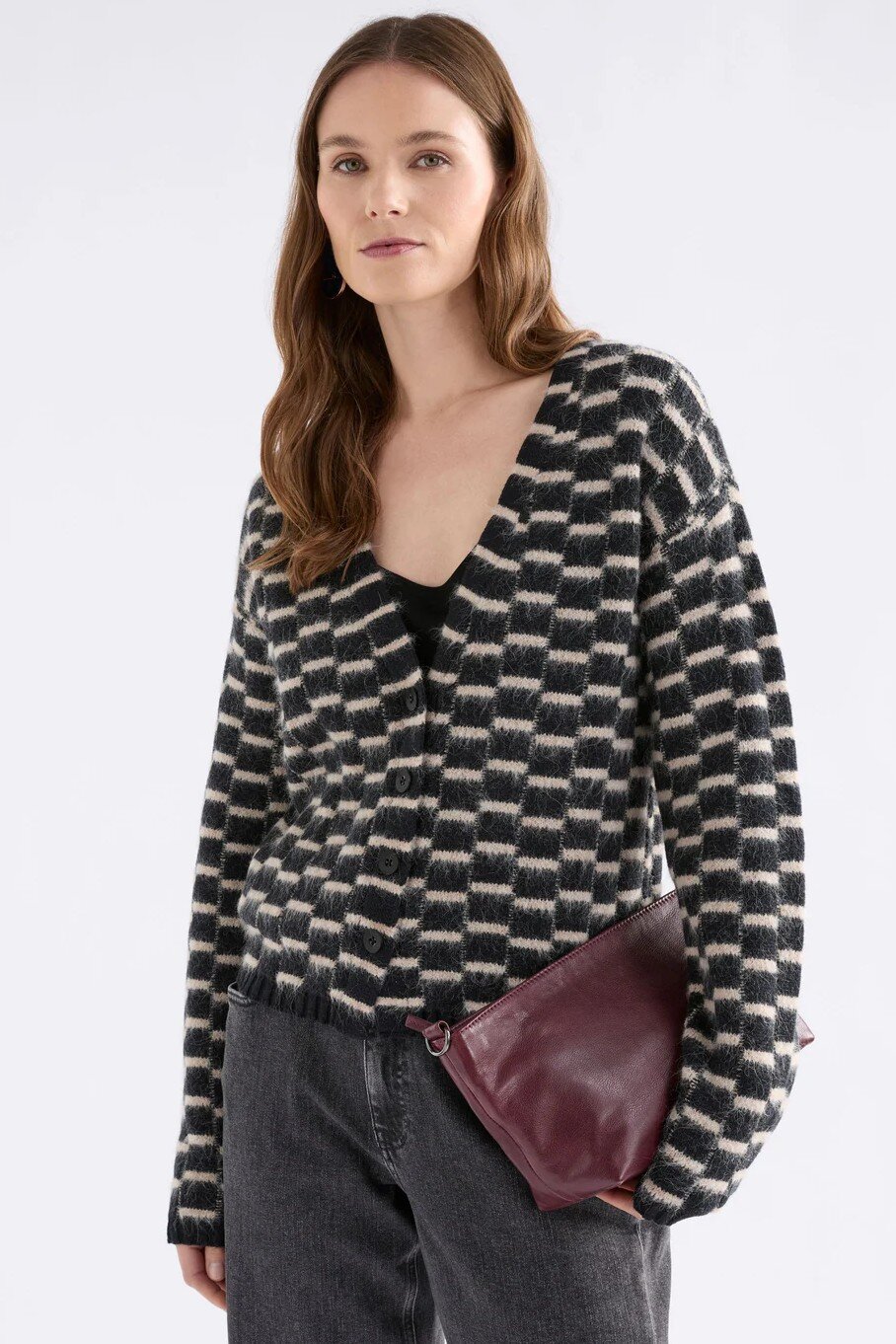 The Lunz Cardi is a striking soft, cosy knit crafted from an organic cotton, with wool, alpaca blend. This regular fit cardigan features distinctive checker-pattern design, a flattering V-neckline and natural Corozo nut button placket. The long sleeves with slightly dropped shoulders and comfortable fit create an easy, relaxed silhouette. A versatile layering piece for trans-seasonal to cool weather dressing, pair with dresses or trousers for relaxed yet refined everyday styling.