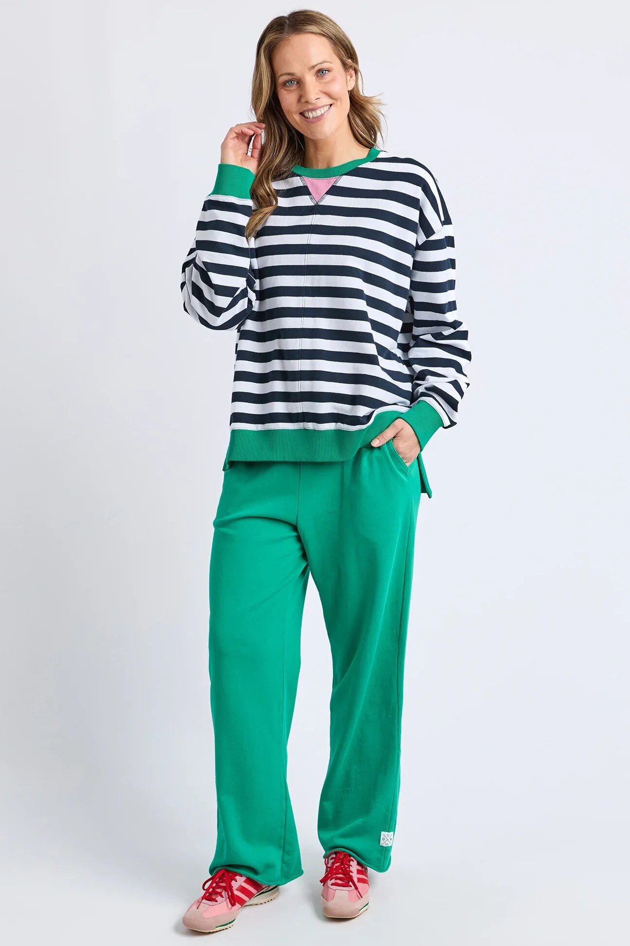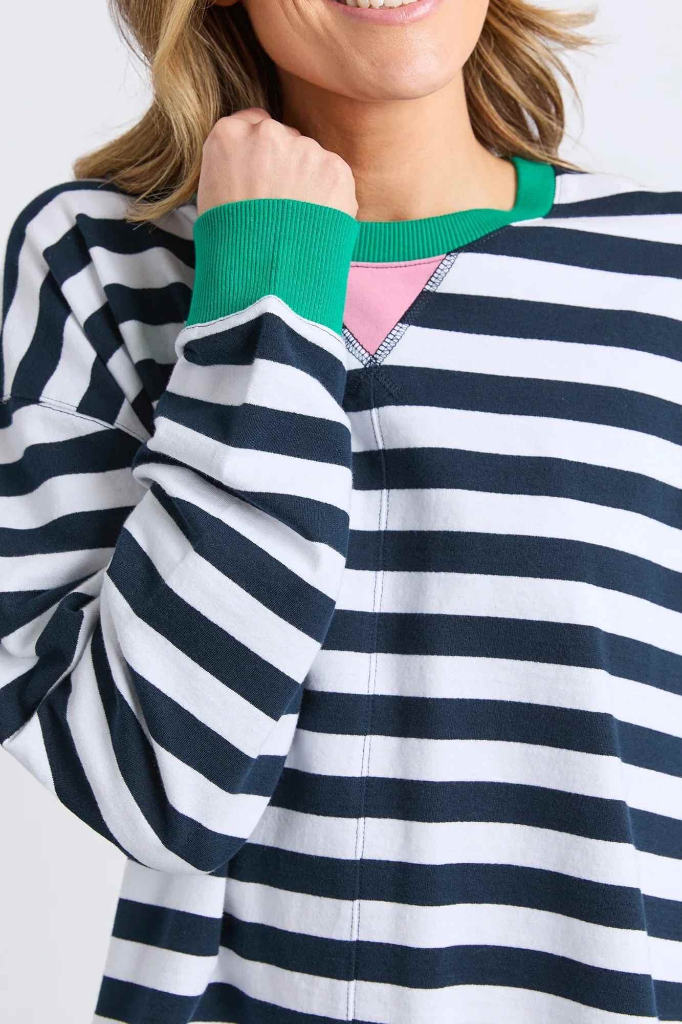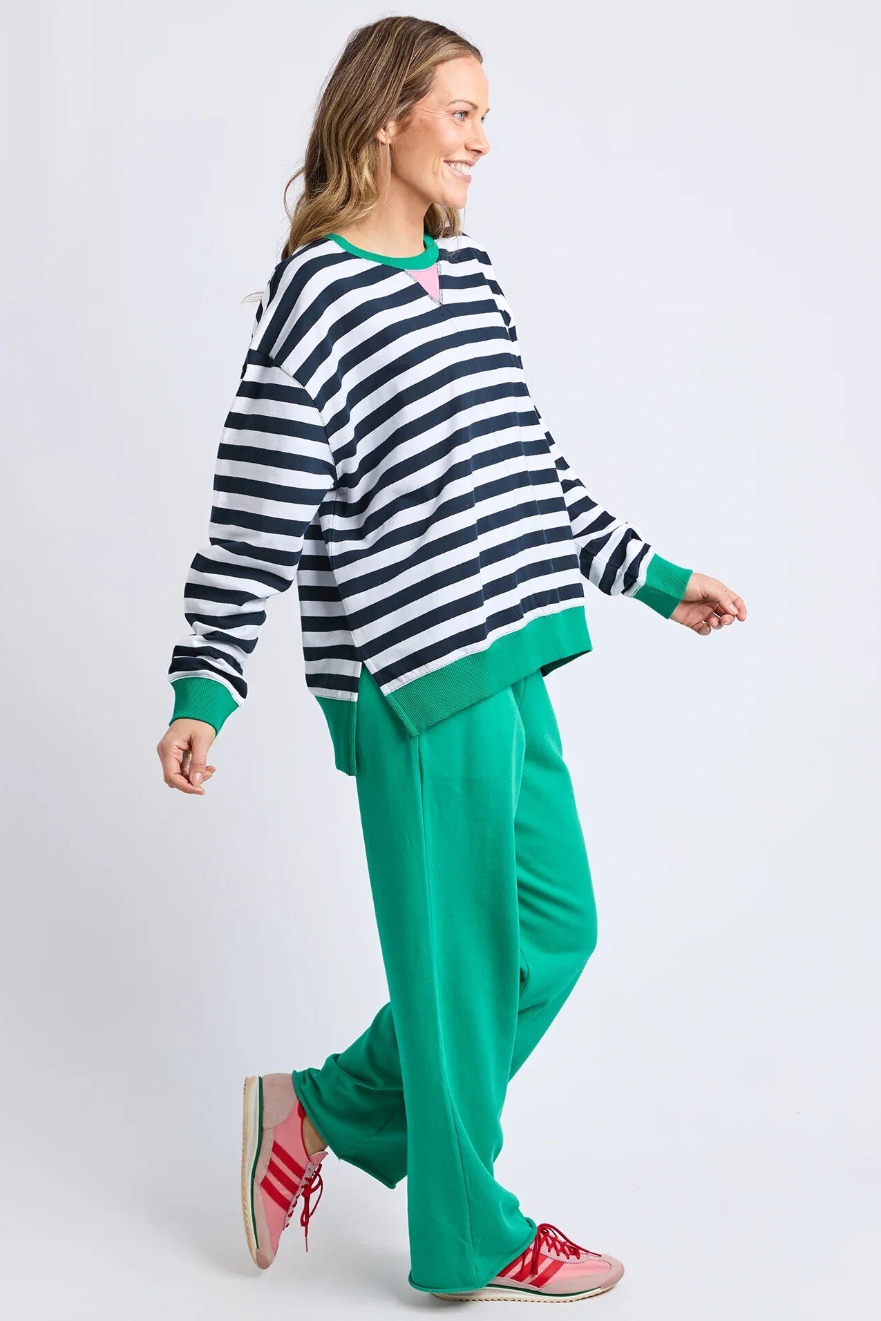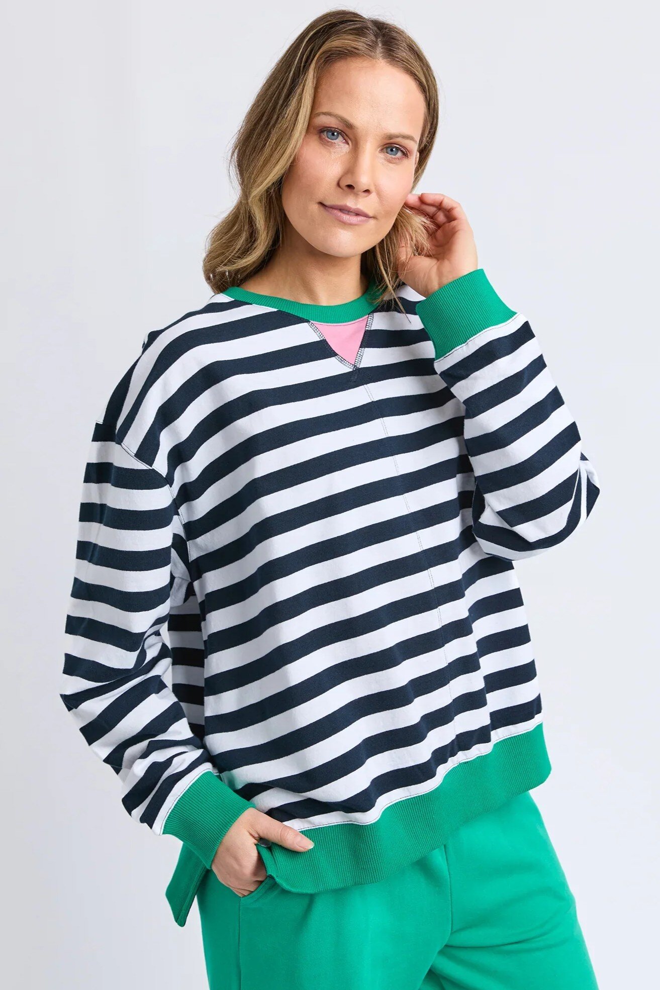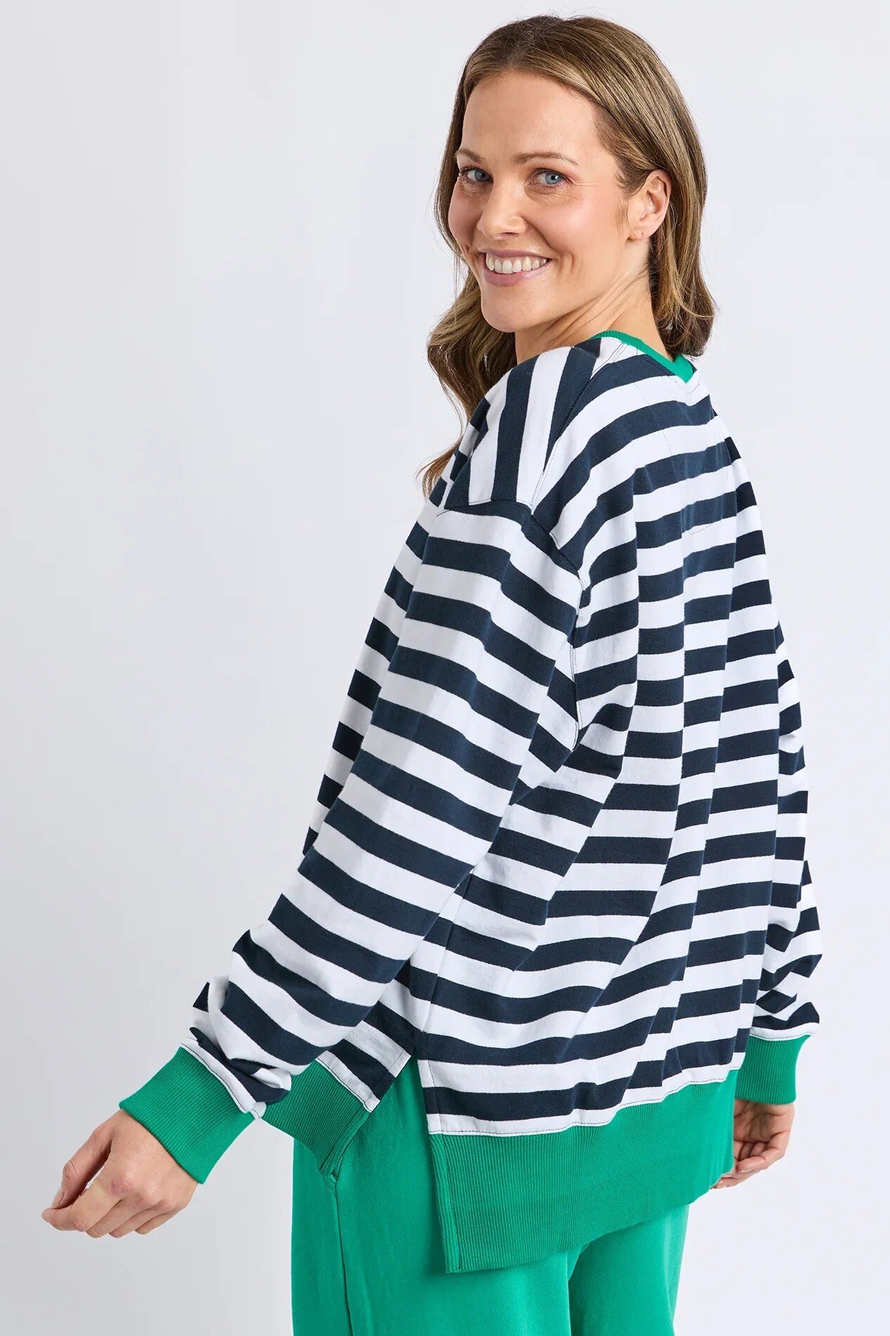 The Elm Maps Crew is a relaxed, oversized layer featuring yarn-dyed stripes and contrast rib detailing.