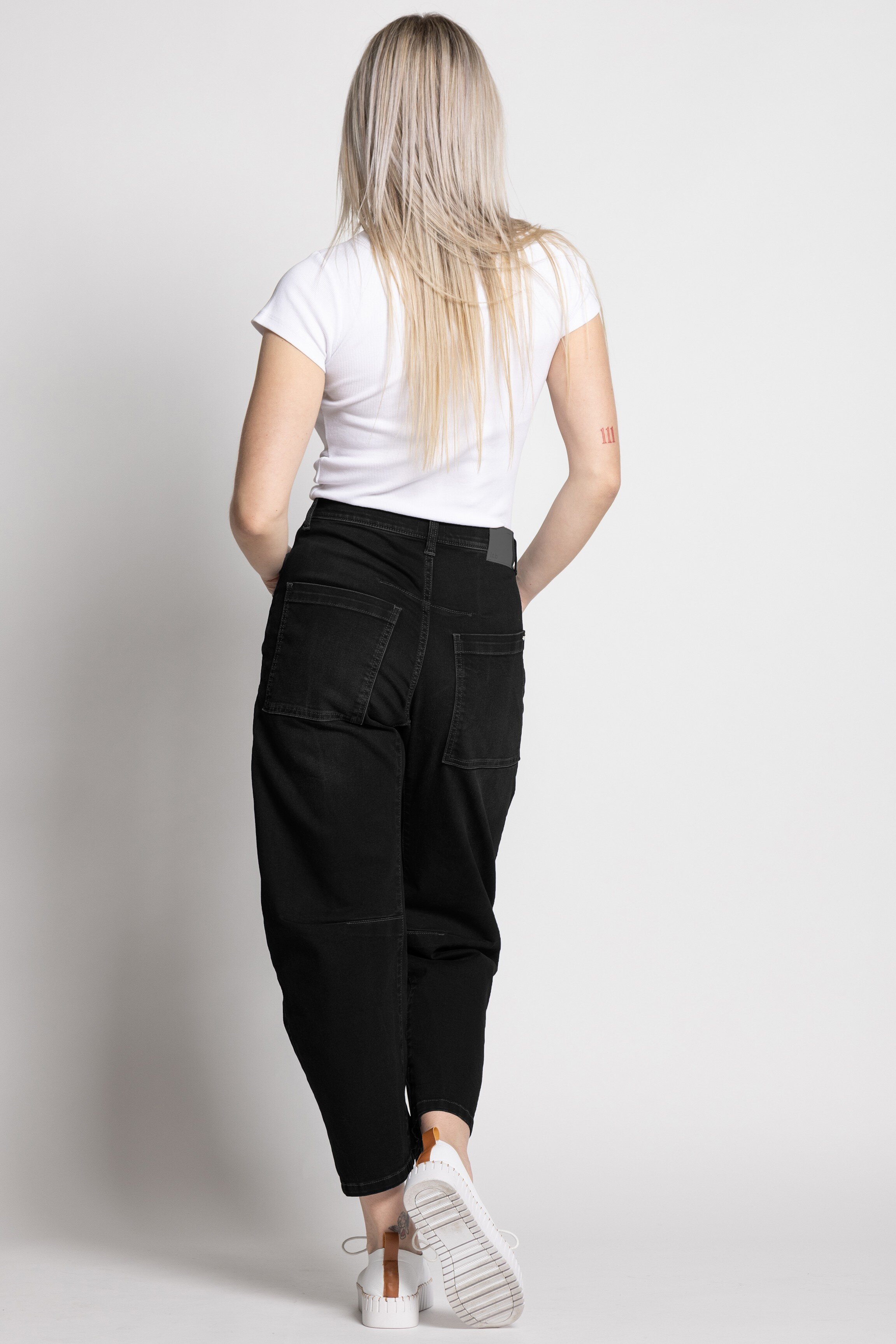 A barrel style jean with inner leg saddle seam and deep front pockets and large back pockets