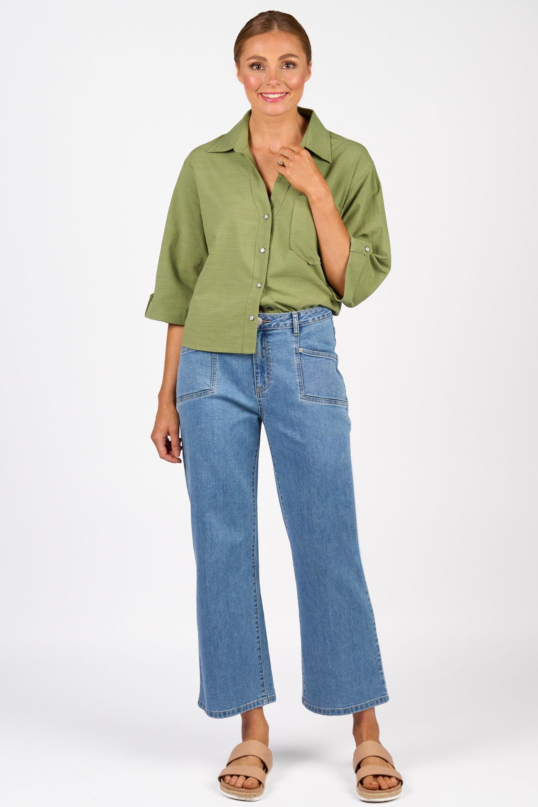 The Marlow Jean offers a flattering wide leg ankle grazer fit in lightweight stretch denim, blending casual comfort with a modern silhouette. Playful love heart embroidery on the back pocket adds a charming, playful touch to this easy-to-wear style.