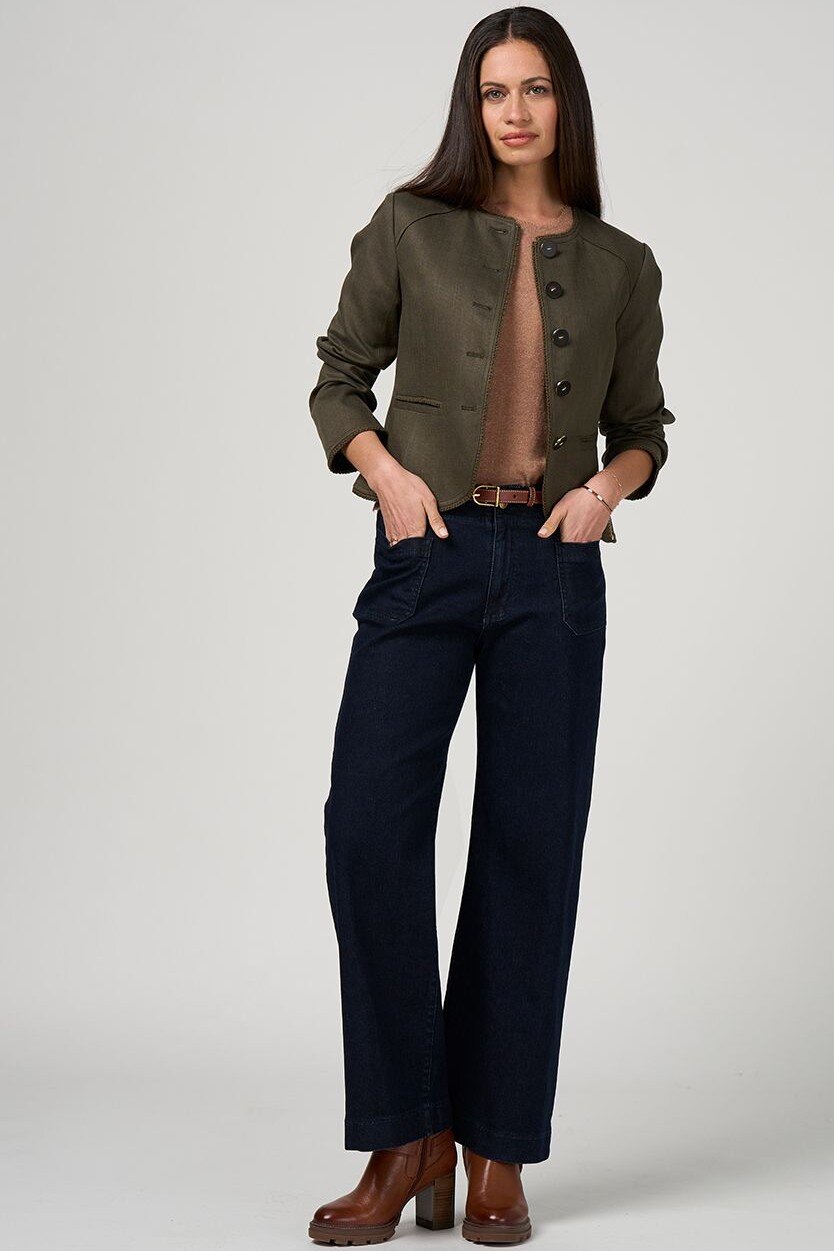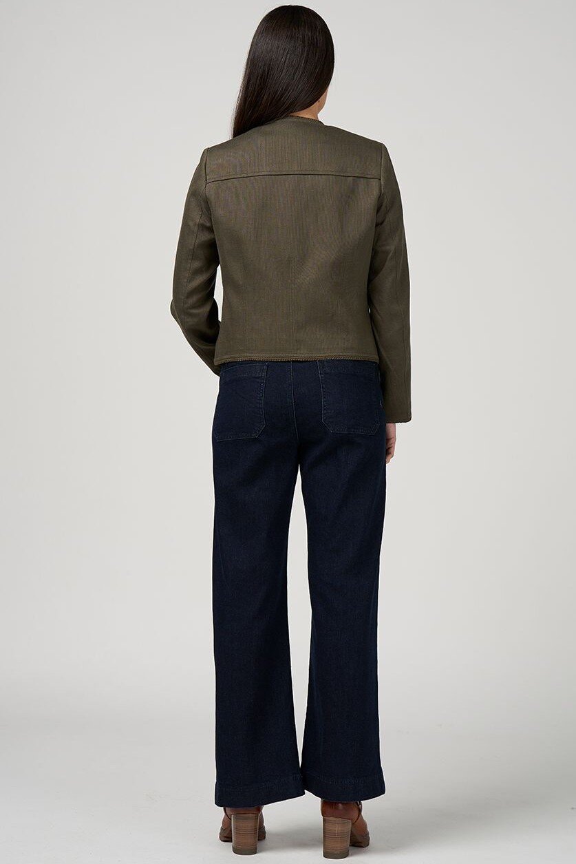 Fitted short-line jacket, beautifully tailored, with a crew neckline, and tonal cotton braid trim for a refined finish. Fully lined with back darts and topstitched panel detailing.