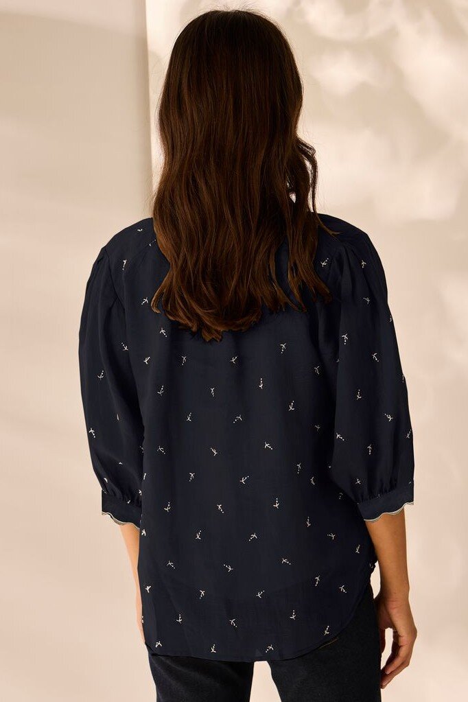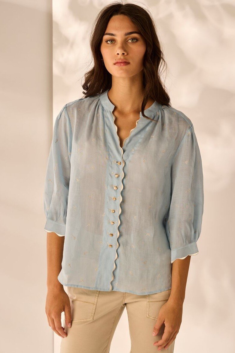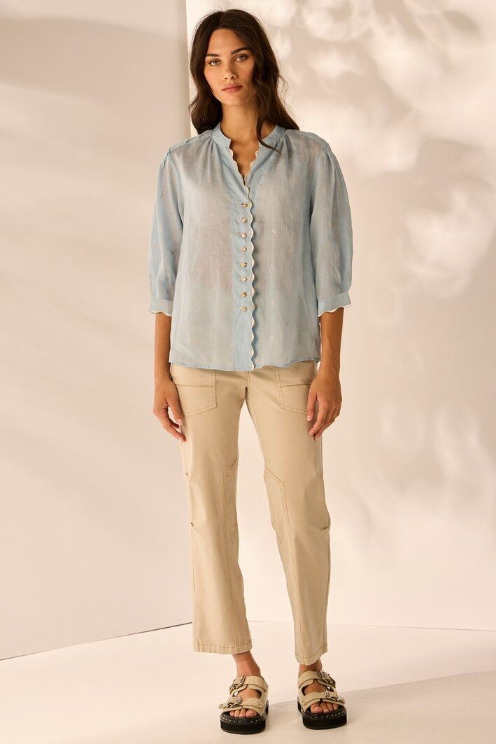 An embroidered Ramie fabrication takes form in a relaxed fit shirt. The soft gathered neckline, glass/ natural round buttons and scallop embroidery border down the centre front placket and cuff all contribute to the refined femininity of this style.