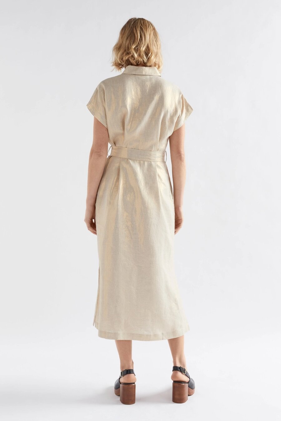 The Metalen Shirt Dress is a midi length button-through dress with a subtle shine, thanks to the gold foil print on natural coloured linen. With sustainably sourced corozo buttons, the dress has a collar, collar stand and a capped sleeve. The dress features a self sash tie belt, side seam pockets and side splits. In 100% linen, the dress is breathable and durable, and softens with wear.