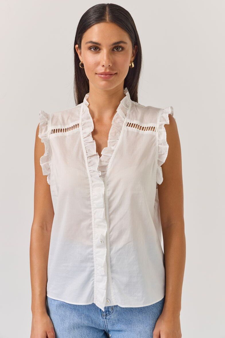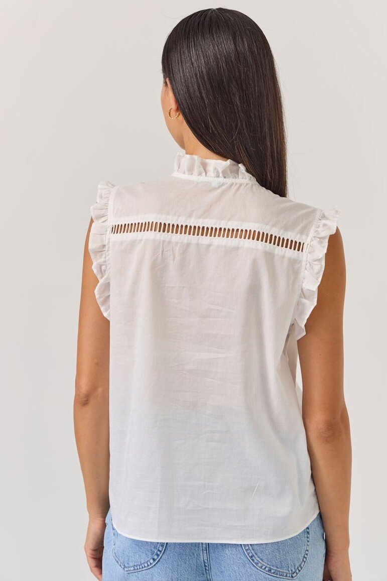 A new button-through blouse in a sleeveless style for the warmer months. With soft frill detailing and ladder lace inserts, this new top in a semi-sheer cotton voile is seriously beautiful and effortlessly feminine. Wear with a nude bra for added coverage.