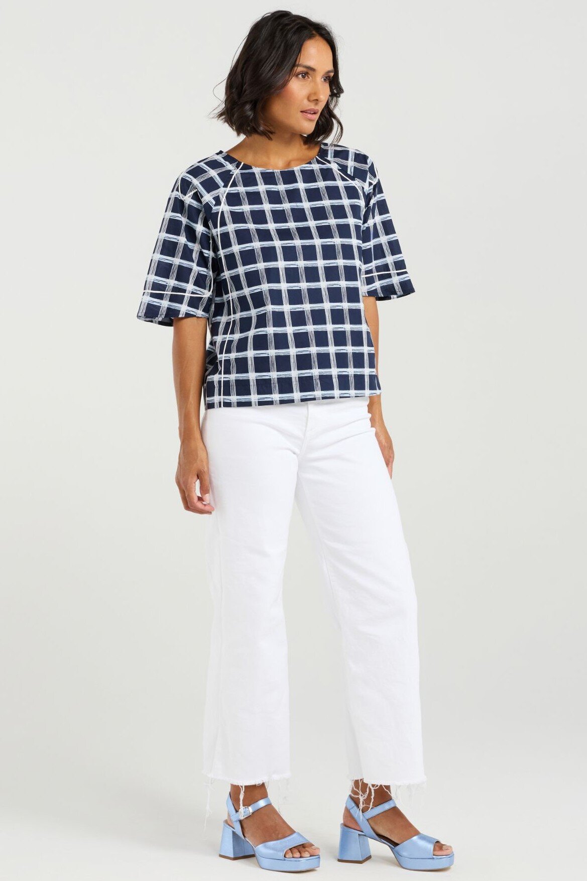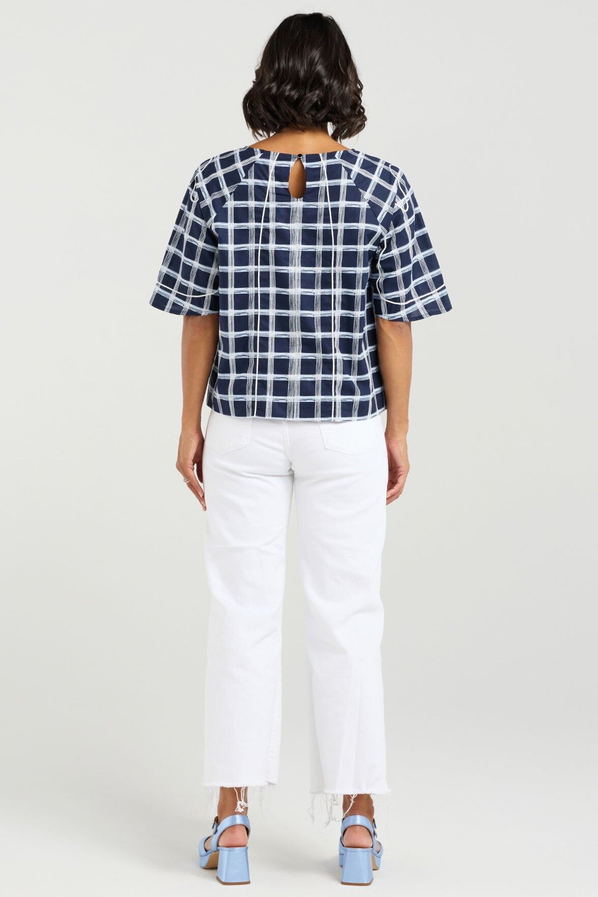 A contemporary take on the classic shell top, this short-sleeved style blends clean lines with subtle fashion detailing. Cut from crisp cotton for a lightweight yet structured feel, it features a not-quite-tee silhouette - streamlined and elevated. Contrast tape accents add a refined edge, offering a directional finish that makes this a wardrobe must have.