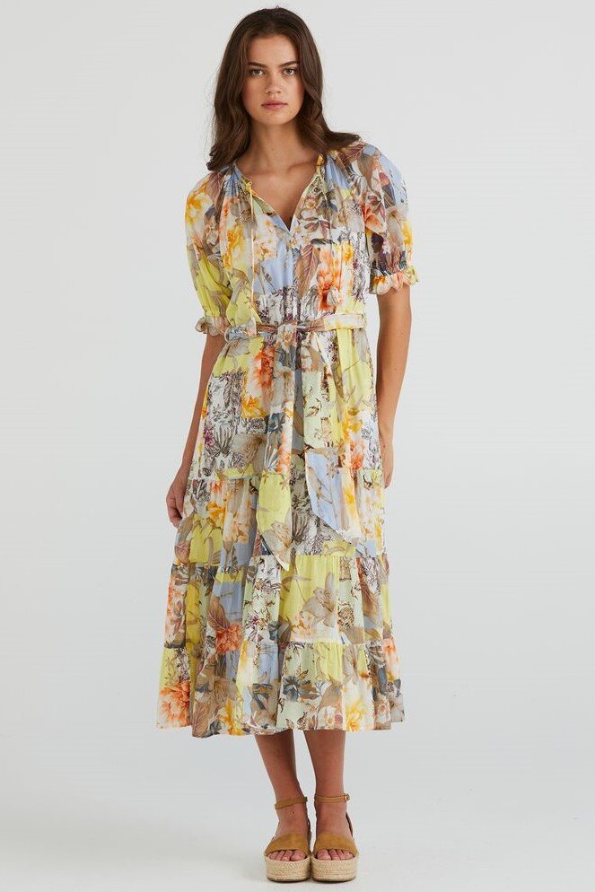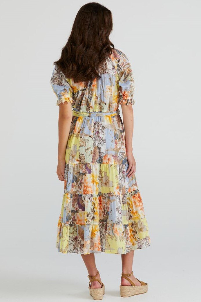 Experience the enchanting allure of the Monarch Dress, a lightweight cotton dress adorned with the captivating Monarch patchwork print. Delicate scallop embroidery in light tan at the sleeve cuff and looped cotton embroidery at the neckline add an artisanal touch, and crochet trimmed tulip tassel edges provide a playful finish. Elasticated at the back waist for a comfortable fit, this dress includes a removable fabric belt for effortless styling options.