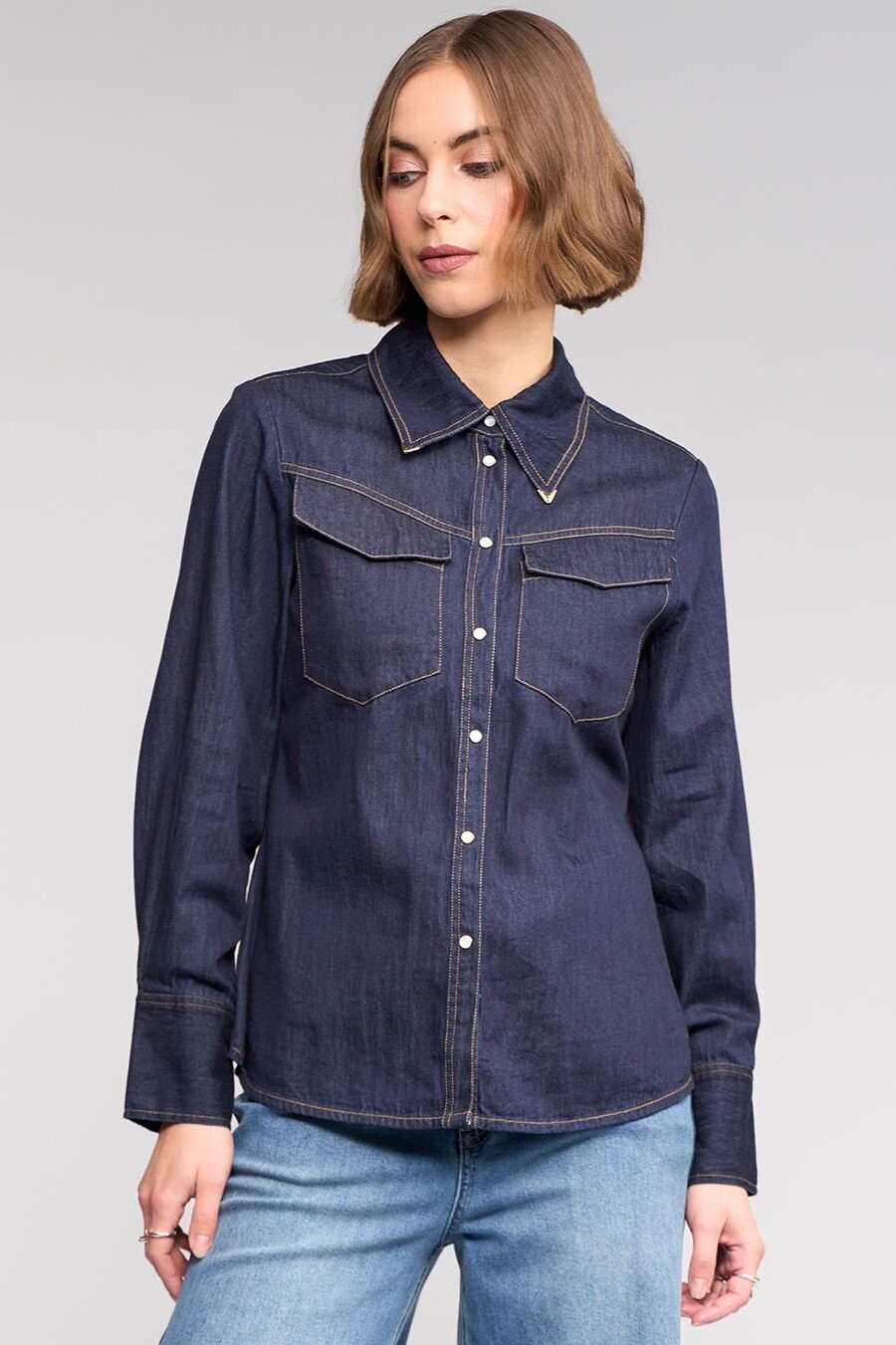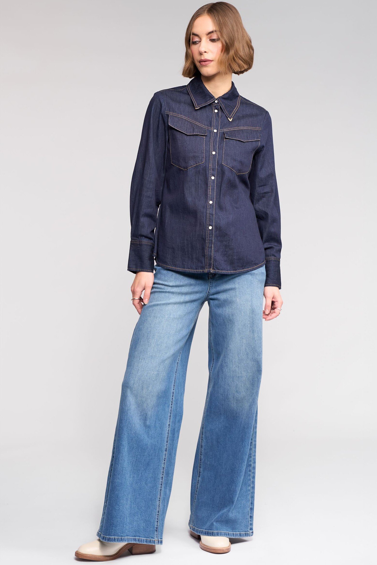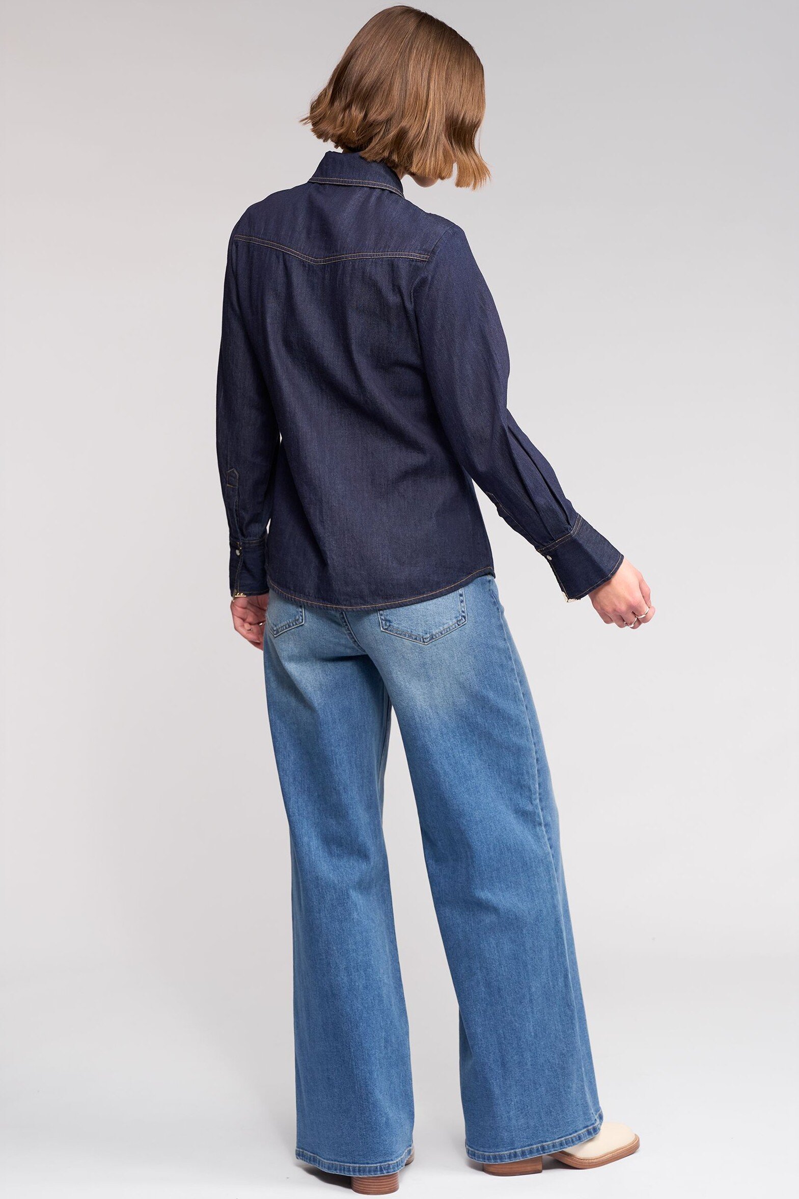 Soft denim shirt in Dark Denim with tan contrast stitching. Designed with a classic shirt silhouette and subtle western-inspired detailing, this piece features a pointed collar with metal collar tips, a popper-dome button-through front, and matching popper closures at the cuffs. Two chest patch pockets with flap closures add structure, while a shaped hem dips slightly lower at the back.