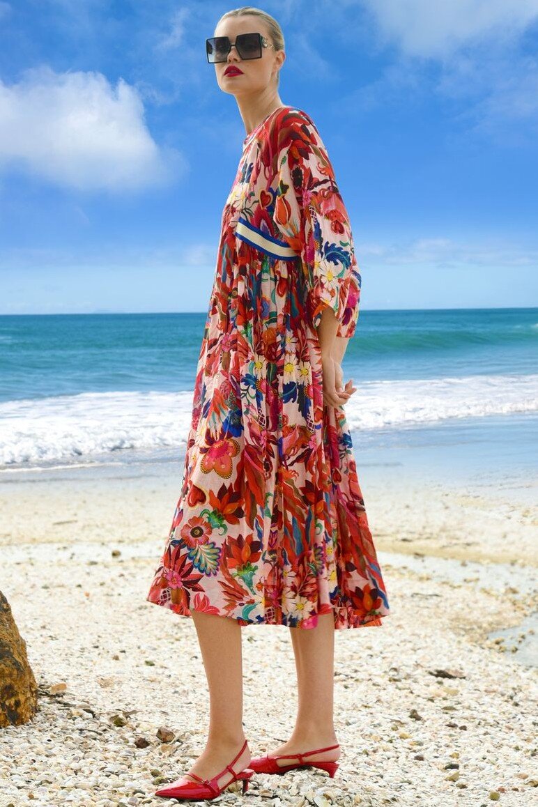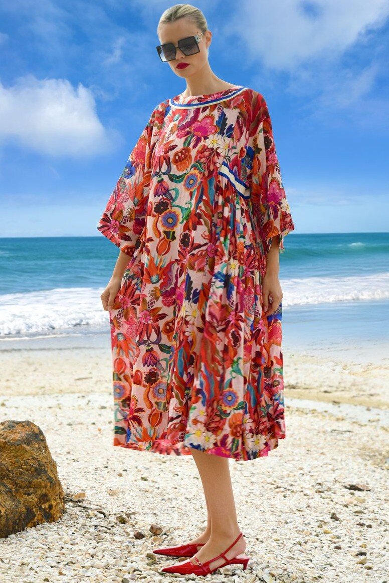 A signature kaftan silhouette that epitomizes summer dressing, the ‘Nice n’ Easy‘ dress is captivating with the bold and vibrant ‘Carnival Calling’ fabrication. Relaxed in silhouette to embrace sophistication and effortless flare, this dress features a wide neckline and sleeves, side splits, pockets and a grosgrain detailed trim. An easy throw on piece, this elevated casual dress is perfect for day markets or evening dinners.