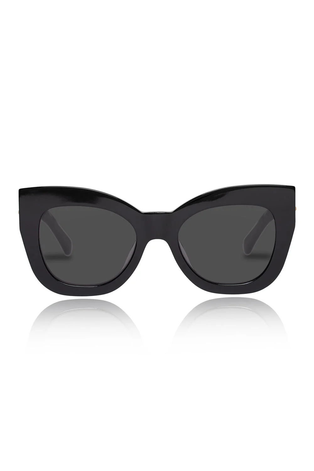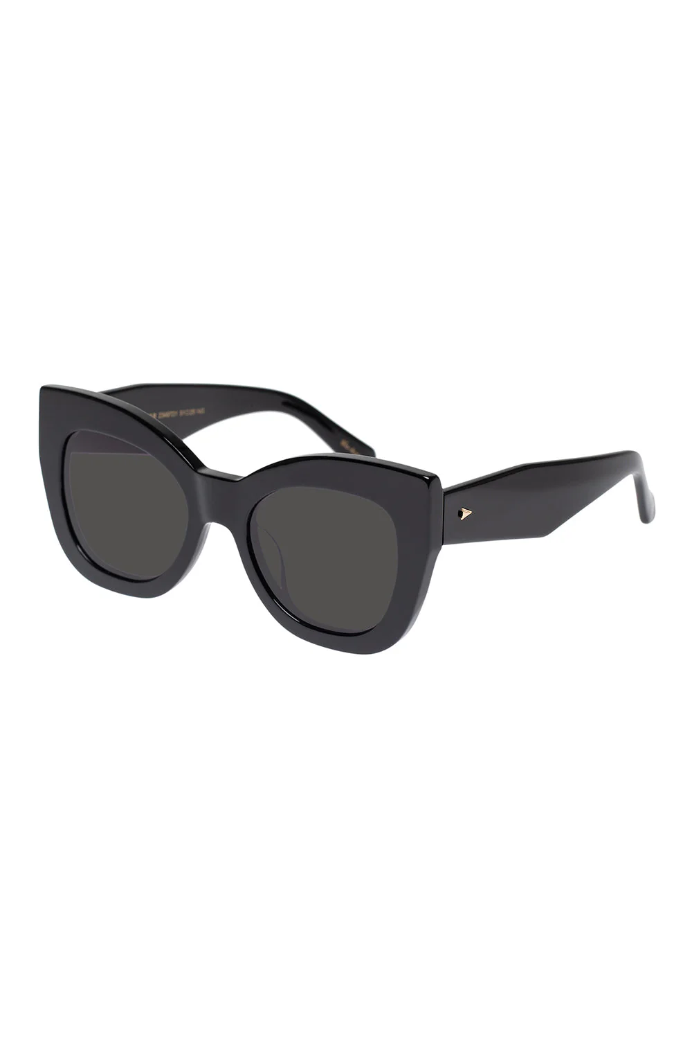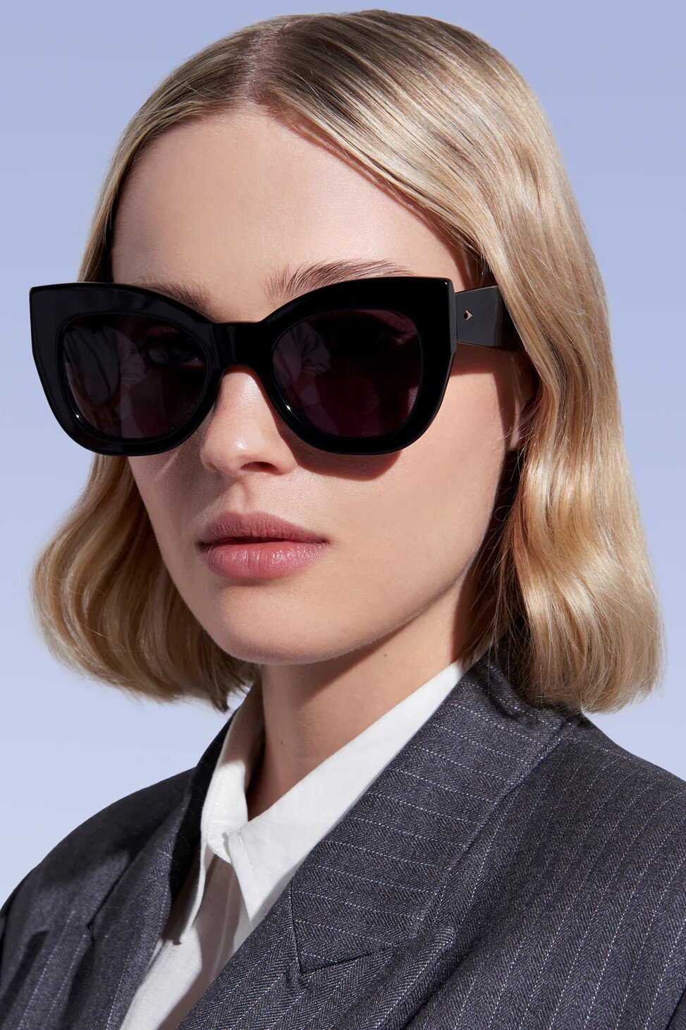 An icon refreshed from the Karen Walker archive, the Northern Lights remains a show- stopping style with its dramatic frame, sharp lines and curved cat-eye silhouette. Crafted in glossy black bio-acetate, the angular frame is fitted with coordinating smoke mono lenses delivering timeless glamour. The style is completed with a comfortable nose bridge, luxurious arms and our refreshed arrow hardware at the temple.