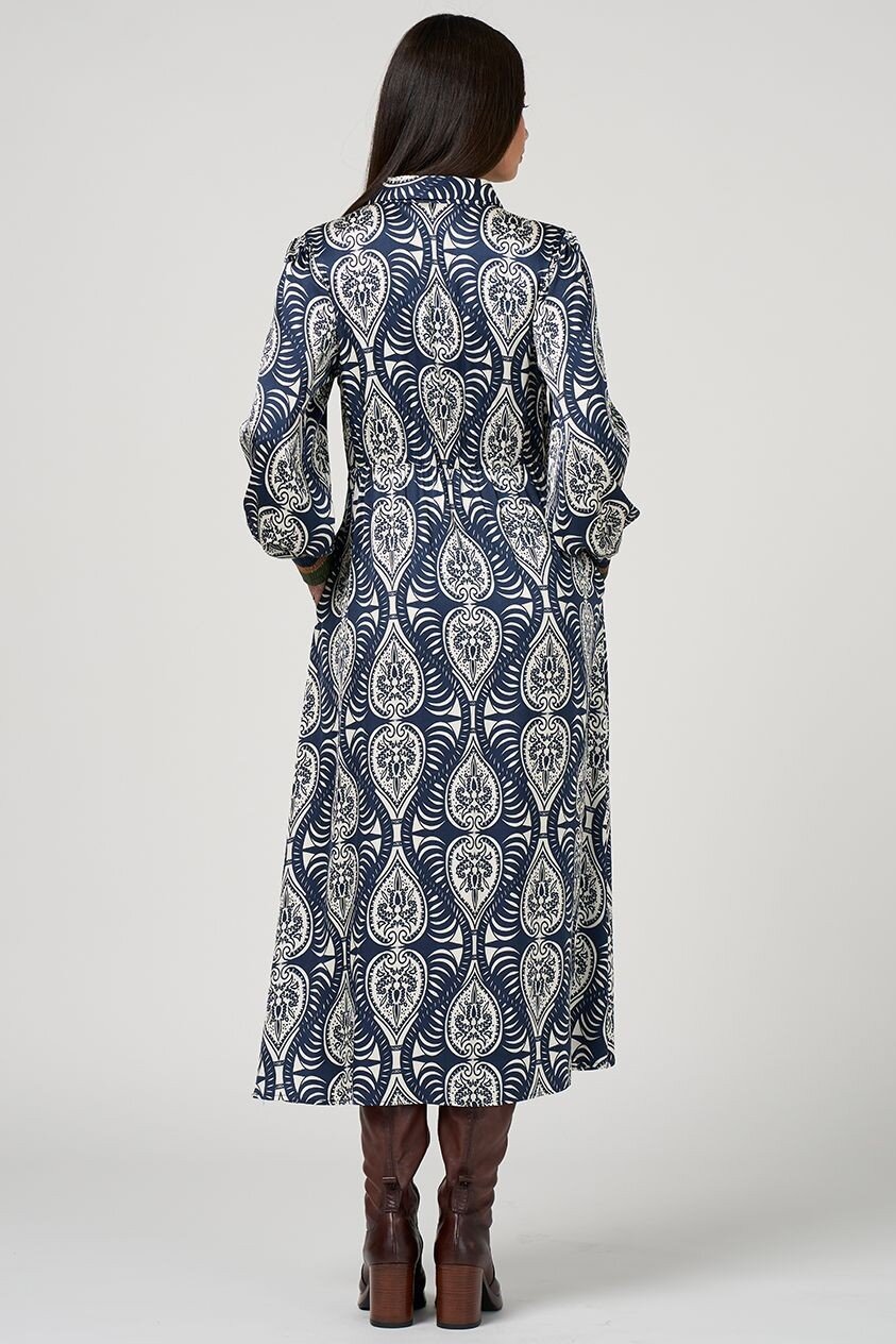 Sateen button-through midi shirt dress with a collared neckline, flattering princess panels, and an elasticated back waist for added shape, and side seam pockets. Blouson sleeves which gather into elasticated cuffs.