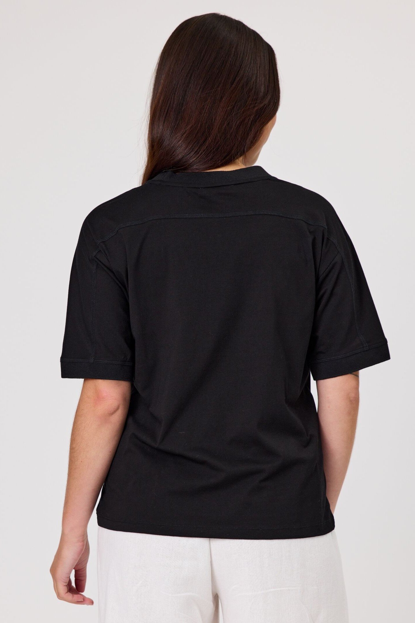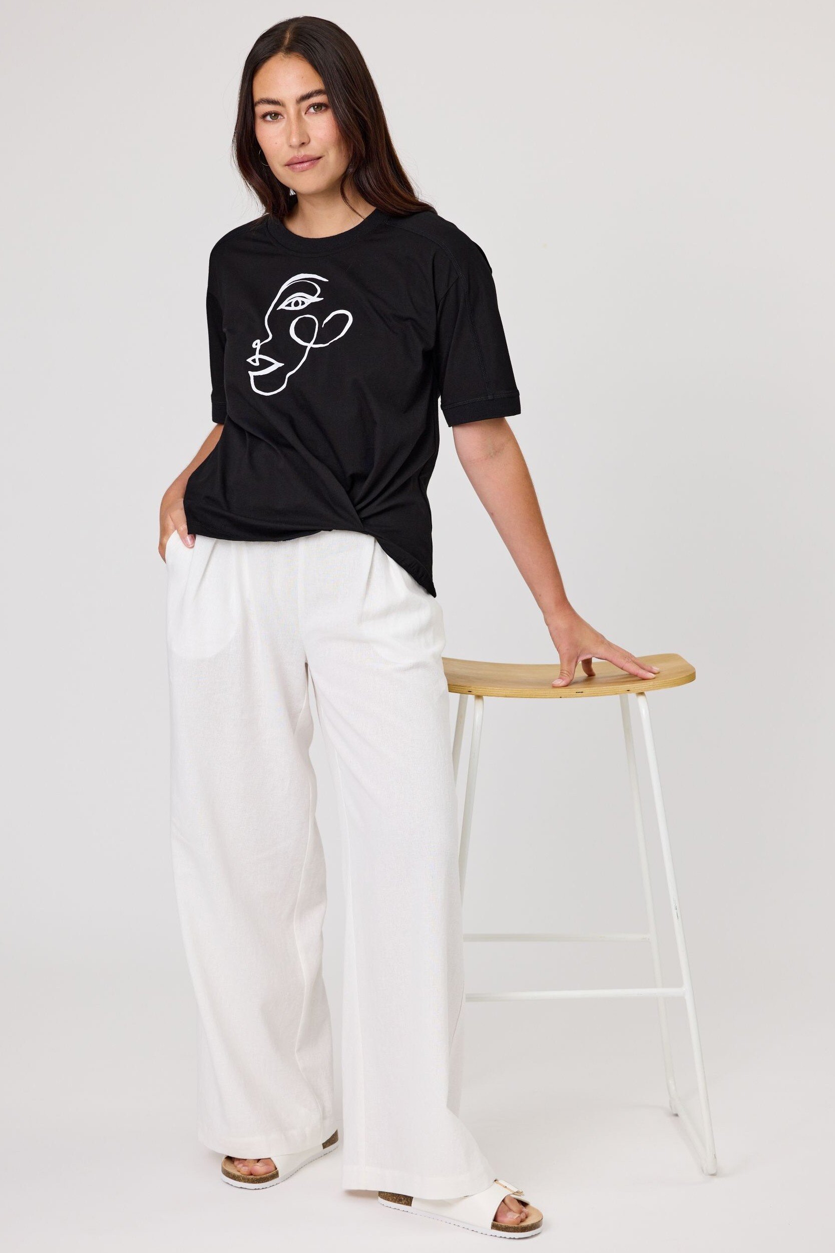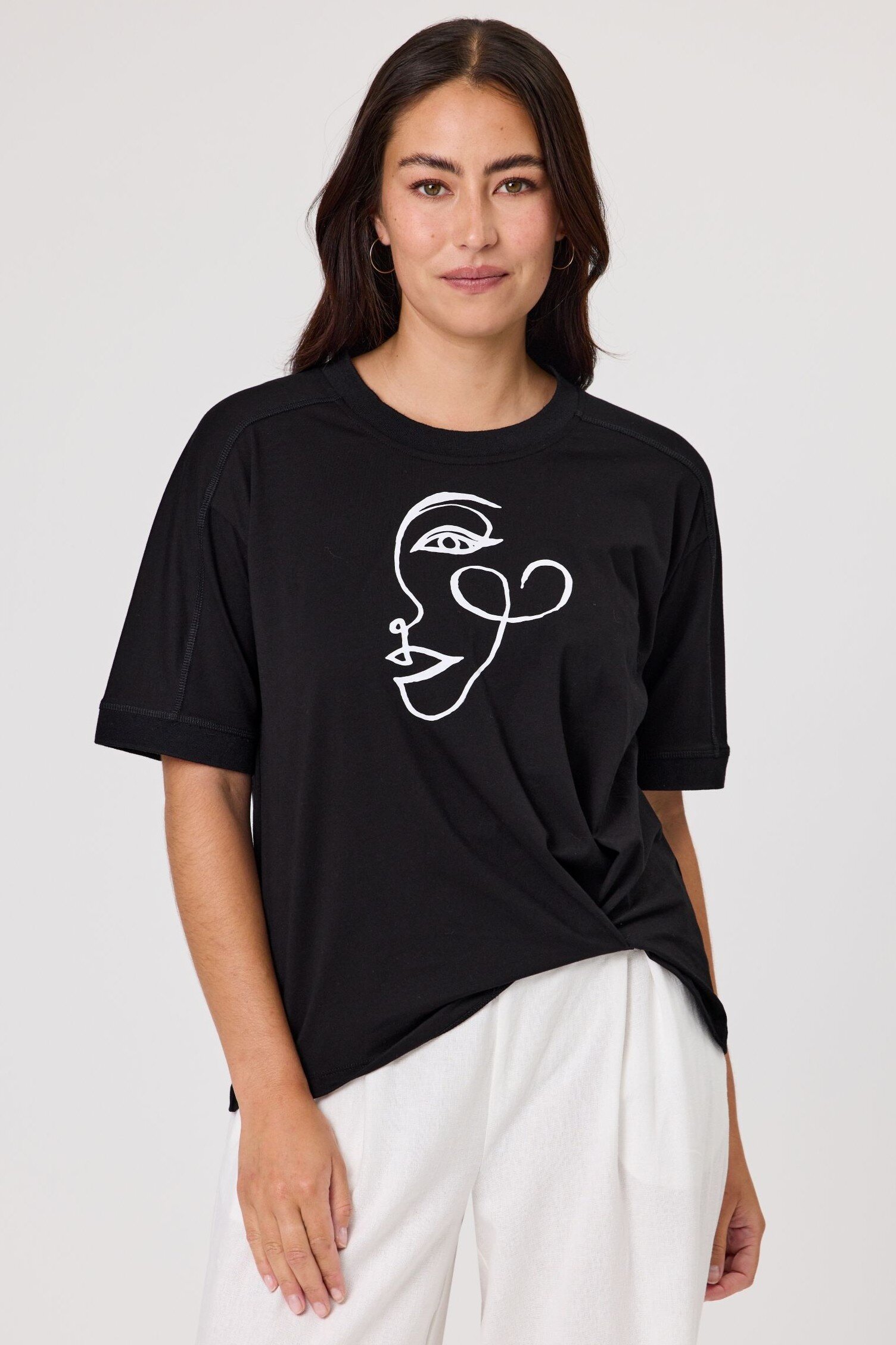 Round neck top with drop shoulder. Featuring a circle applique design and vertical tuck detail on the front.