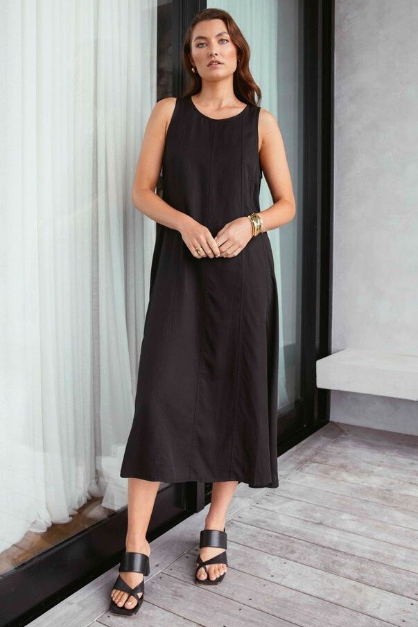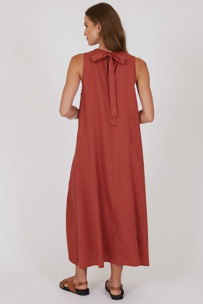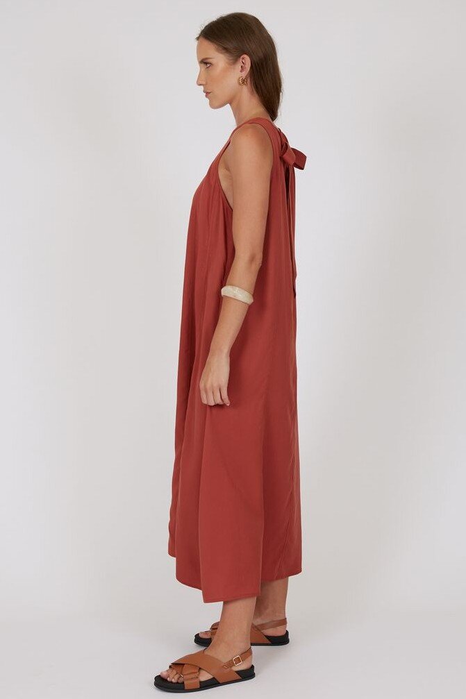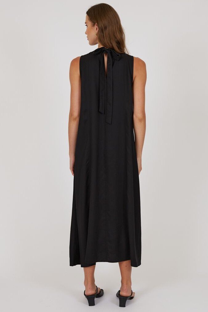 The Palma Dress is your effortlessly polished summer staple-relaxed, flowy, and designed to drape beautifully with every step. Crafted from 100% Tencel for a soft, silky feel, this midi-to-maxi style moves seamlessly from day to night. The sleeveless design and crew neckline create a clean, modern look, while the back keyhole closure and statement fabric bow add are fined touch. Style with slides and a raffia bag for brunch or elevate with heeled sandals and a clutch for event season.