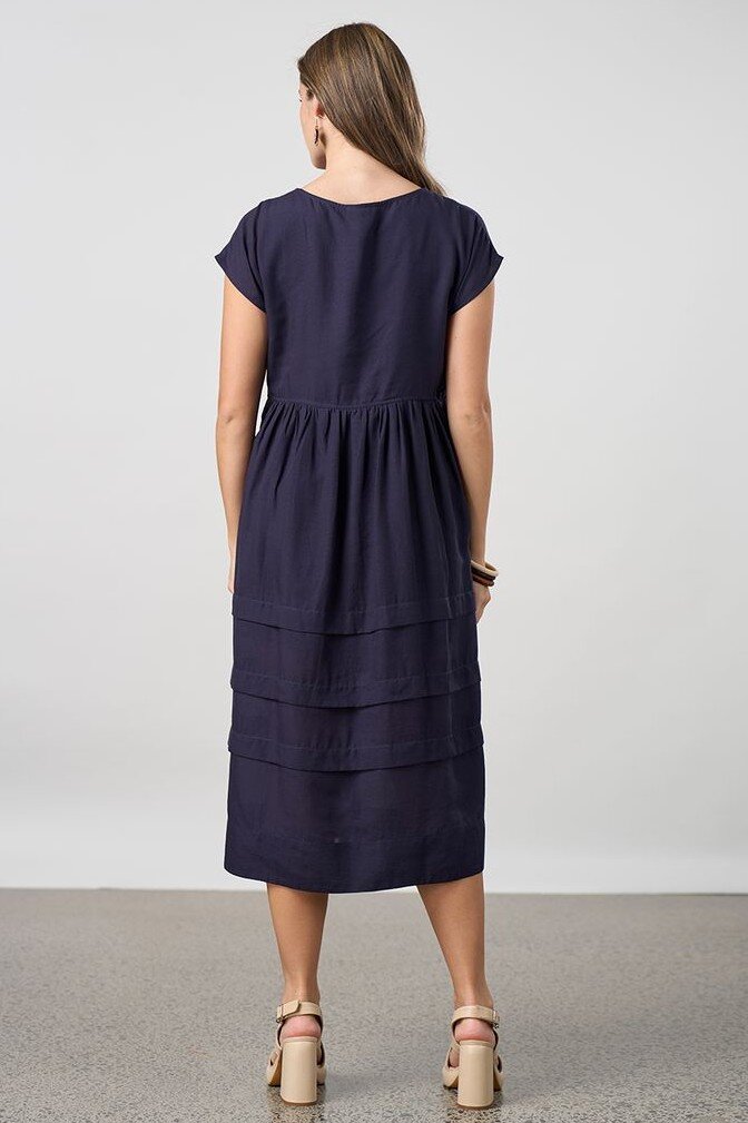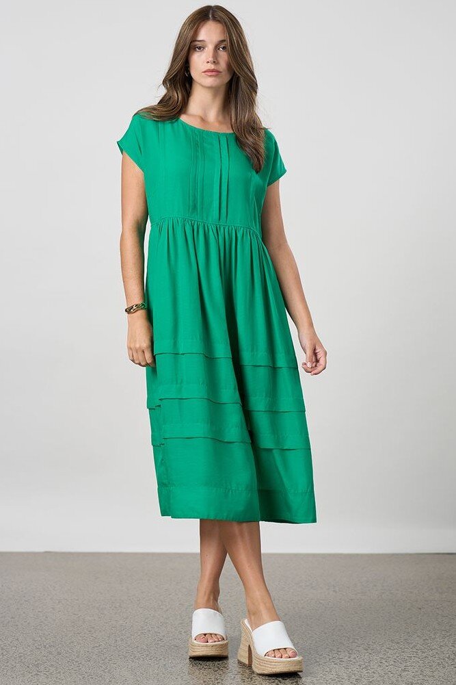 Lightweight dress with a gathered skirt at waist seam and bust darts for a flattering fit. Featuring vertical tucks on the bodice and horizontal tucks on the skirt to add detail. Lined.