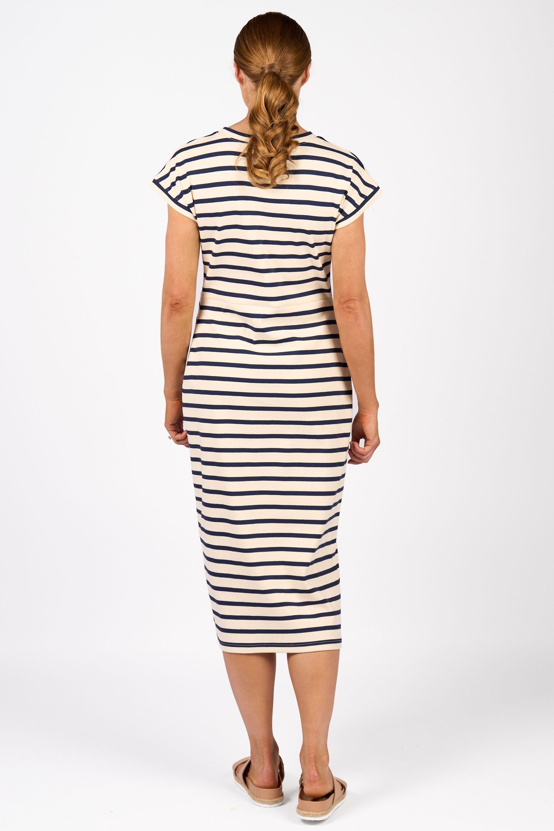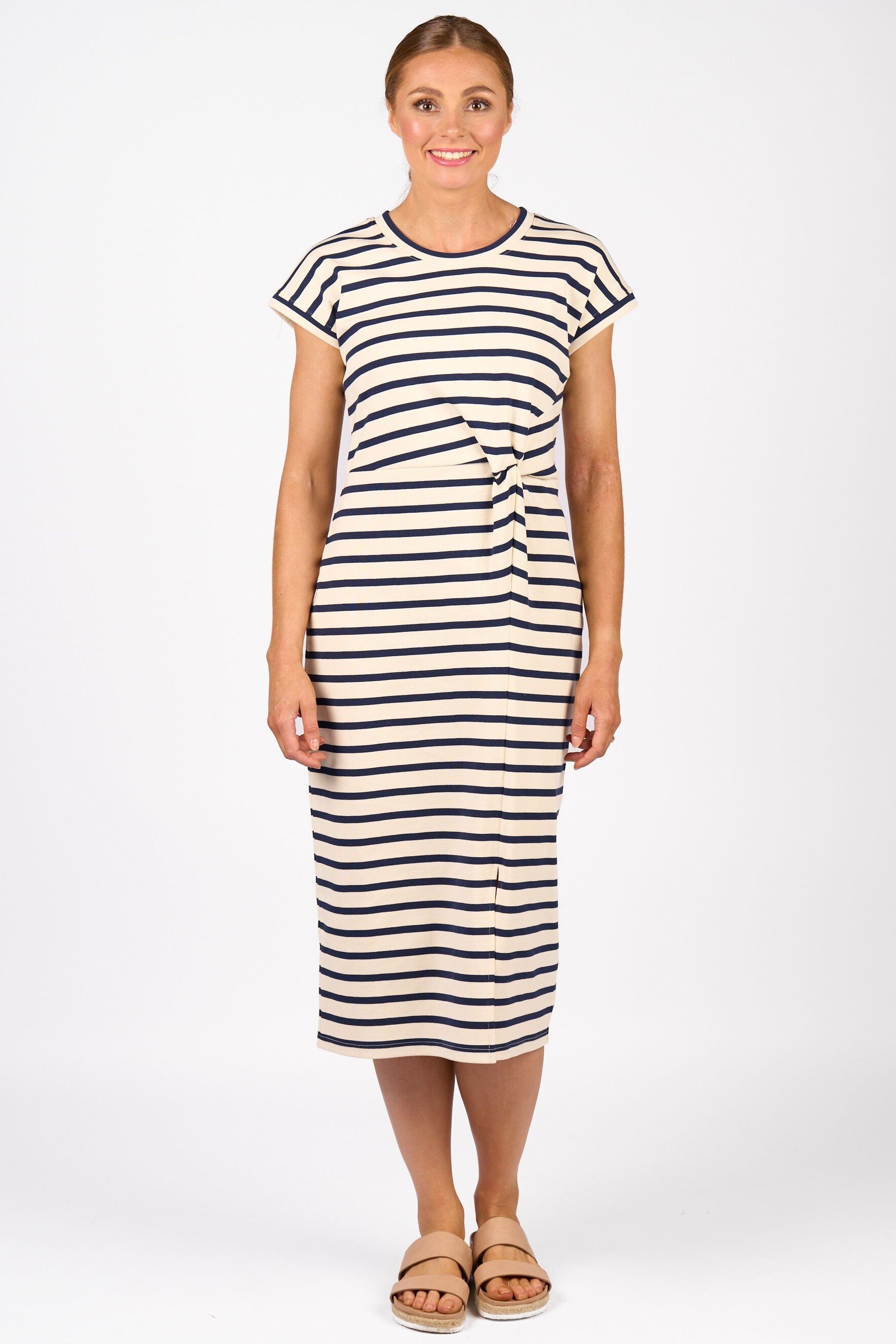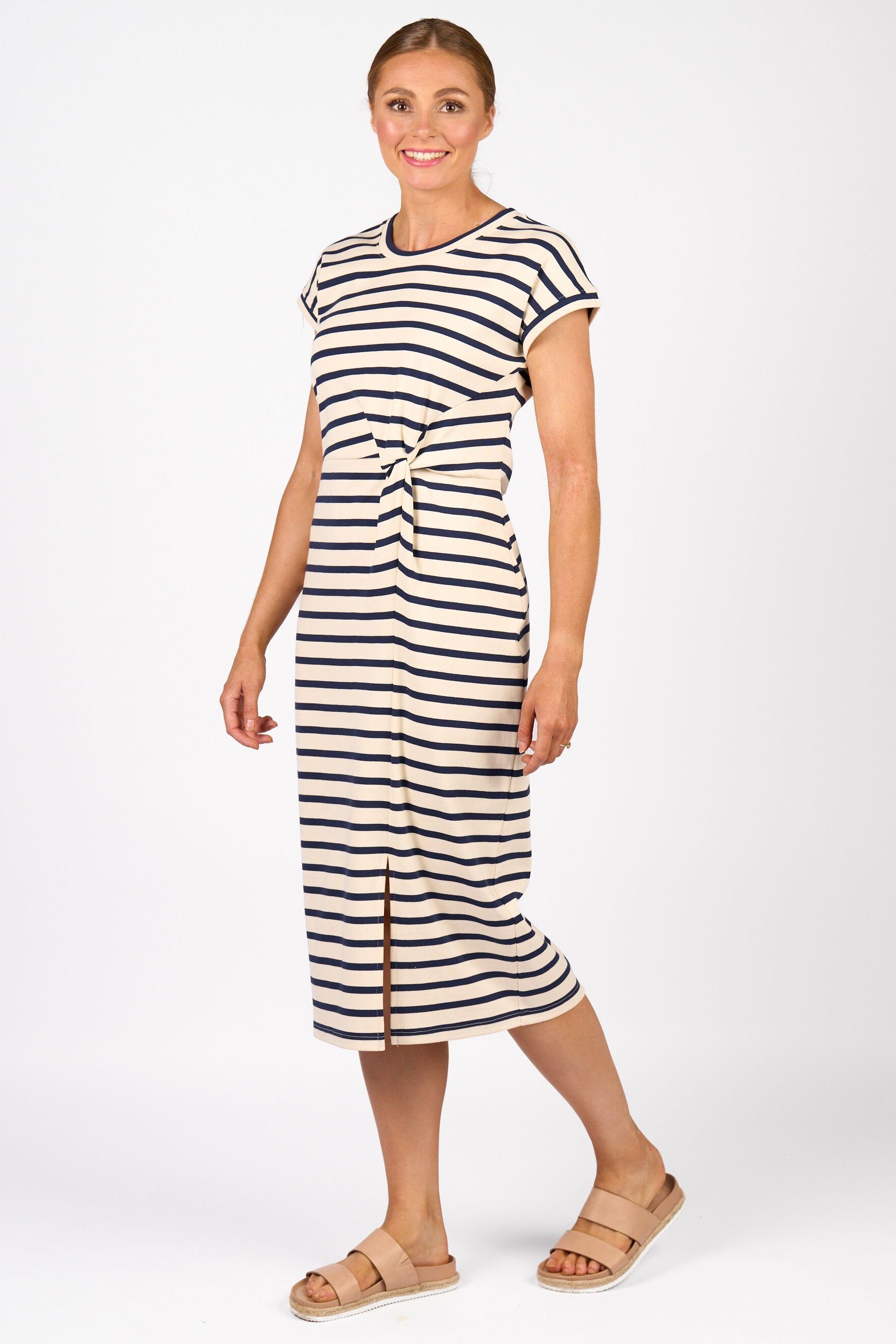 The Parker Dress is made from soft stretch cotton knit fabric and features a drop shoulder with short sleeves and a twist detail at the waist. With a wide fit through the chest and a shaped waist and hips, it offers a flattering silhouette and a side front split for ease of movement, making it ideal for relaxed yet polished looks.