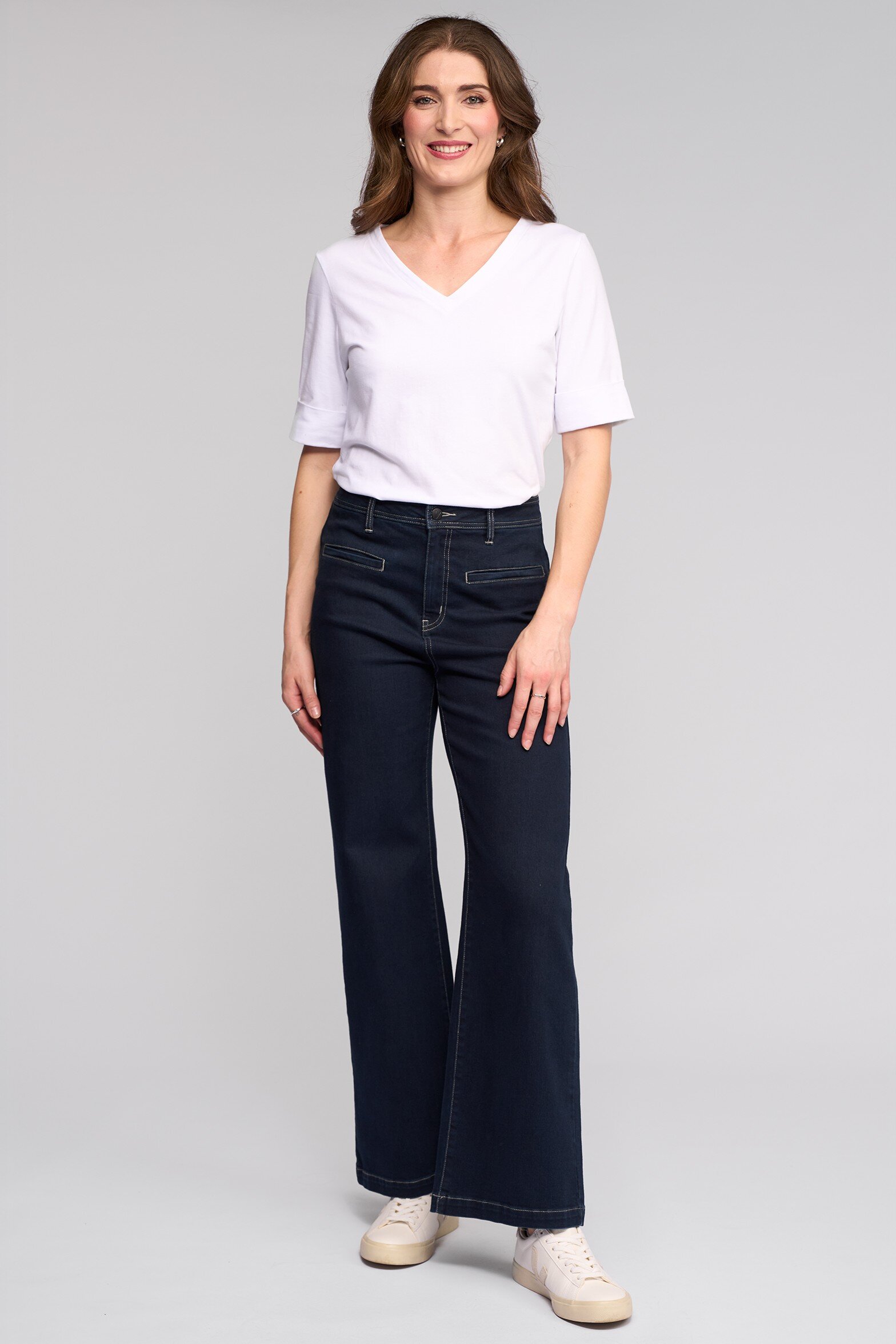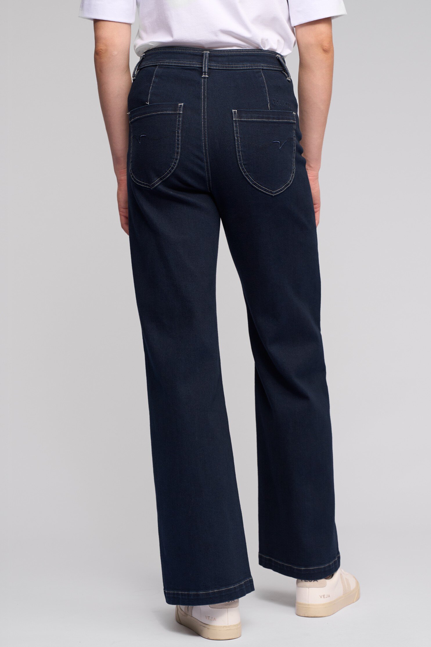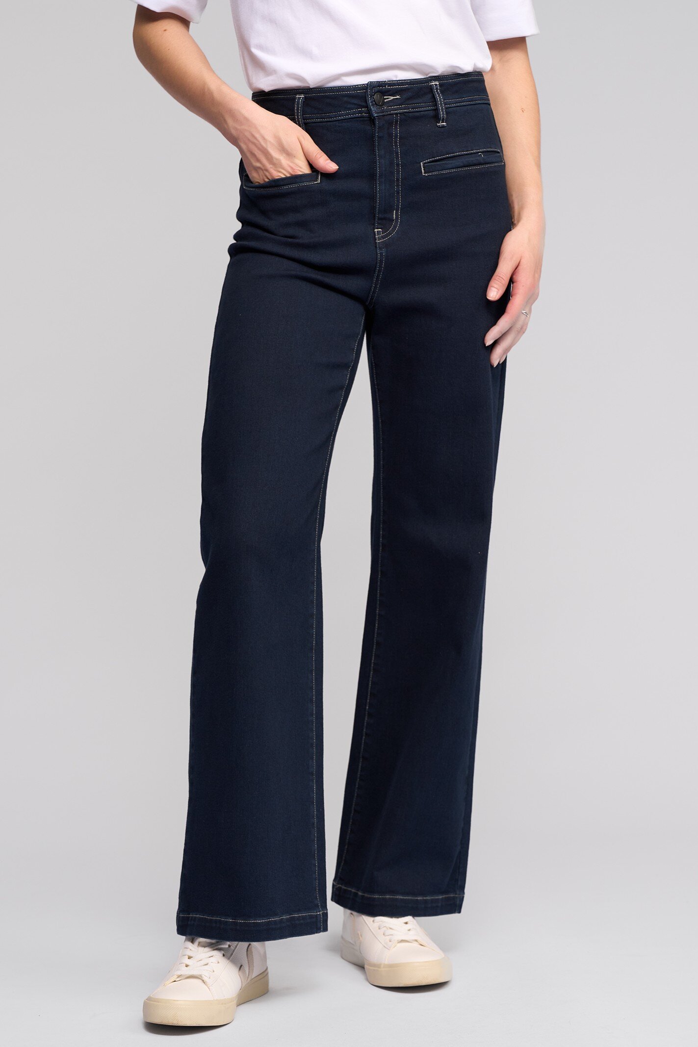 Wide-leg full-length jean in Ink Denim — a deep dark blue finished with contrast topstitching.