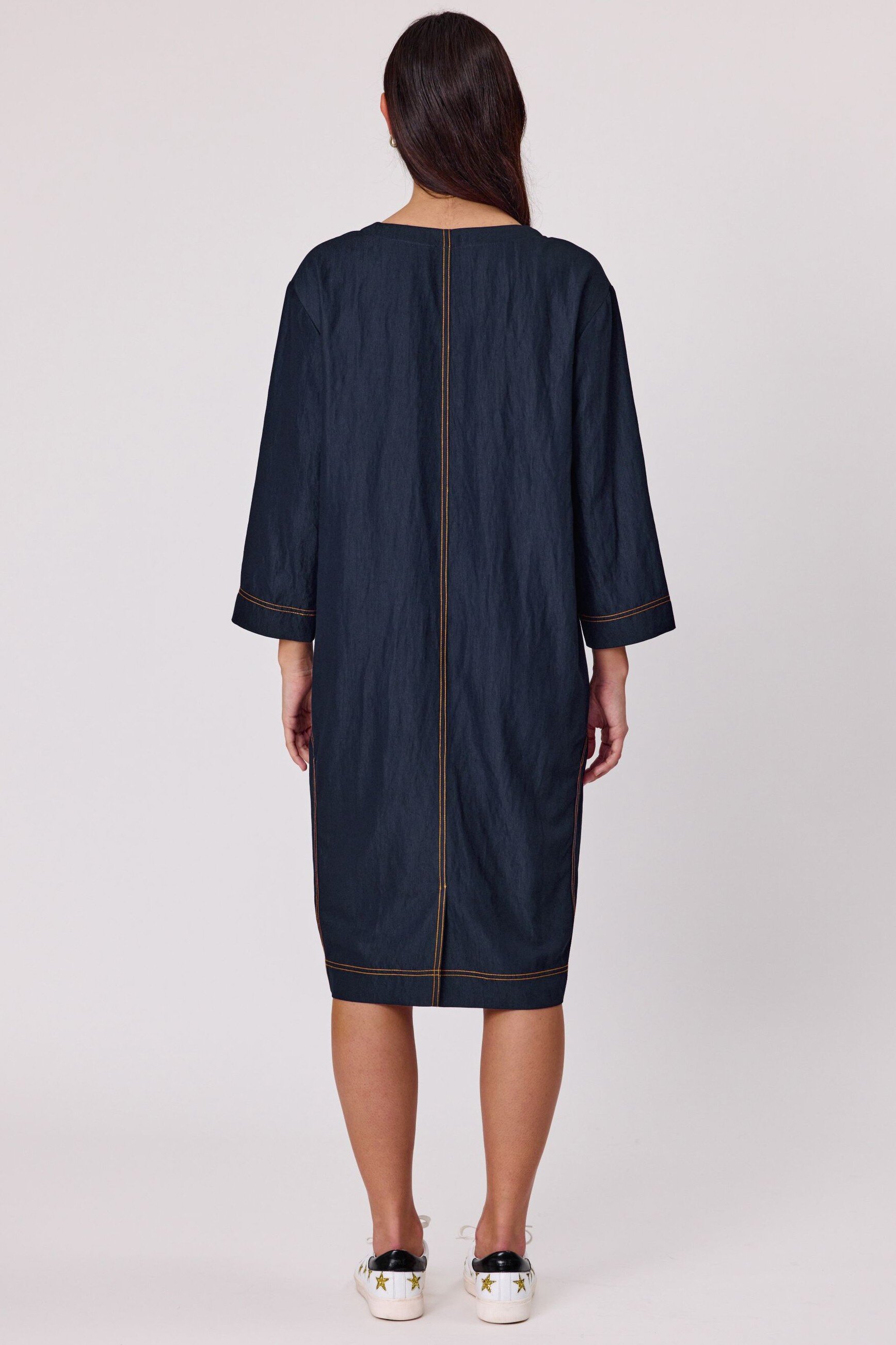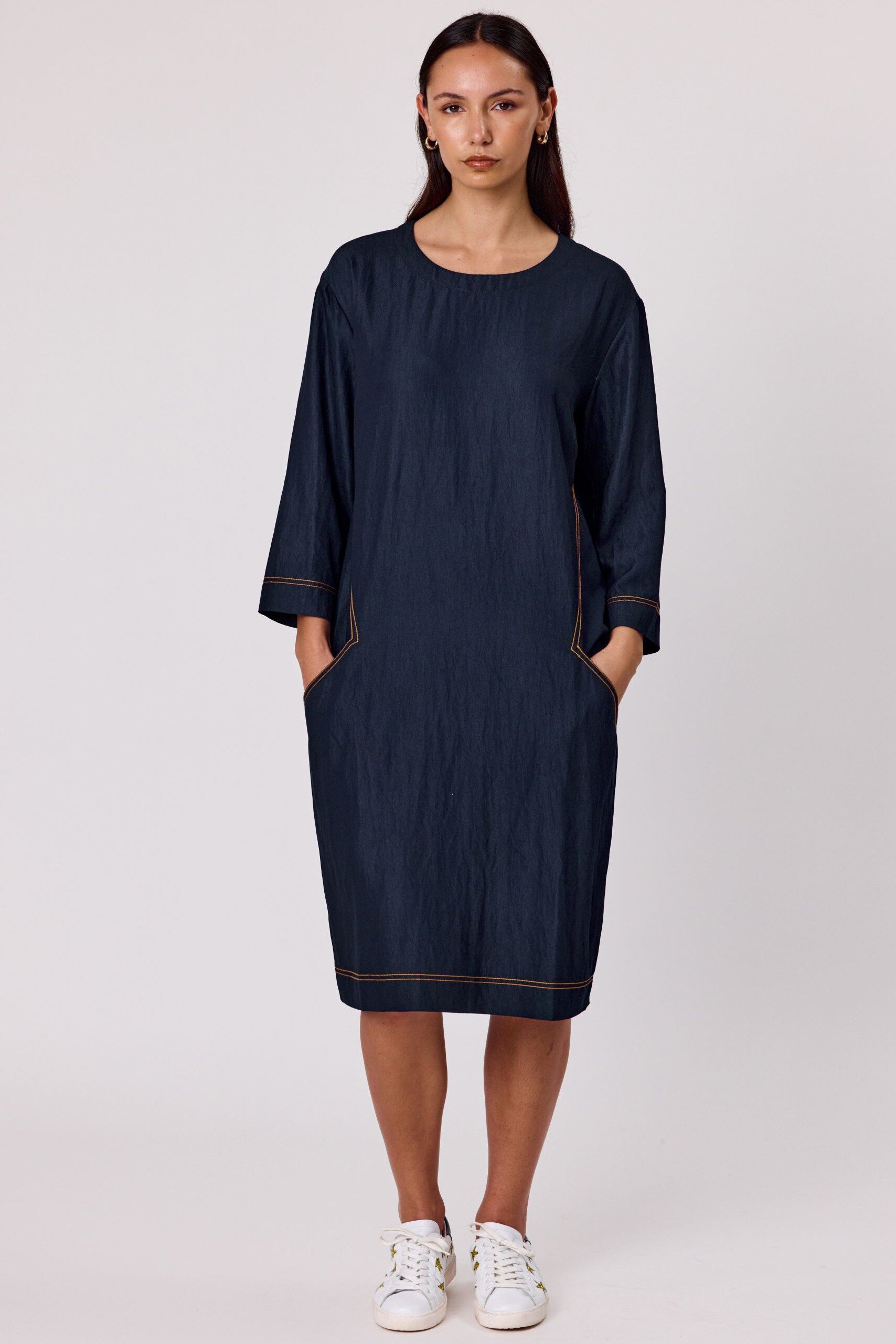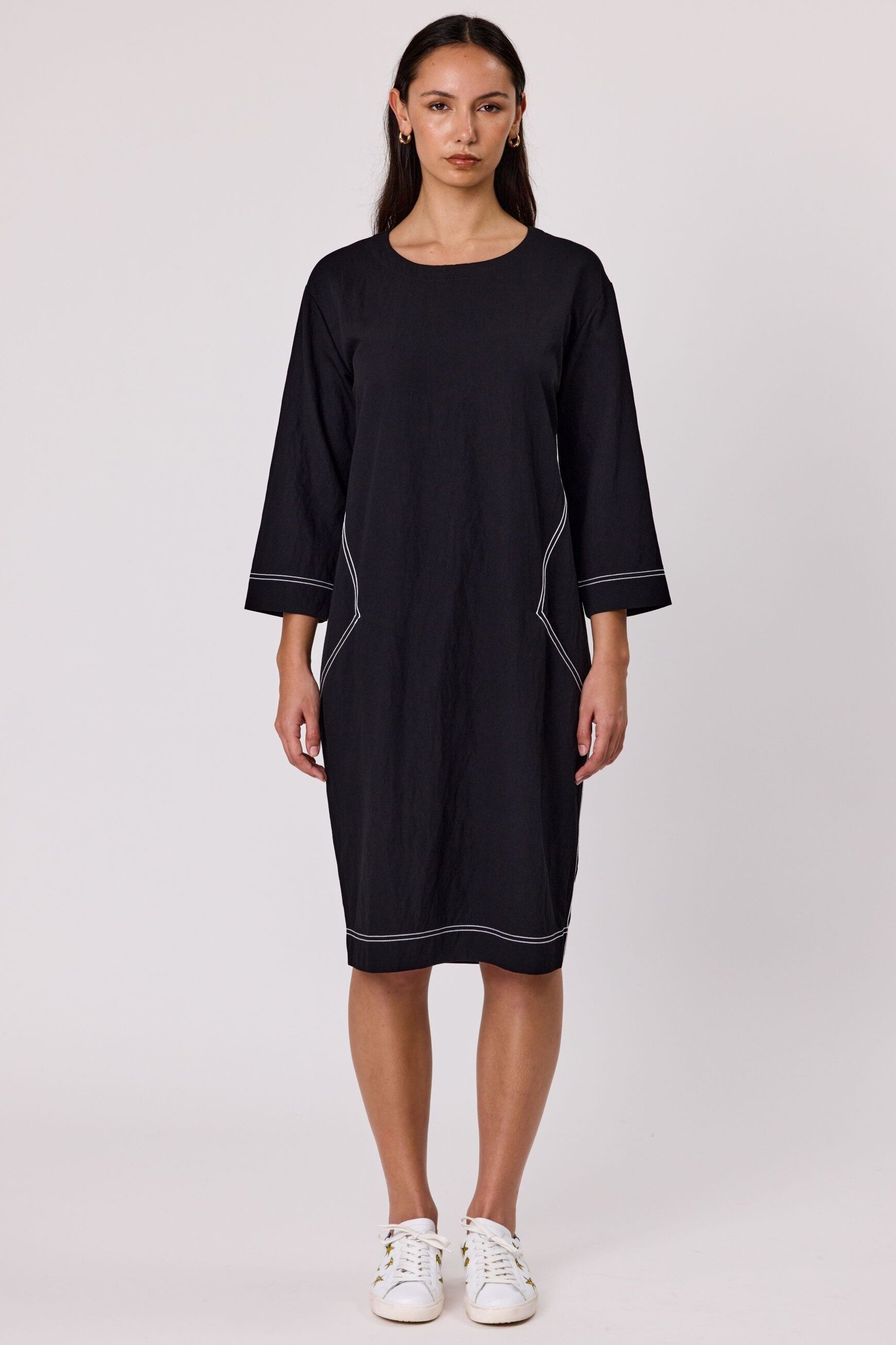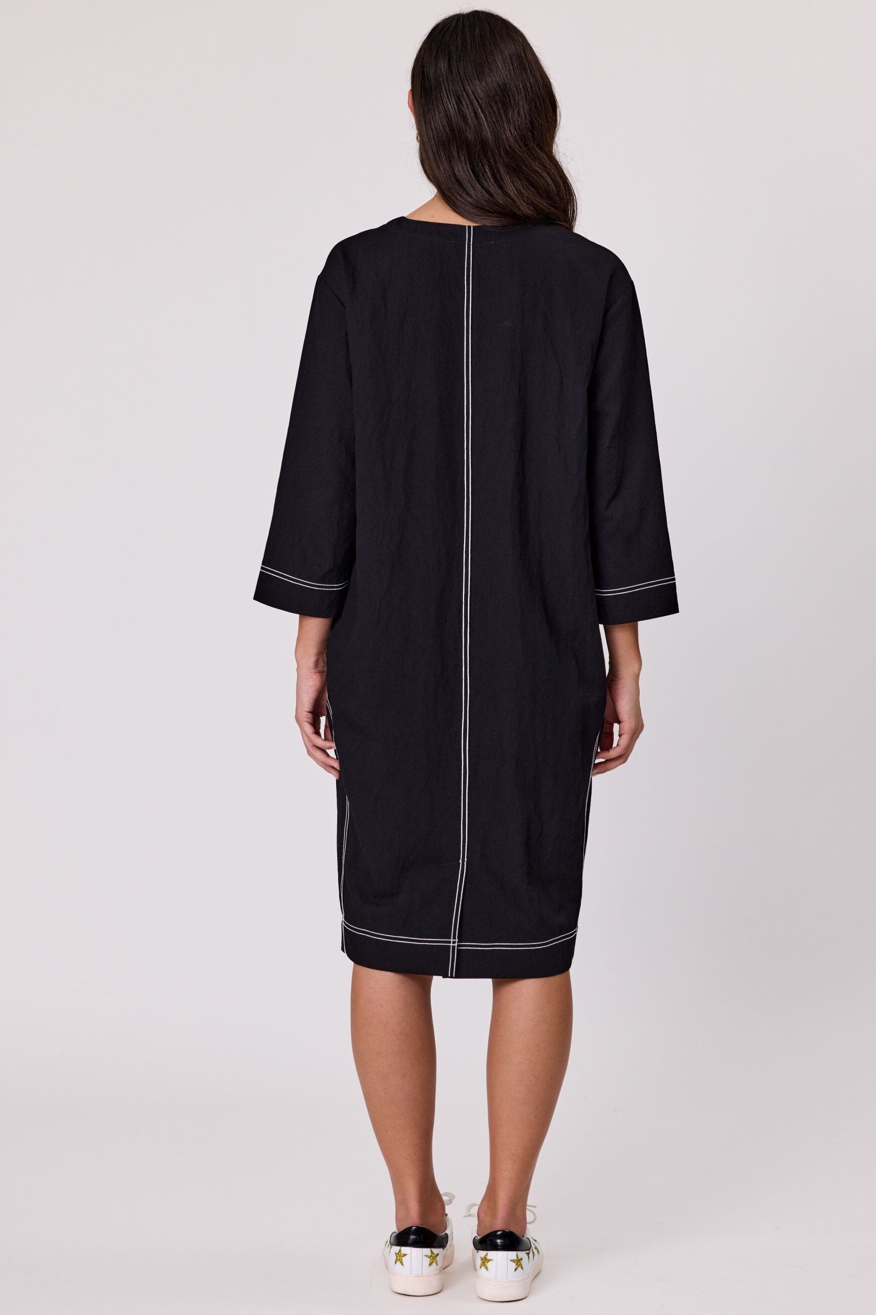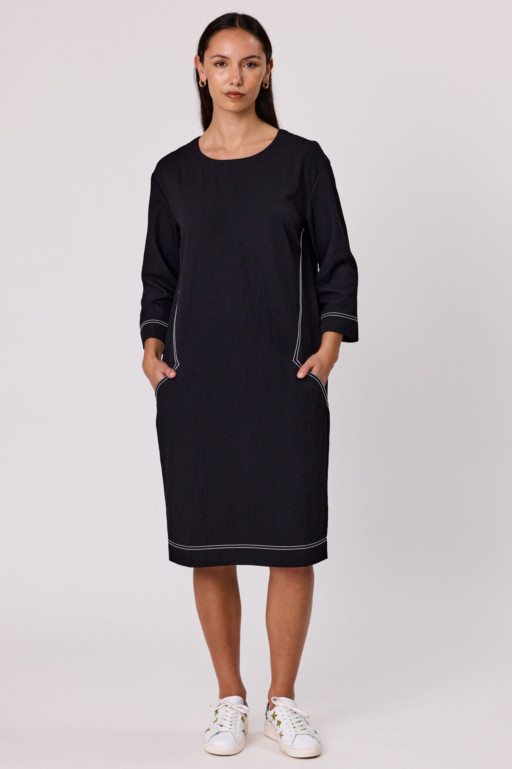Keep it simple and stylish with this Percy Dress featuring elbow-length sleeves, a round neckline, and standout contrast stitching that adds a modern edge. The stitching highlights the sleeves, hem, and pockets, giving the dress a clean yet eye-catching finish.