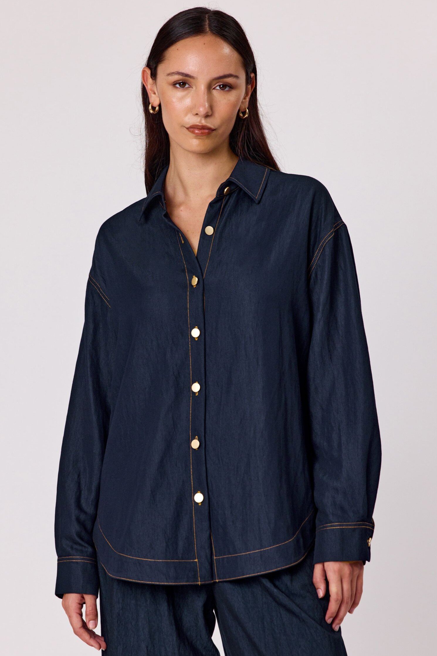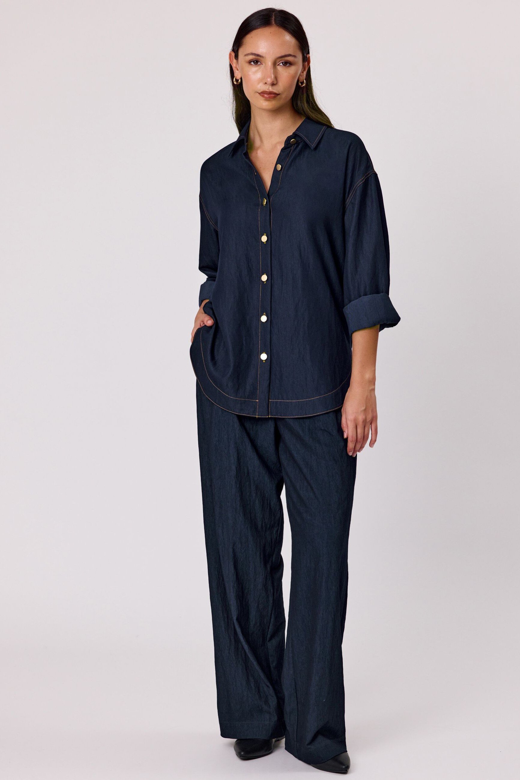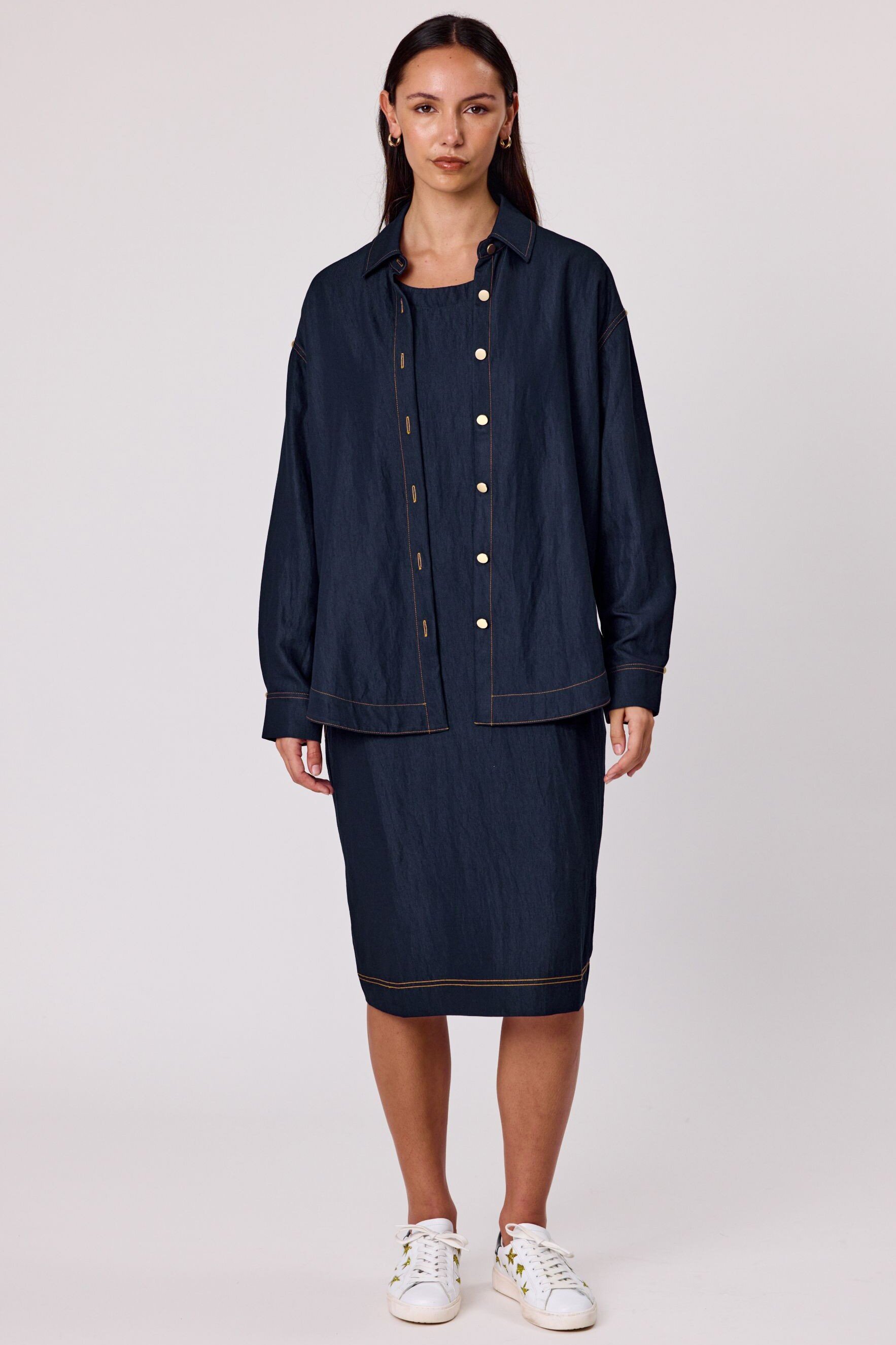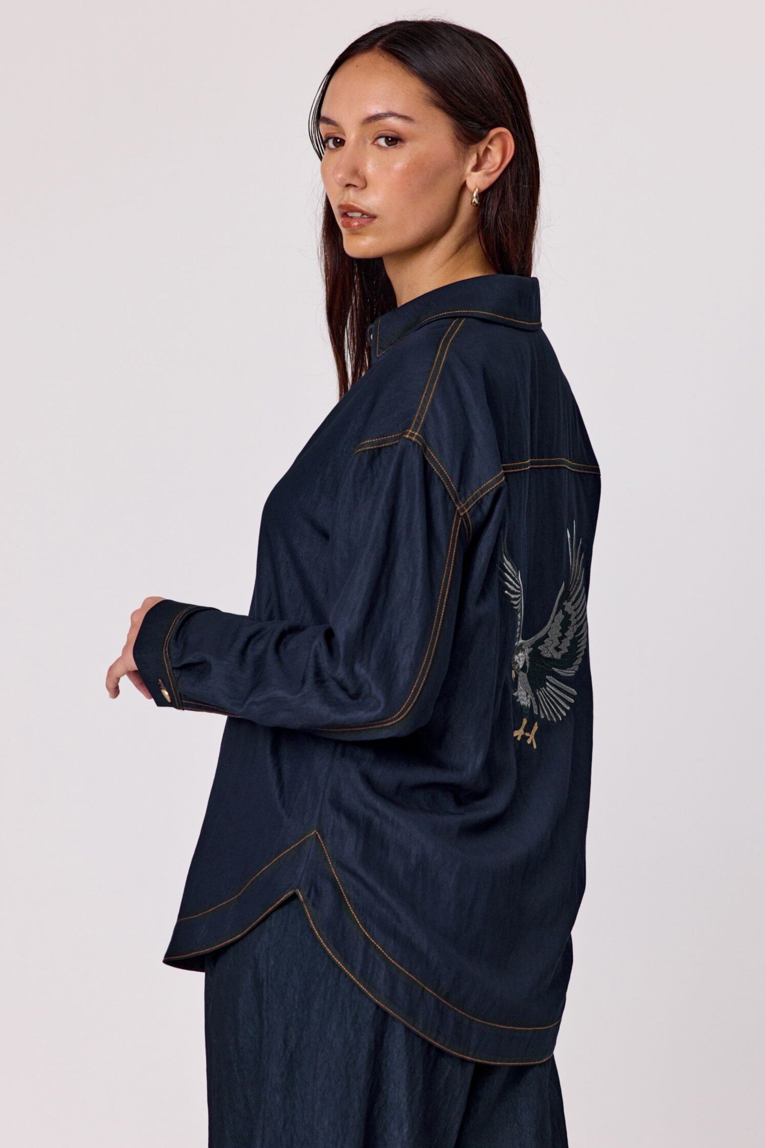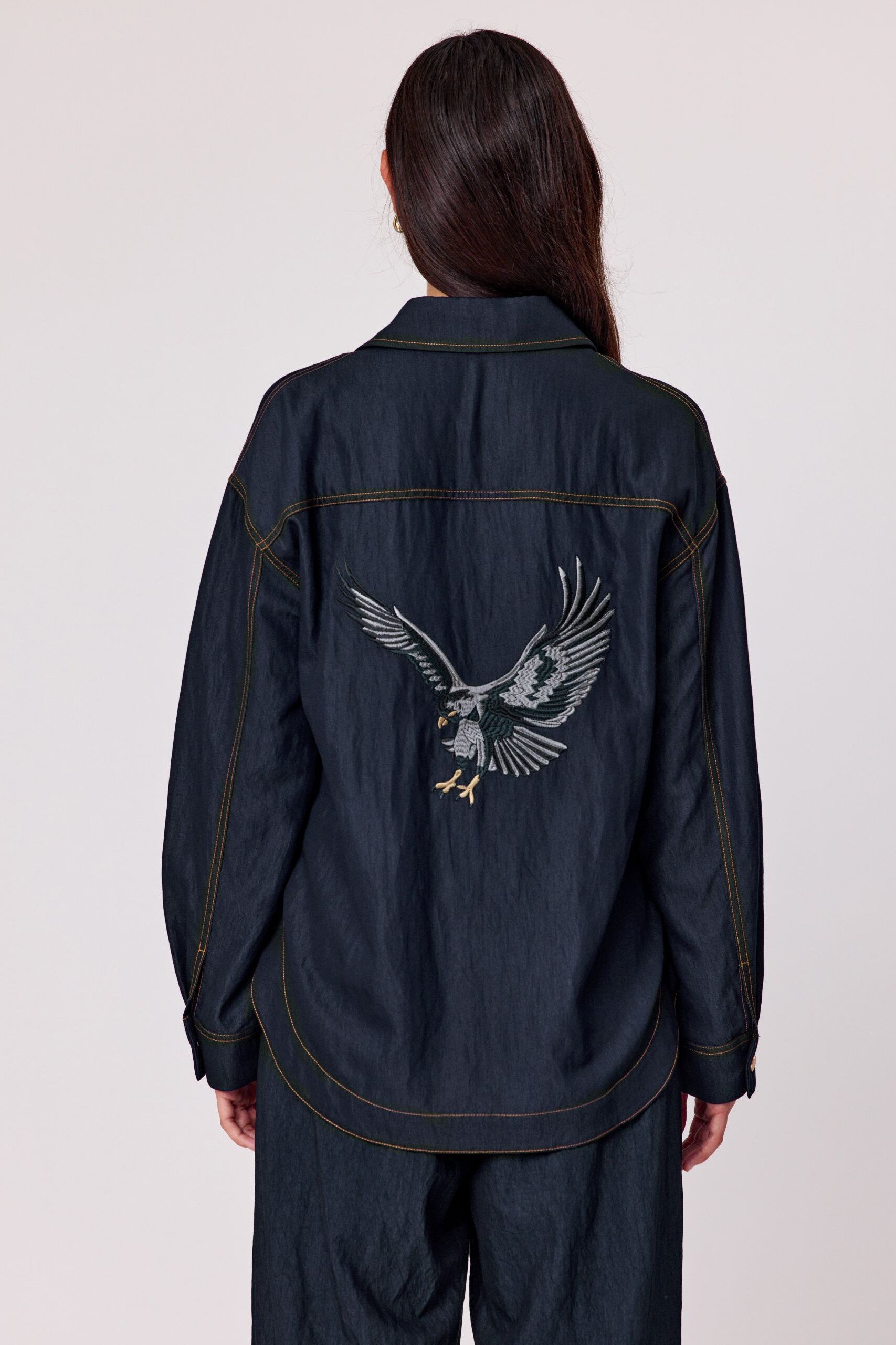 Add a touch of personality to your wardrobe with this indigo long-sleeved shirt, featuring a classic button-up front, structured collar, and standout back embroidery that brings a unique twist to a timeless style. Crafted from a sturdy, denim-look fabric and with embroidered detail on the back that adds just the right amount of flair.