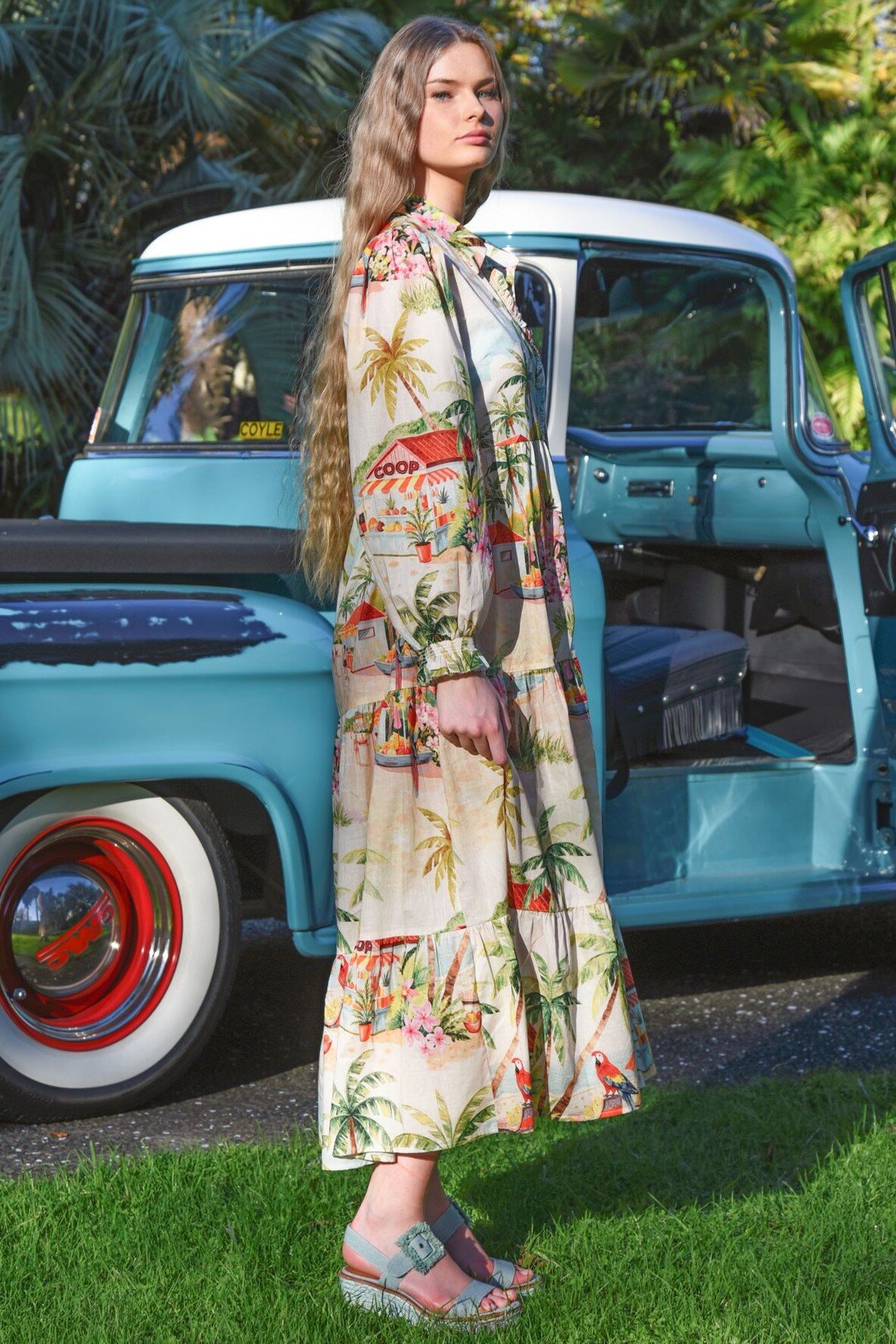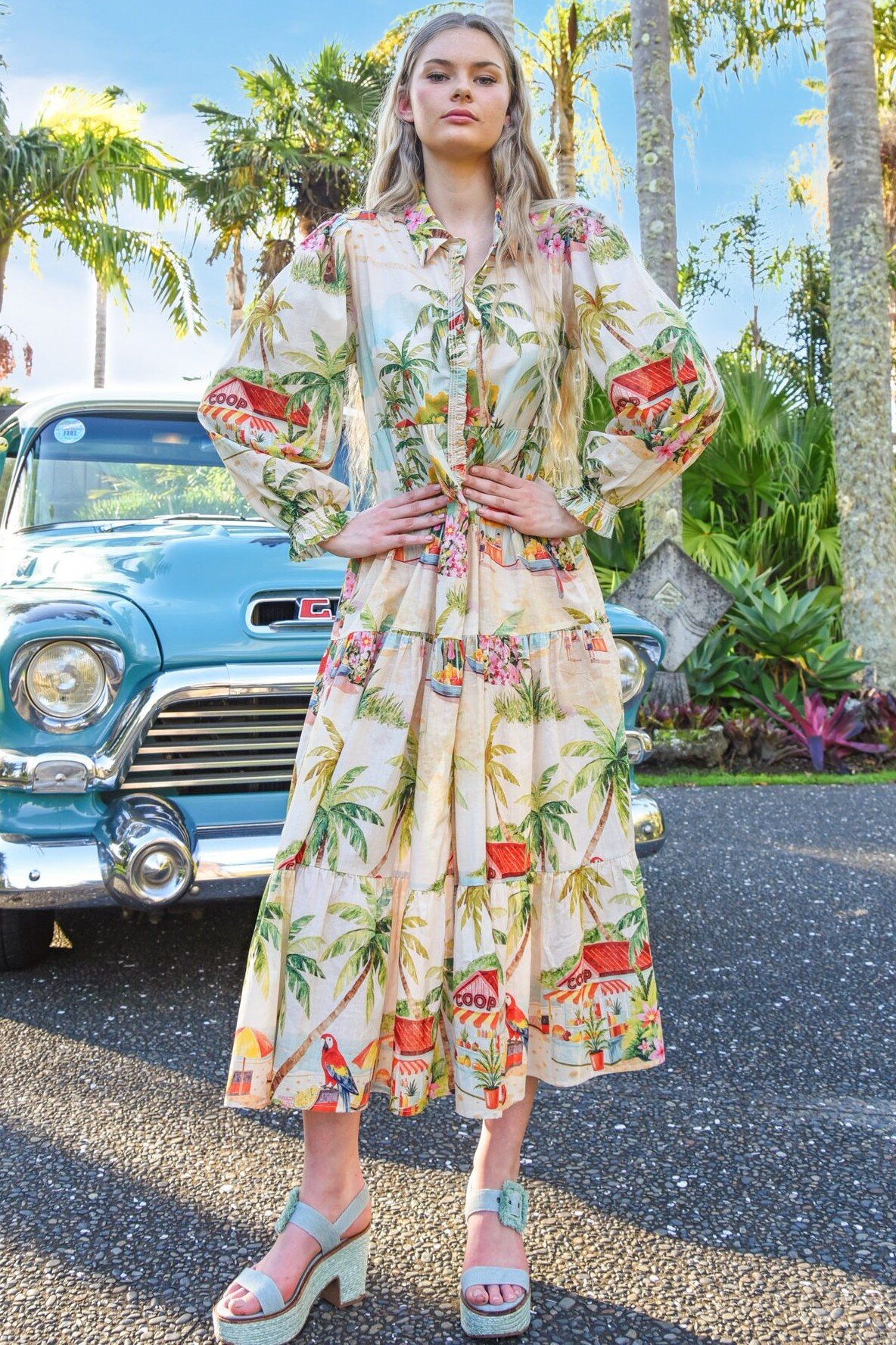 With a brand-new summer look, the ‘Picot-A-Boo’ dress is back this season. Crafted in the beach themed ‘Island Rewind’ cotton slub, this dress features a button through front with a ruffle trim placket, and a full tiered skirt creating soft and whimsical movement. A picot finished edge at the cuffs and button placket add a final intricate touch to this ever-wearable dress.