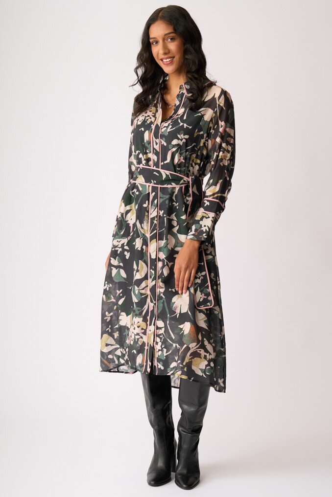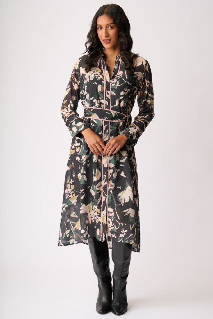 Contrast piping detail on collar, along the button placket, cuffs, shoulder seams, back yoke seam and on the outer edge of the belt