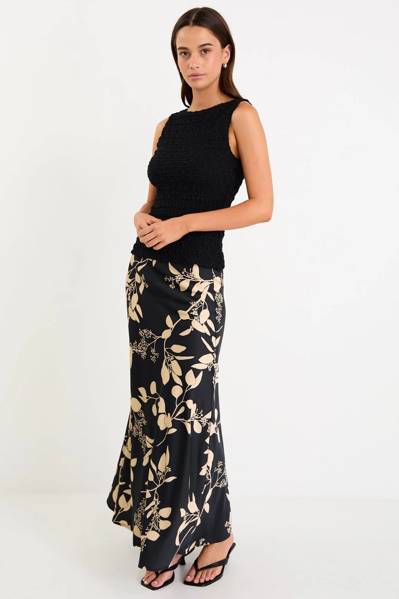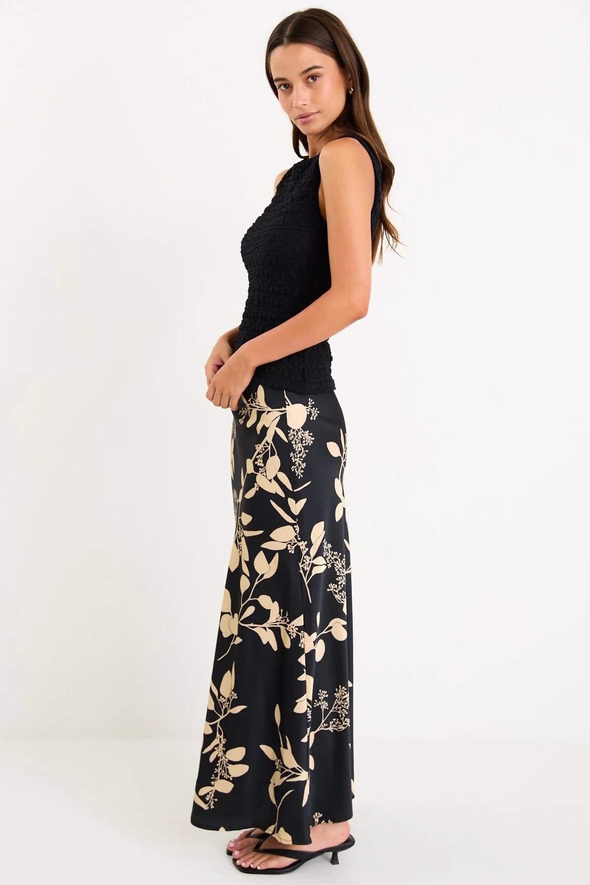 Designed with a soft bias cut, it skims the body without clinging and features an elegant black-and-beige floral print that instantly elevates your everyday looks.
