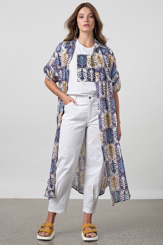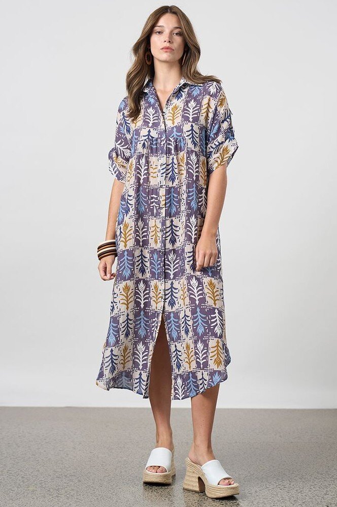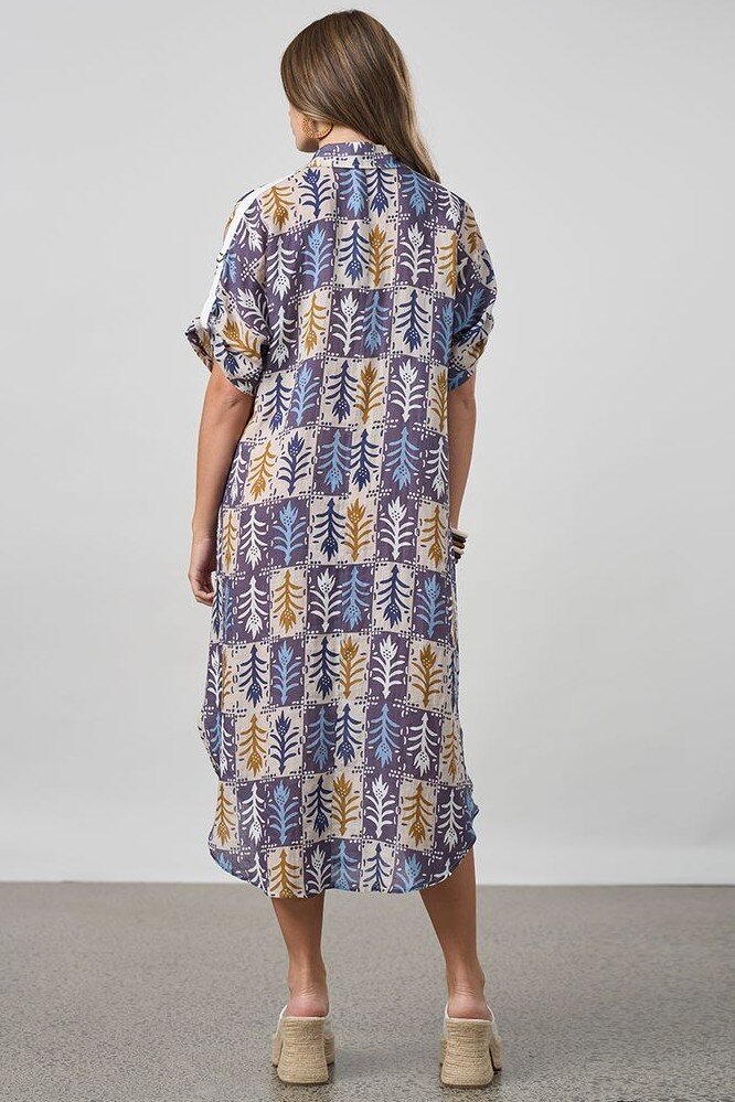 Button-through dress with a rounded hem and side splits, with under bust gathering for soft fullness. Featuring contrast overarm tape and D-rings for adjustable, grown on sleeves.
