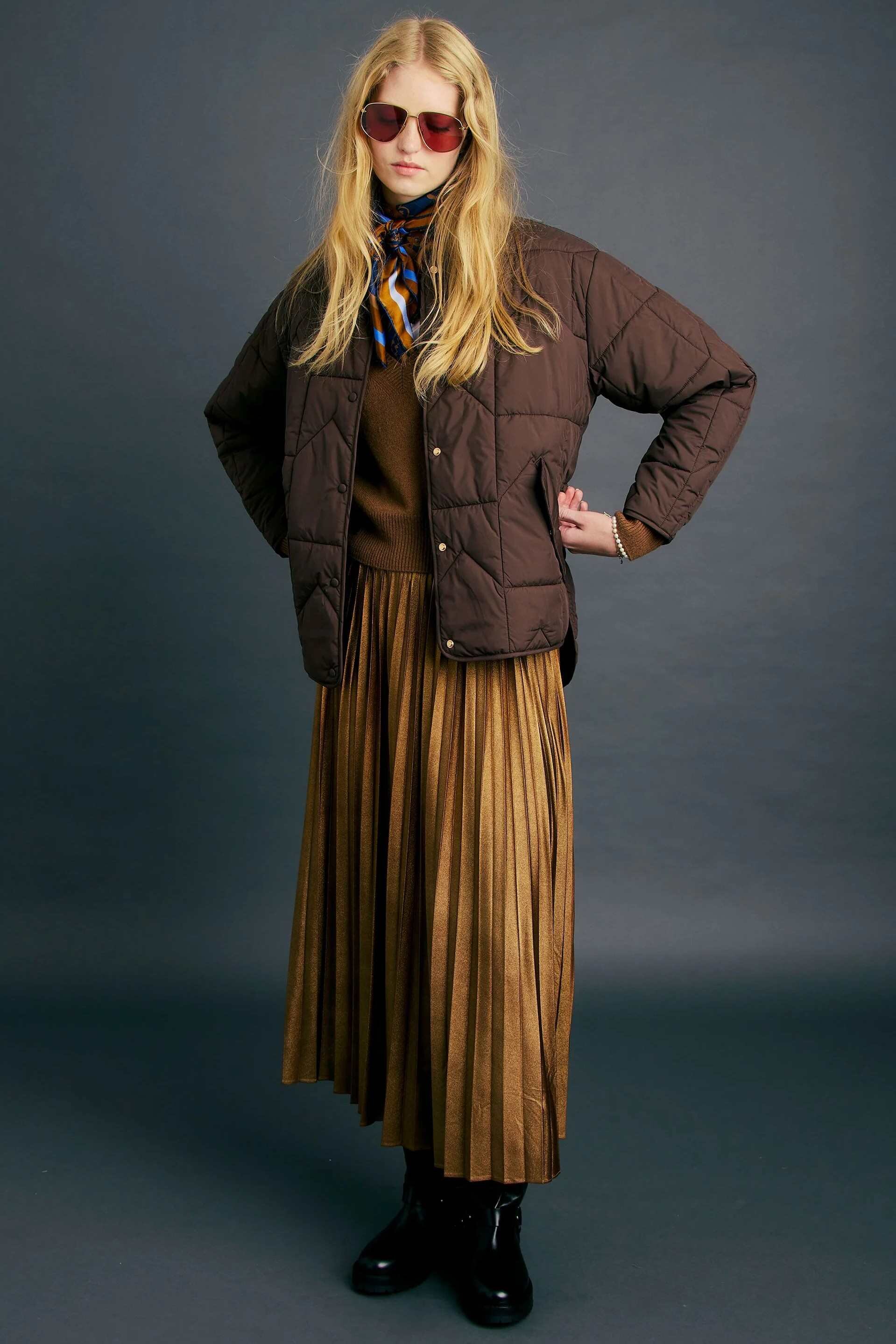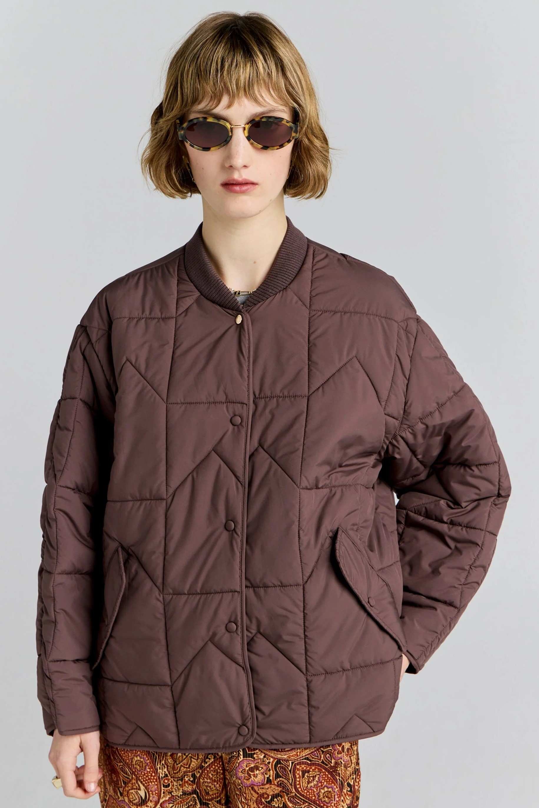 Quilted with the signature KW monogram pattern, the Quilted Monogram Jacket balances comfort with a refined, modern edge. Crafted from a lightweight layer with a vegan padded fill, it offers warmth without bulk – making it an easy layer across seasons. The relaxed silhouette is finished with a ribbed collar, snap-front closure, and contemporary curved hem with bound edges. Functional patch envelope pockets feature at the front, while the brown Runaway Girl stamp at the back completes the design with a subtle brand signature.
