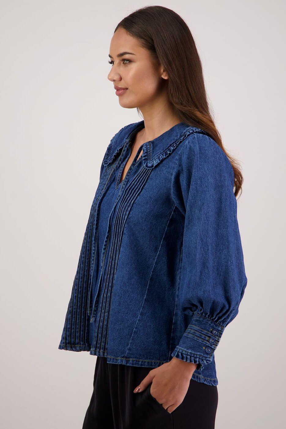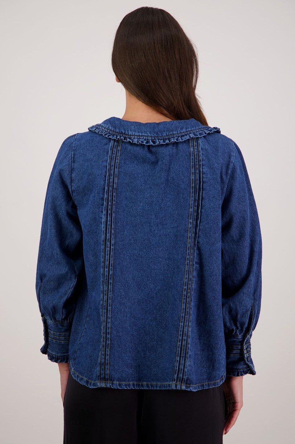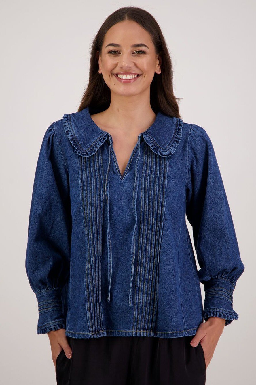 Crafted from 100% cotton denim, the Redmond Shirt is a modern take on classic detailing. Delicate pin tucks add subtle texture, while the shaped collar is finished with a soft ruffle and tie for a feminine touch. Full-length sleeves with pin-tucked, buttoned cuffs complete the look- effortlessly polished yet easy to wear.